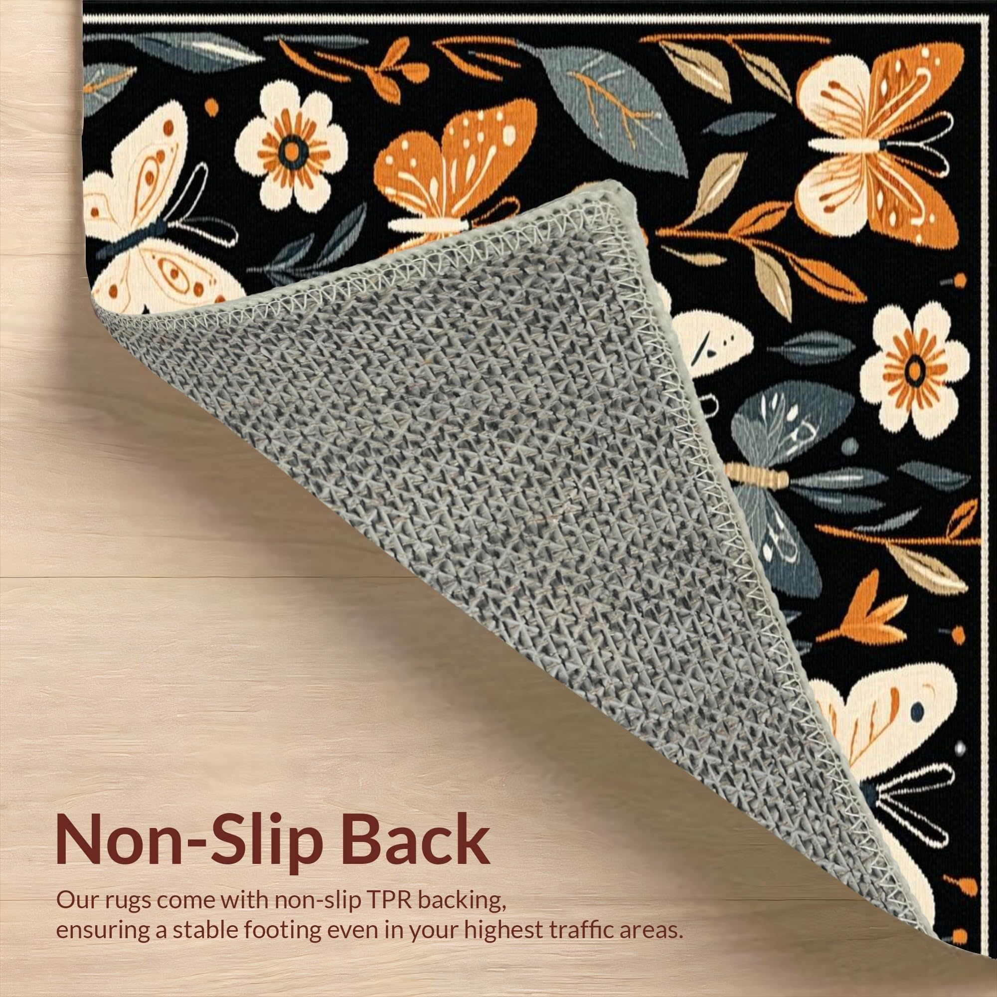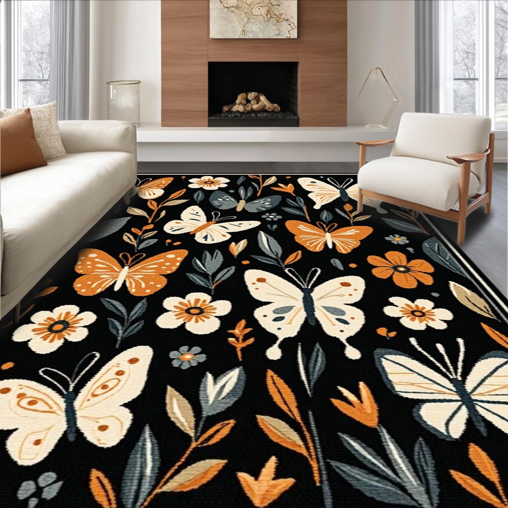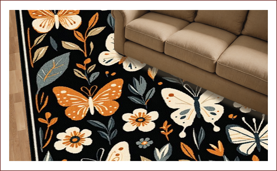 Ultra Soft Area Rug, Non Slip, Stain Resistant, Washable Area Rugs for Living Room, Bedroom, Elegant Floral-Insect Hybrid Design(Black) Overview: