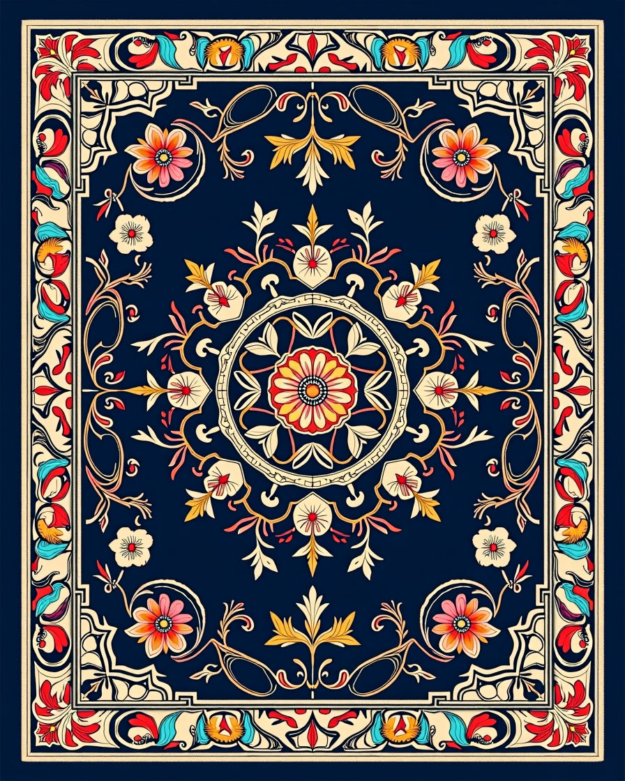Elegant Floral Medallion With Interlocking Vines And Petals(Navy)