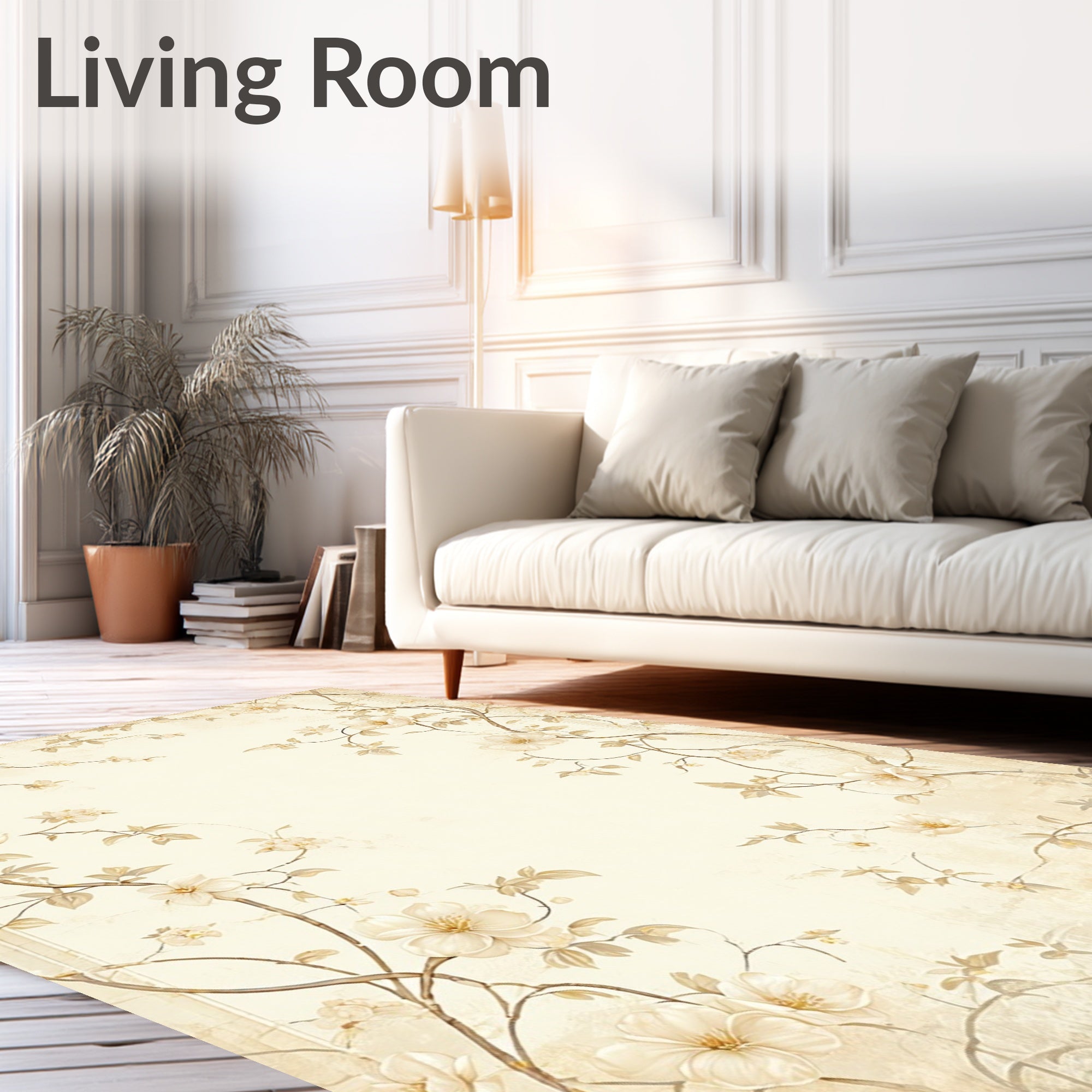 Ultra Soft Area Rug, Non Slip, Stain Resistant, Washable Area Rugs for Living Room, Bedroom, Elegant Floral with Non Slip Backing and Delicate Beige Blossoms(Beige) Overview: