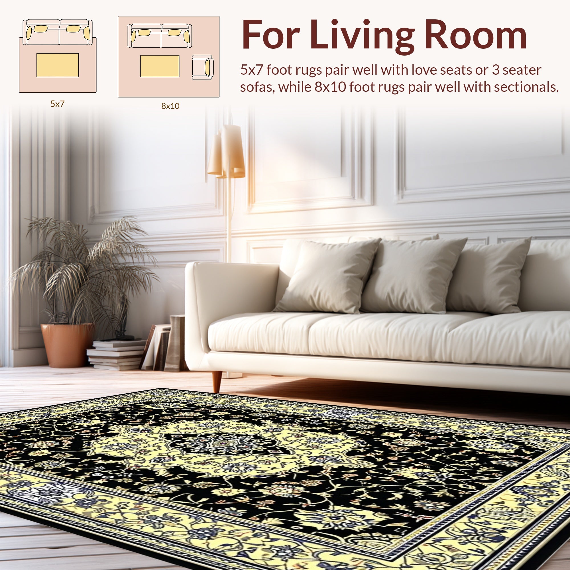 Flatwoven High Traffic Area Rug, Elegant French Classic Symmetrical, Non Slip, Stain Resistant, Washable Area Rugs for Living Room, Bedroom (Black) Overview: