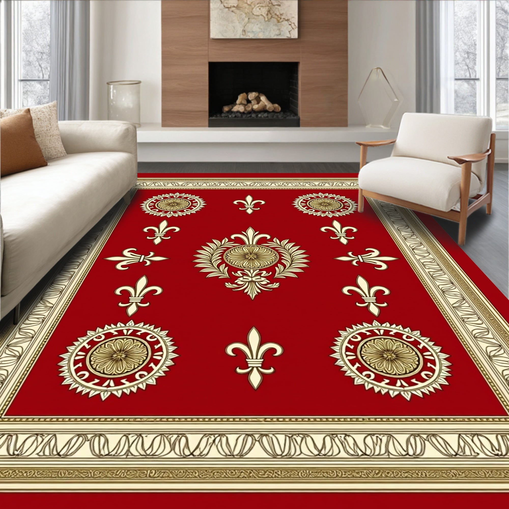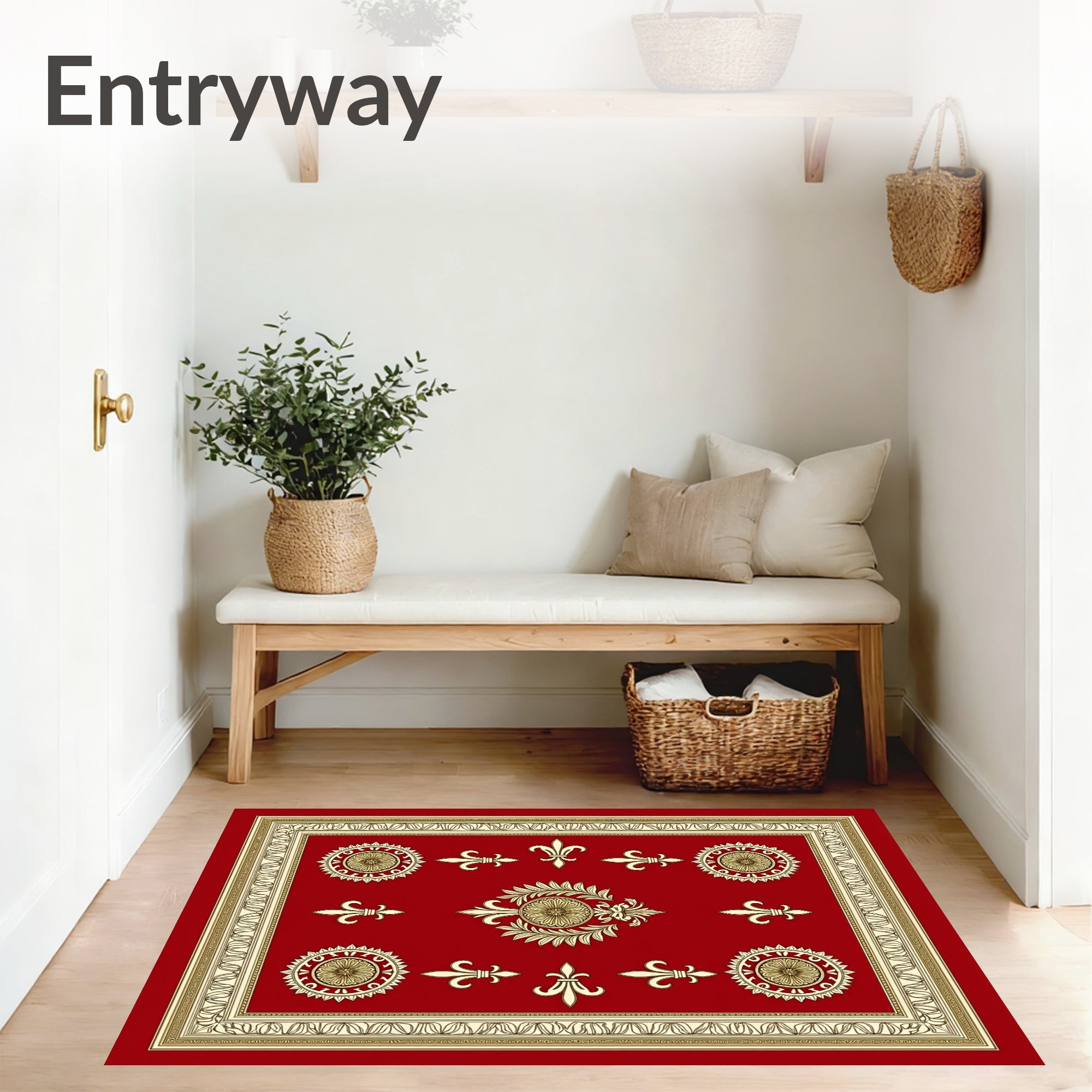 Ultra Soft Area Rug, Non Slip, Stain Resistant, Washable Area Rugs for Living Room, Bedroom, Elegant Heraldic Crest with Ornate Fleur de Accents(Red) Overview: