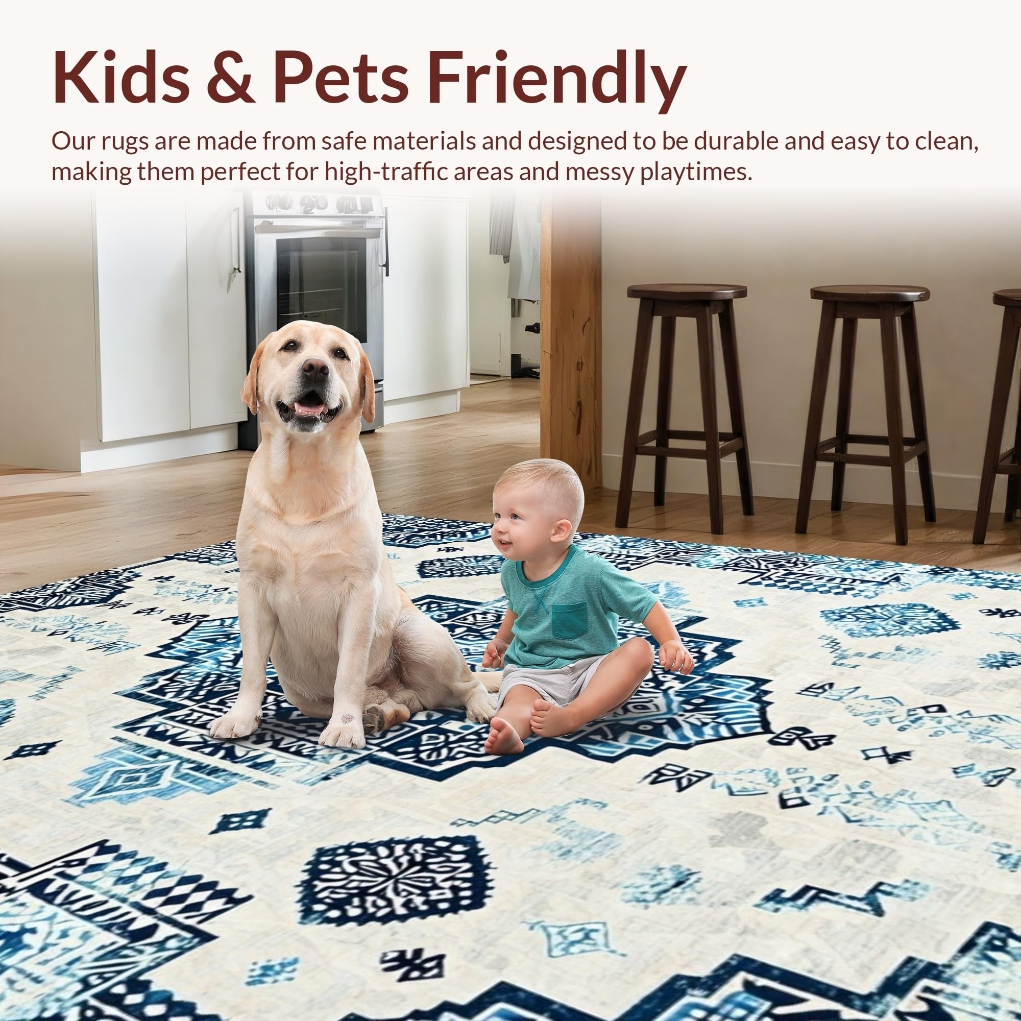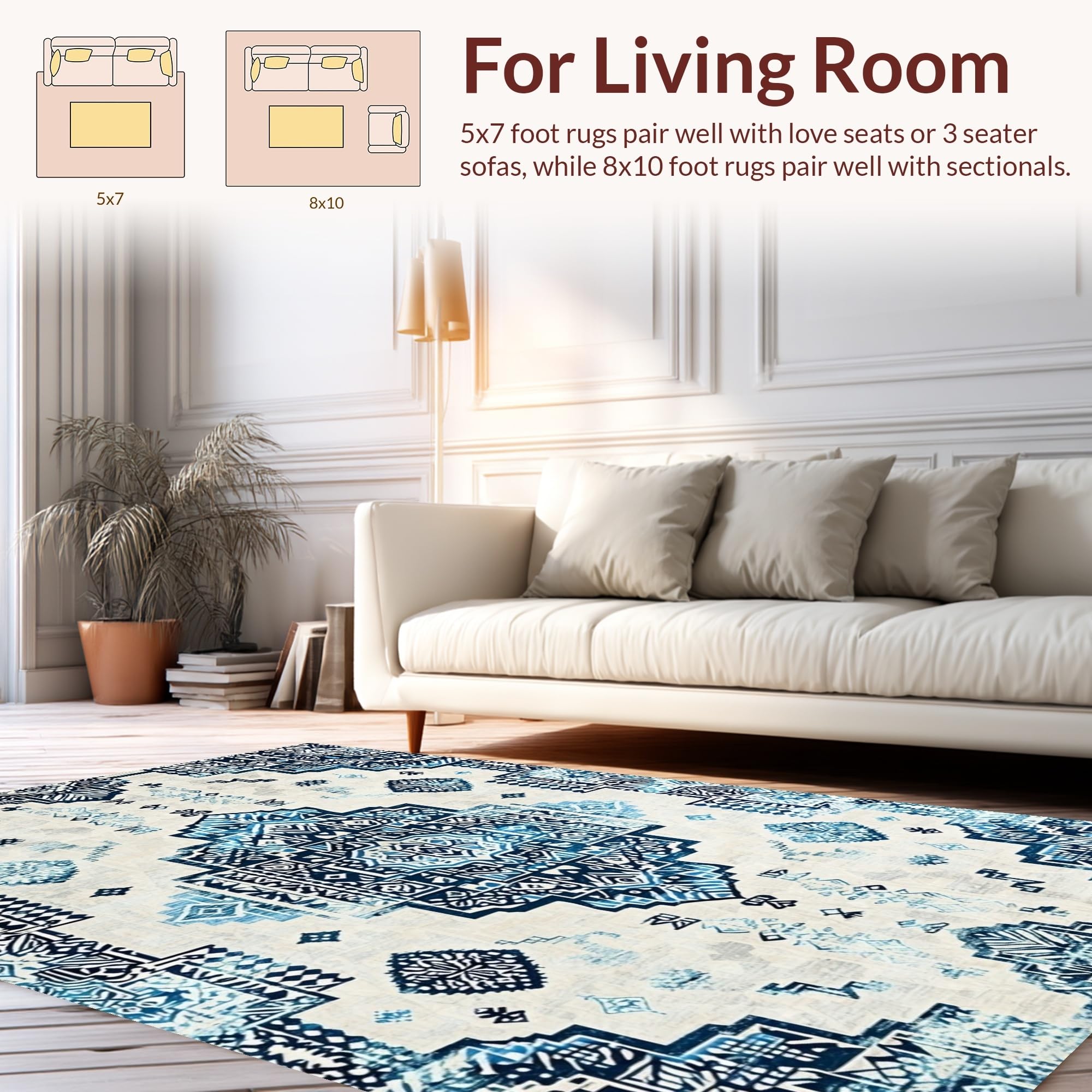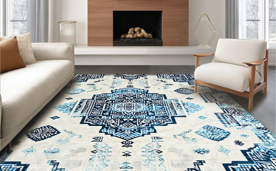 Ultra Soft Area Rug, Non Slip, Stain Resistant, Washable Area Rugs for Living Room, Bedroom, Elegant Ivory Blue Abstract Design(Beige) Overview: