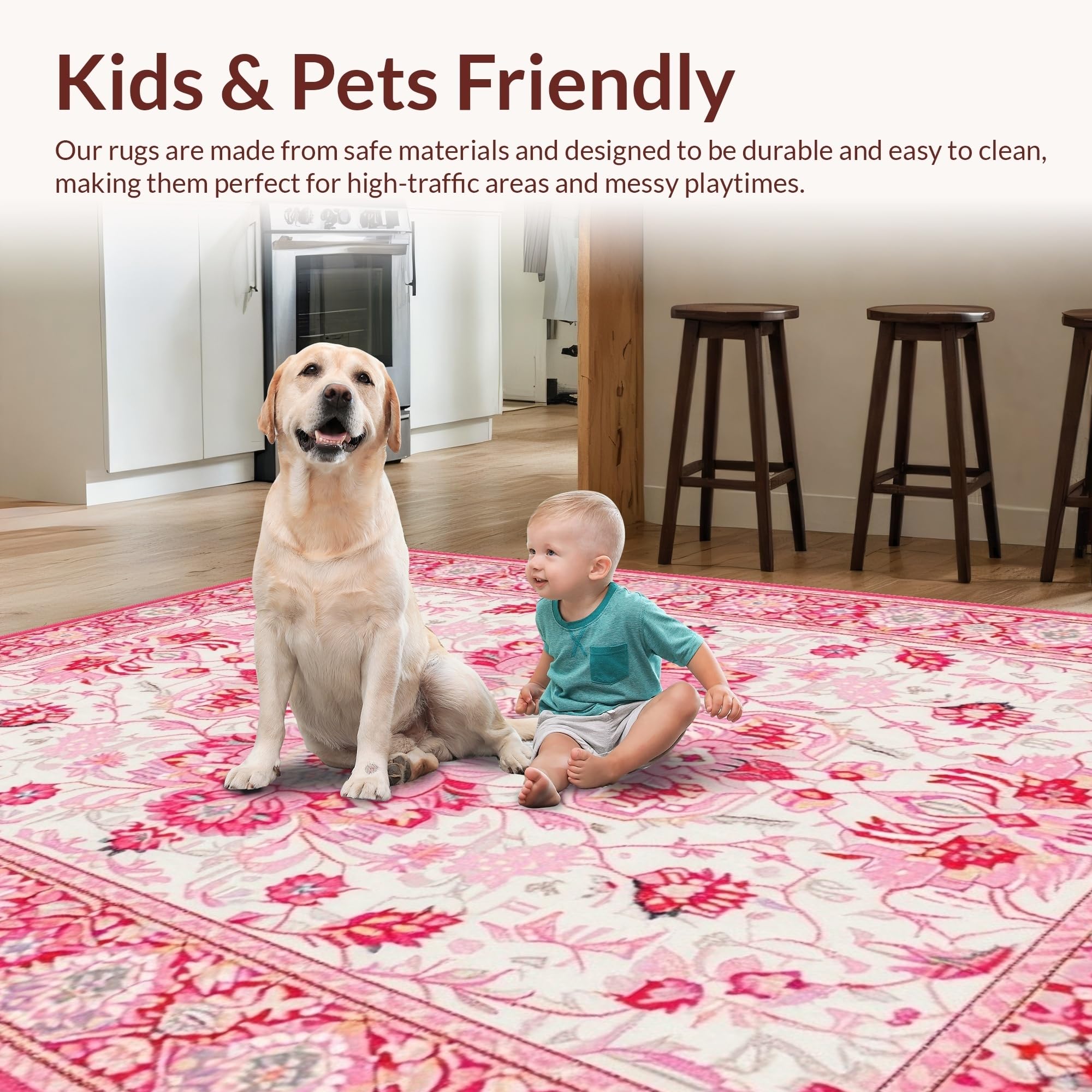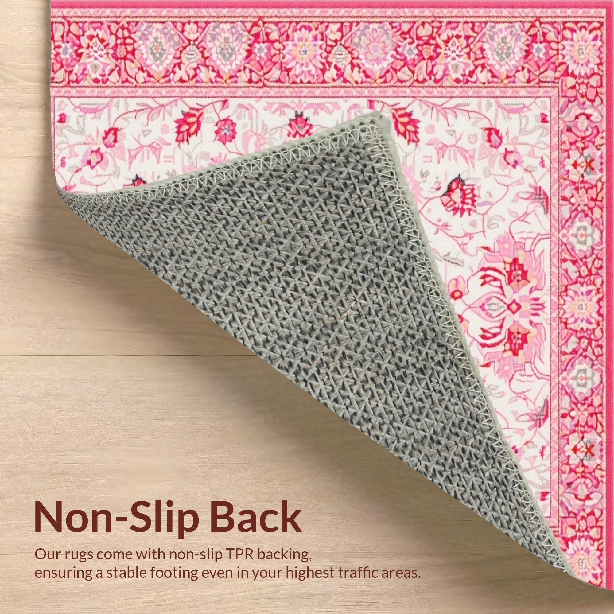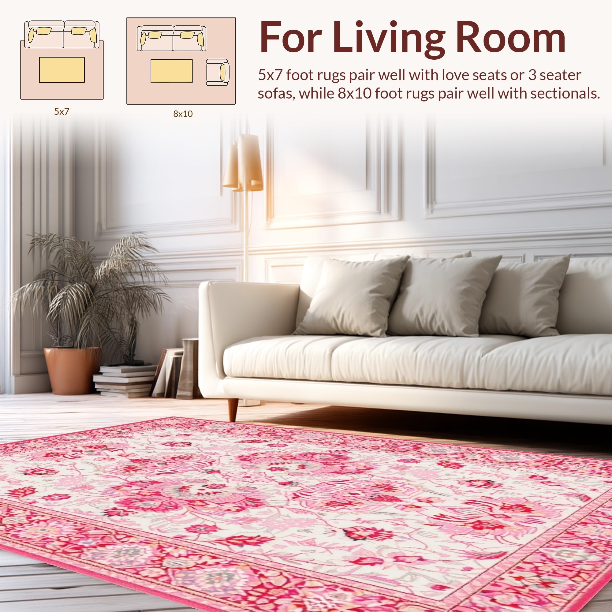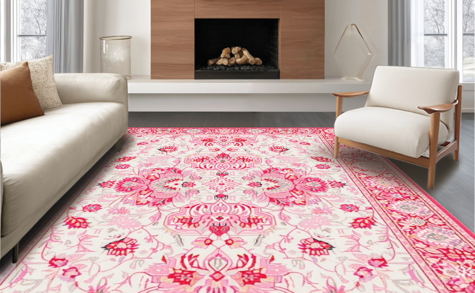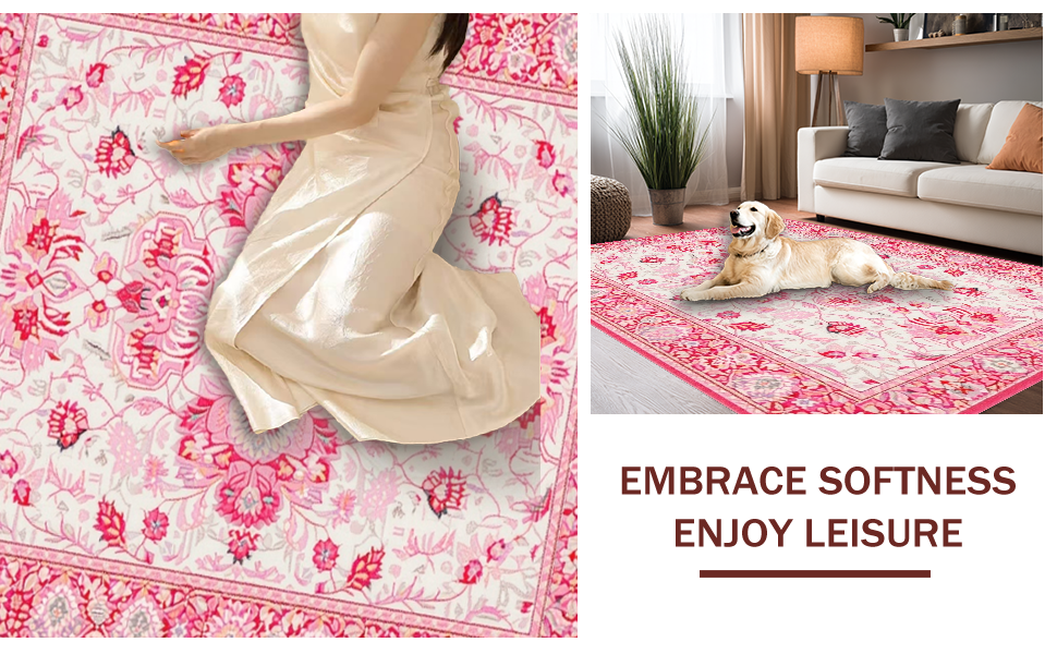 Ultra Soft Area Rug, Non Slip, Stain Resistant, Washable Area Rugs for Living Room, Bedroom, Elegant Low-Pile Flower Motif(Pink) Overview: