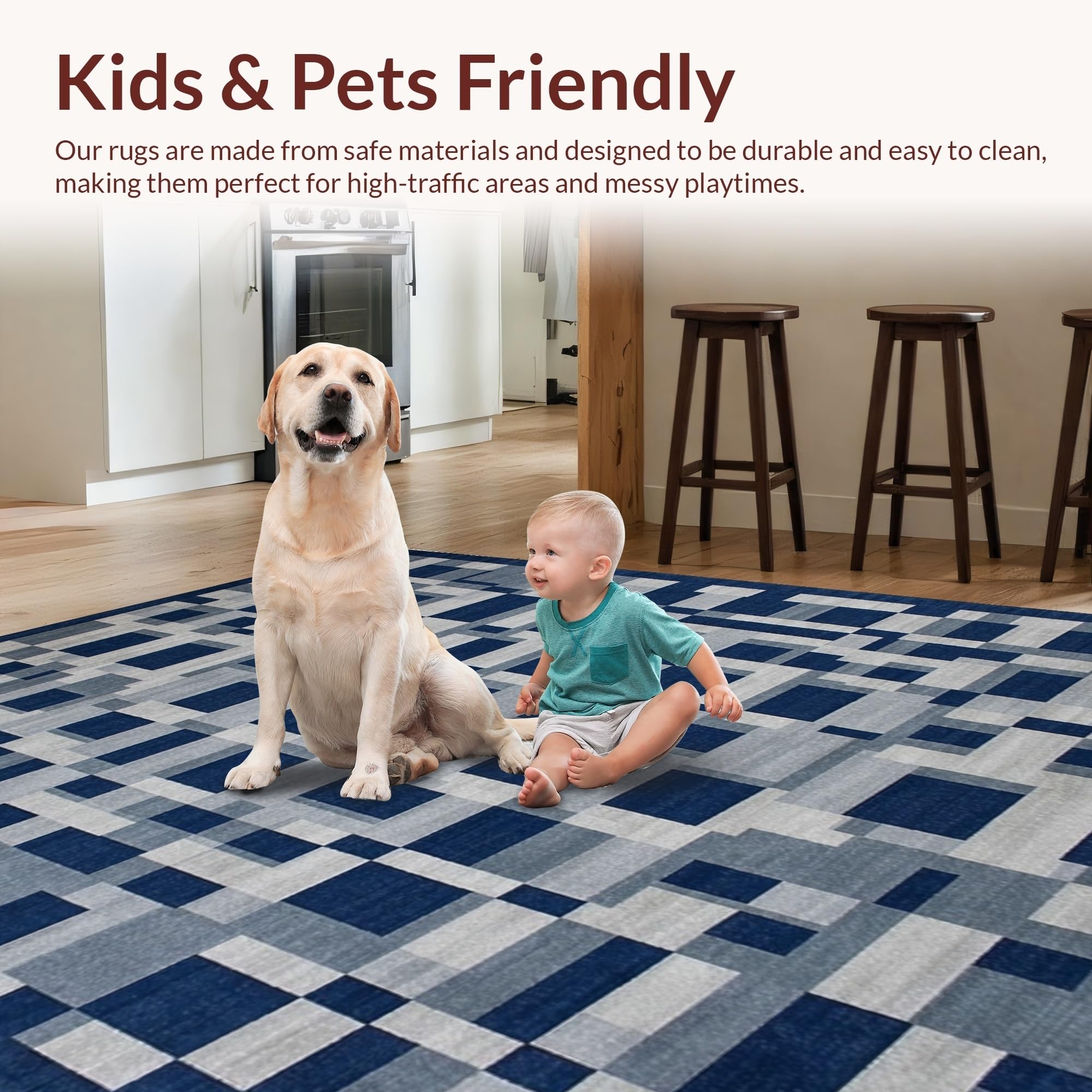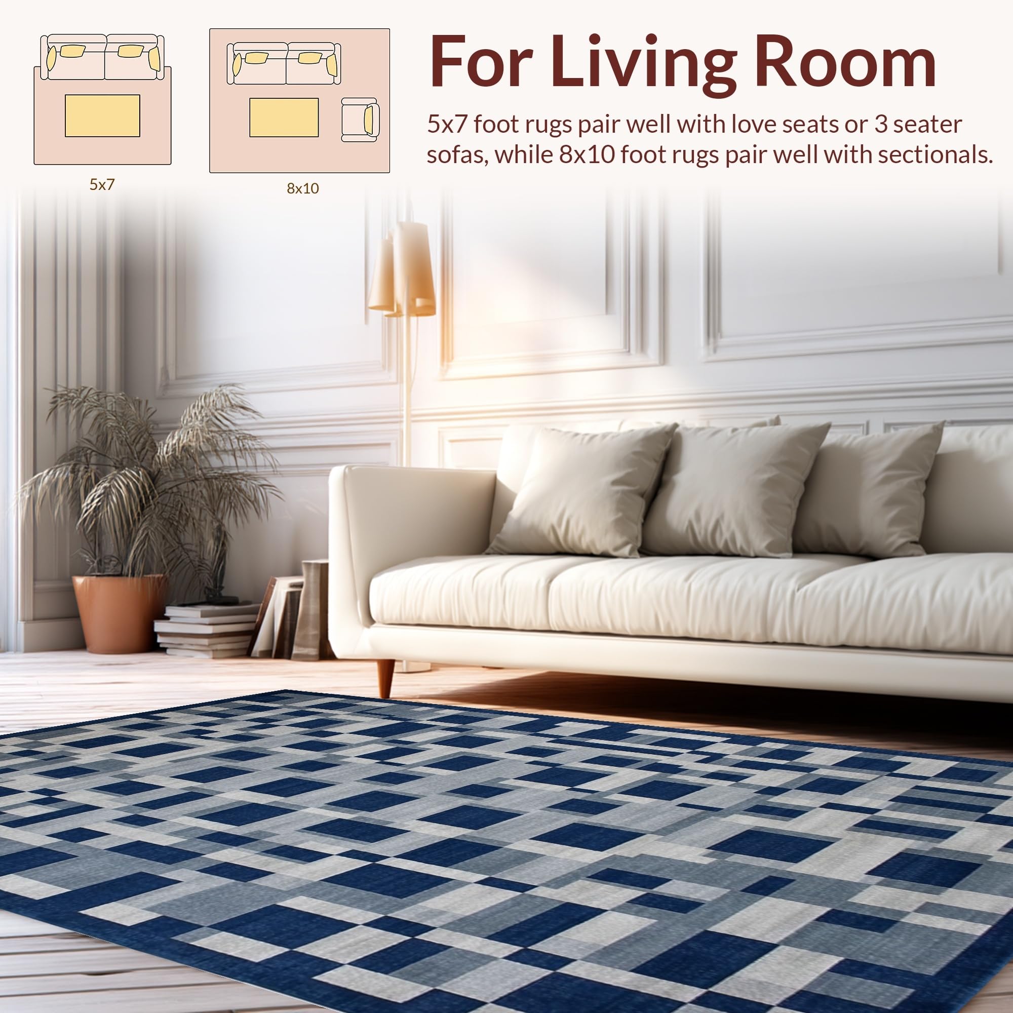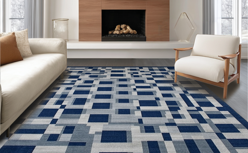 Ultra Soft Area Rug, Non Slip, Stain Resistant, Washable Area Rugs for Living Room, Bedroom, Elegant Modern Box Design(Blue) Overview: