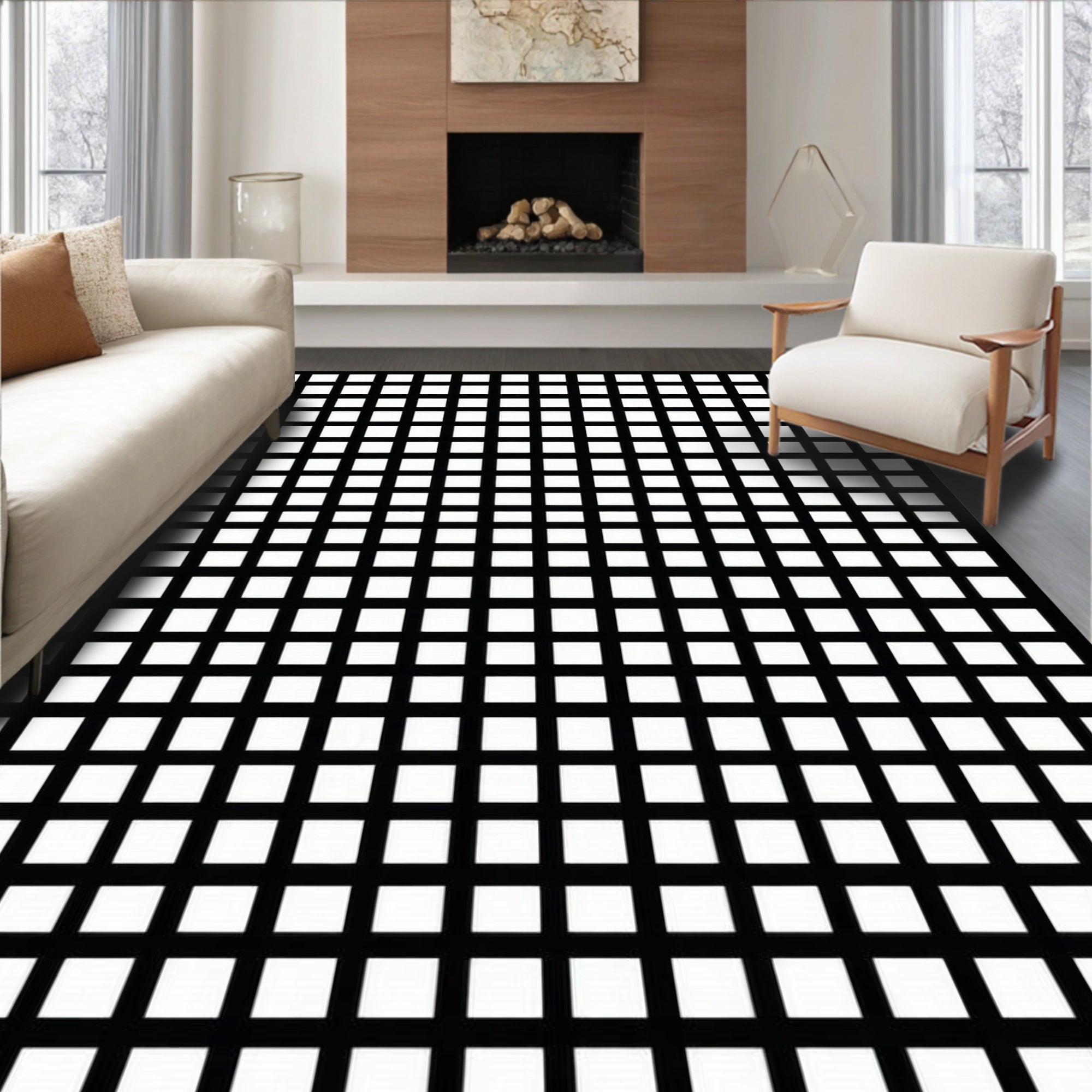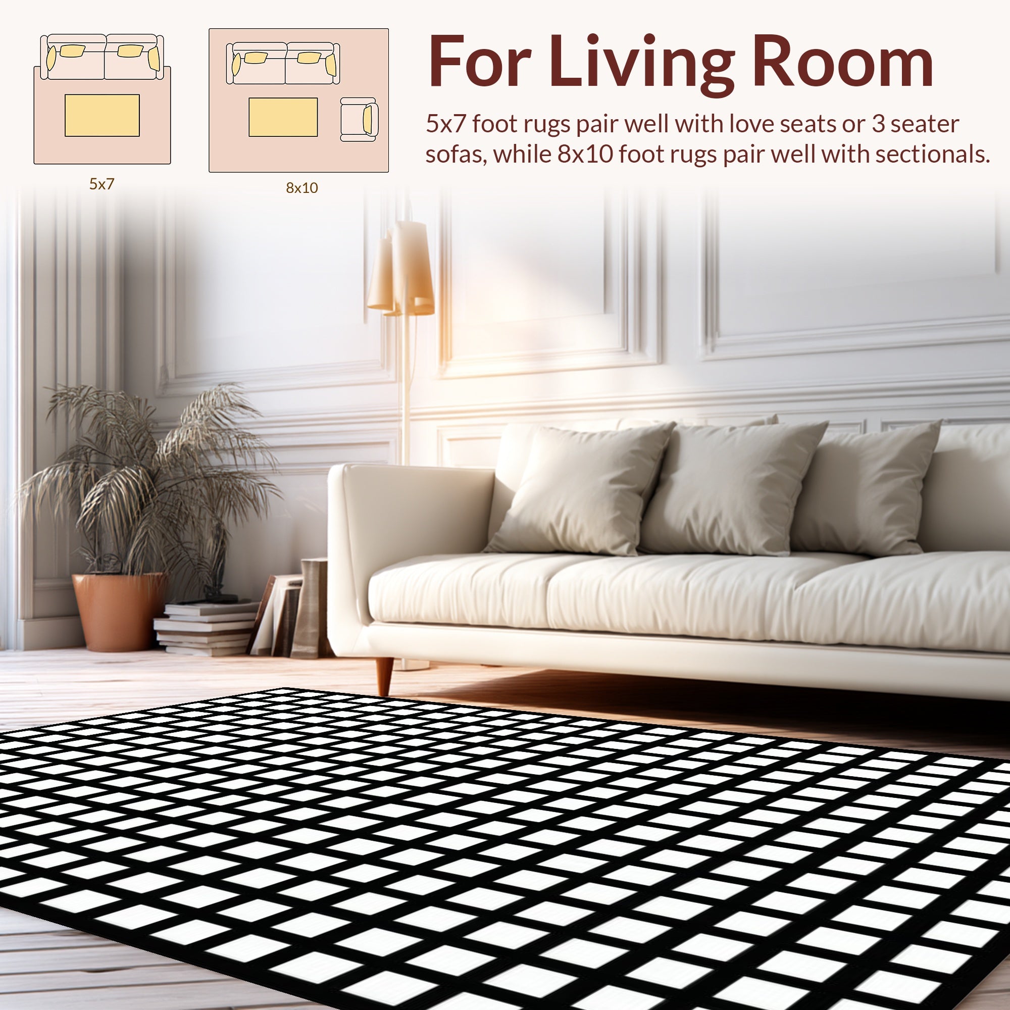 Flatwoven High Traffic Area Rug, Elegant Monochrome Checkerboard Aesthetic, Non Slip, Stain Resistant, Washable Area Rugs for Living Room, Bedroom (Black) Overview: