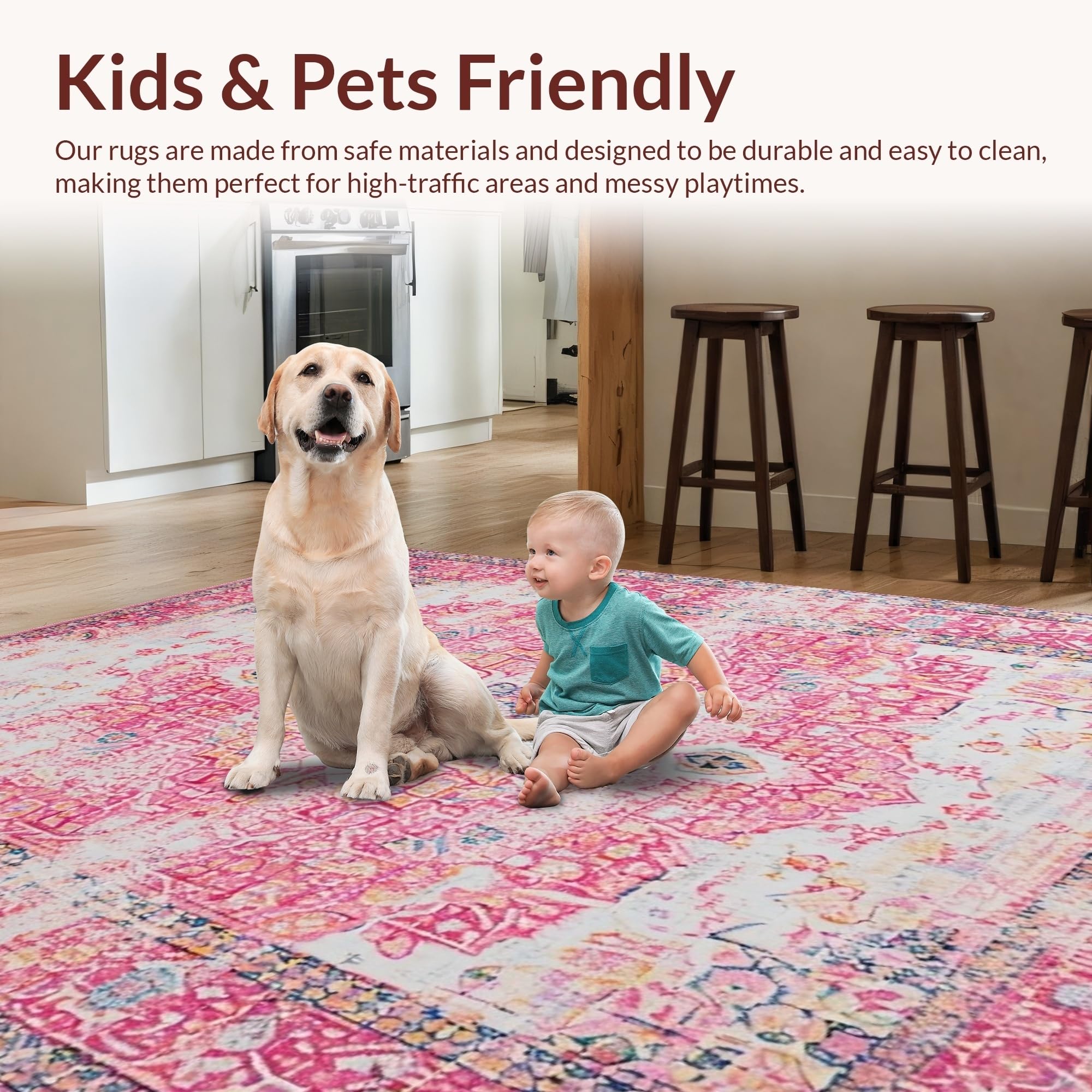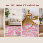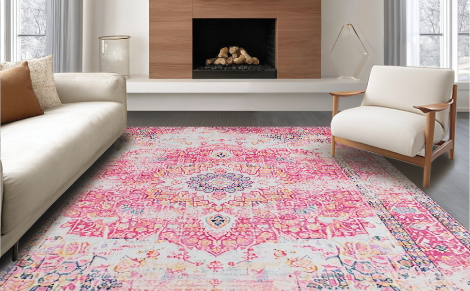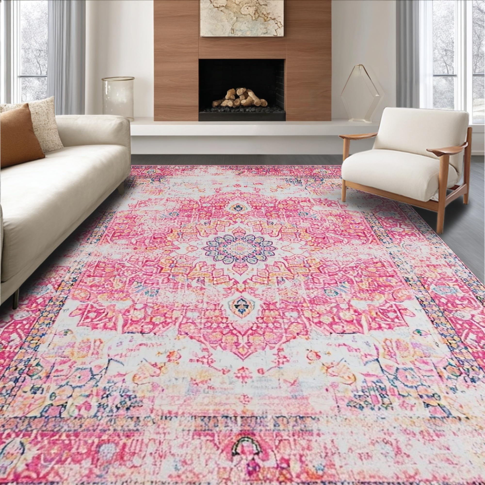 Ultra Soft Area Rug, Non Slip, Stain Resistant, Washable Area Rugs for Living Room, Bedroom, Elegant Muted Medallion Texture Vibe(Pink) Overview: