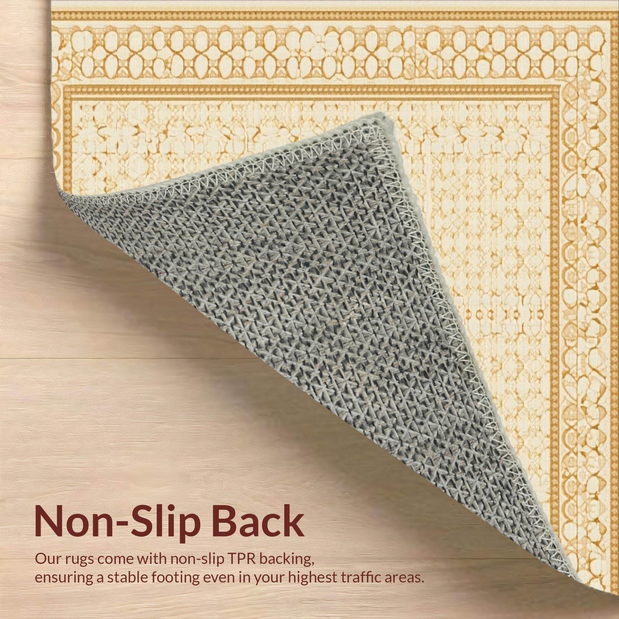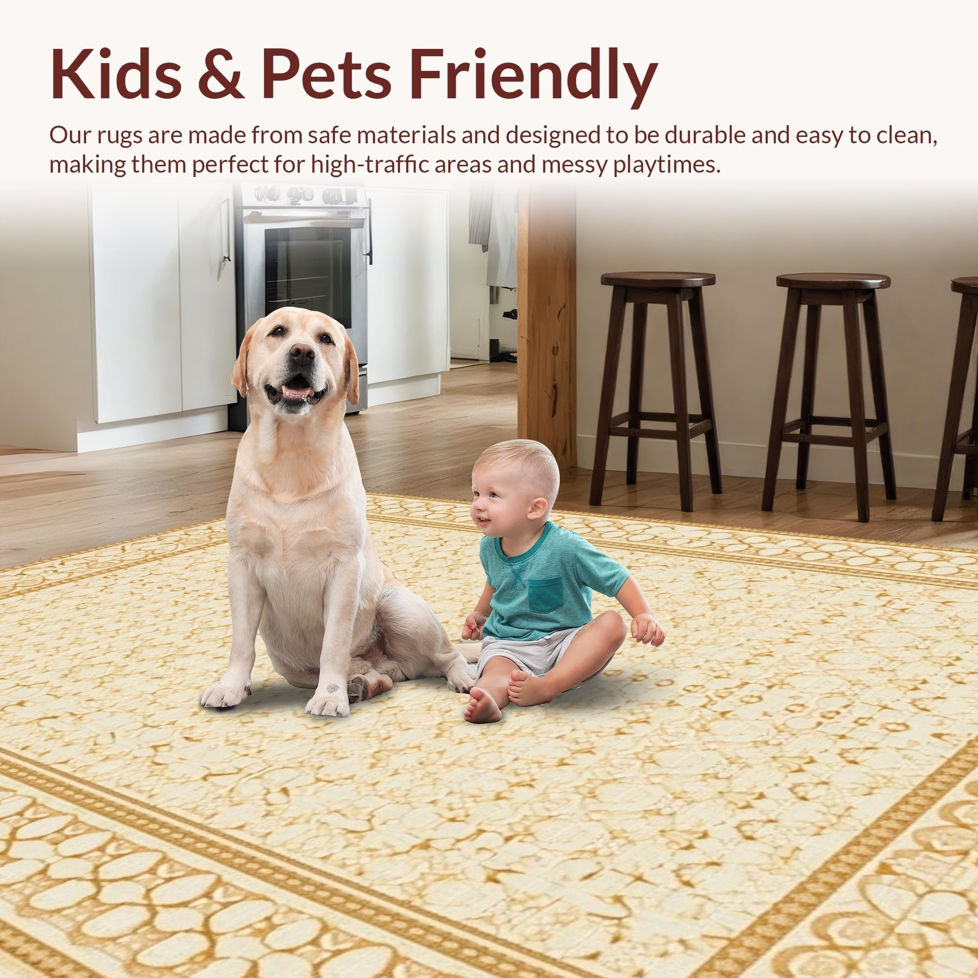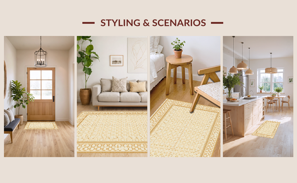 Ultra Soft Area Rug, Non Slip, Stain Resistant, Washable Area Rugs for Living Room, Bedroom, Elegant Scalloped Border Rustic Vibe(Beige) Overview: