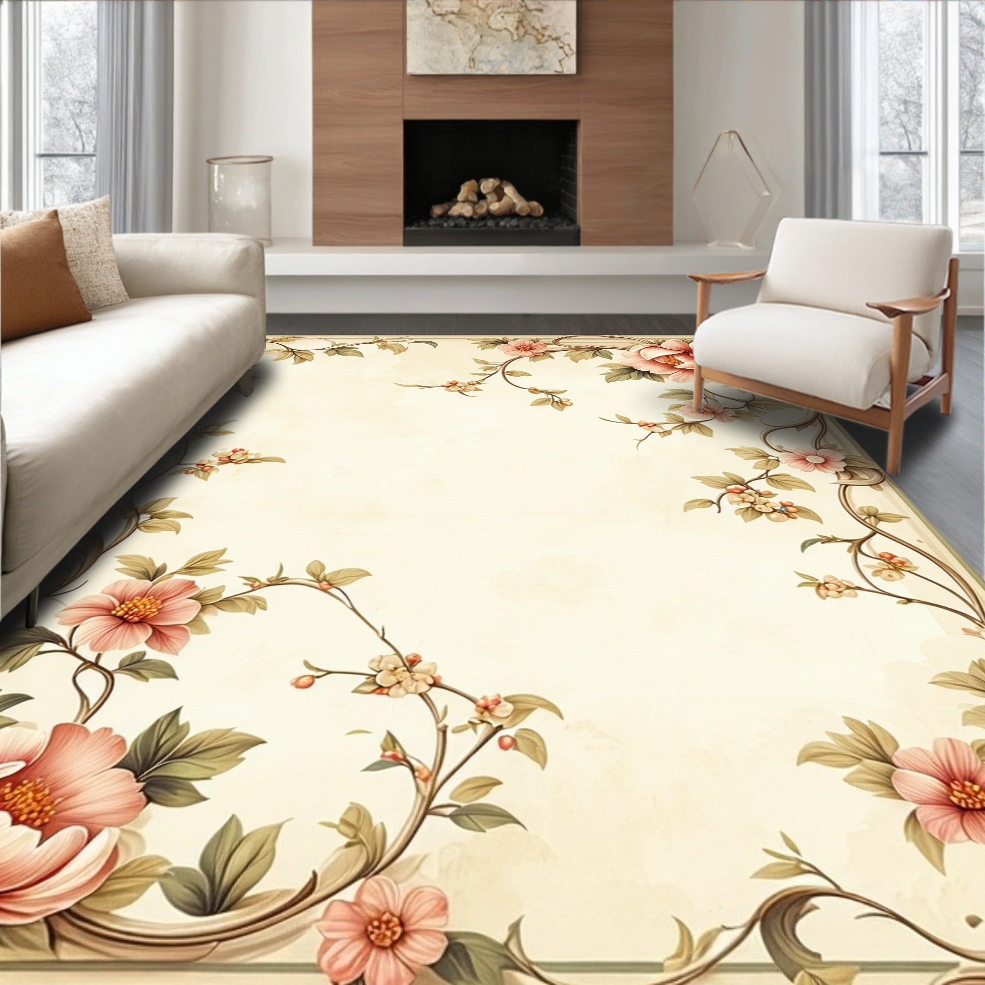 Flatwoven High Traffic Area Rug, Elegant Scrollwork with Subdued Beige Tones and Garden Detailing, Non Slip, Stain Resistant, Washable Area Rugs for Living Room, Bedroom (Beige) Overview: