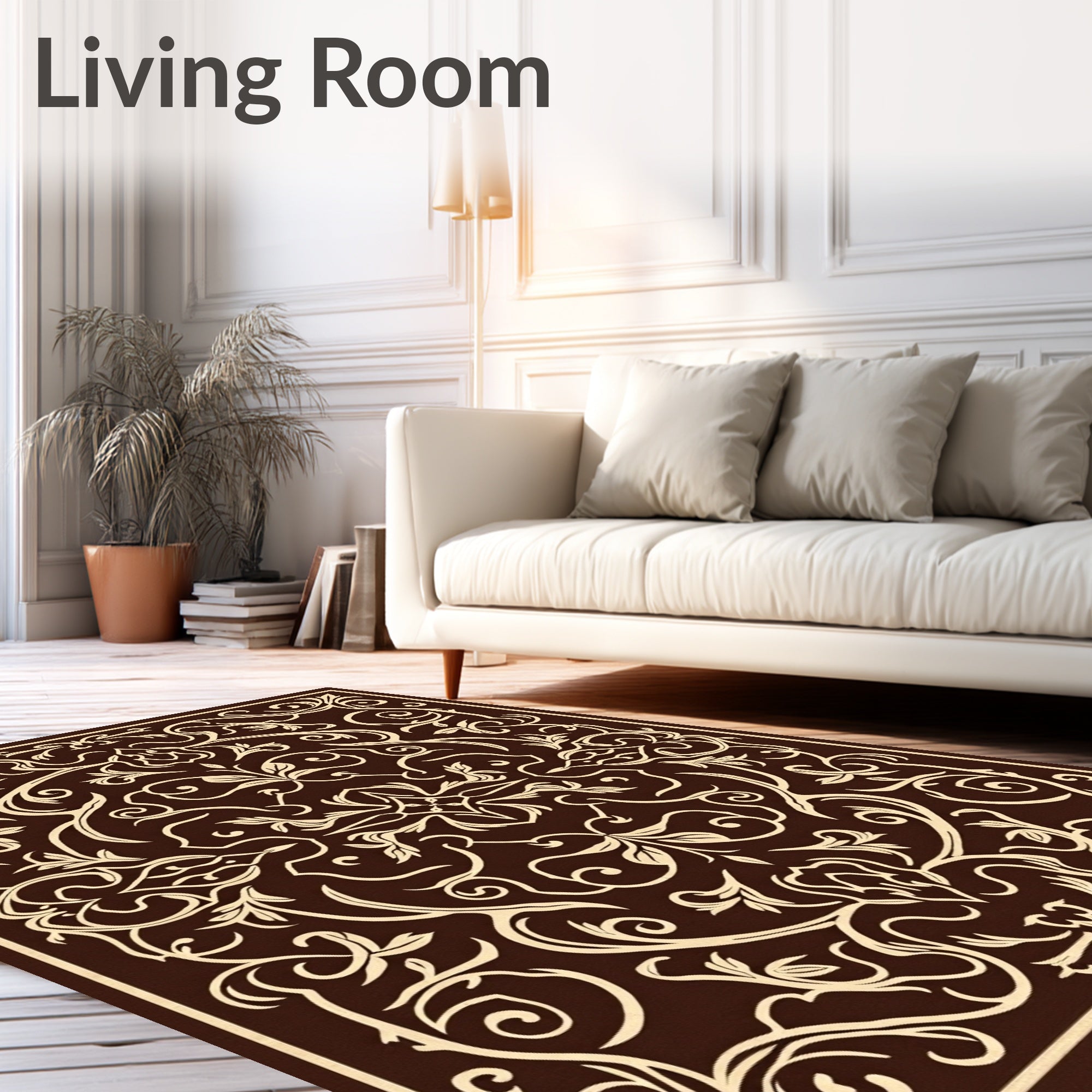 Flatwoven High Traffic Area Rug, Elegant Swirling Botanical Damask Curved Leaf Motif, Non Slip, Stain Resistant, Washable Area Rugs for Living Room, Bedroom (Brown) Overview: