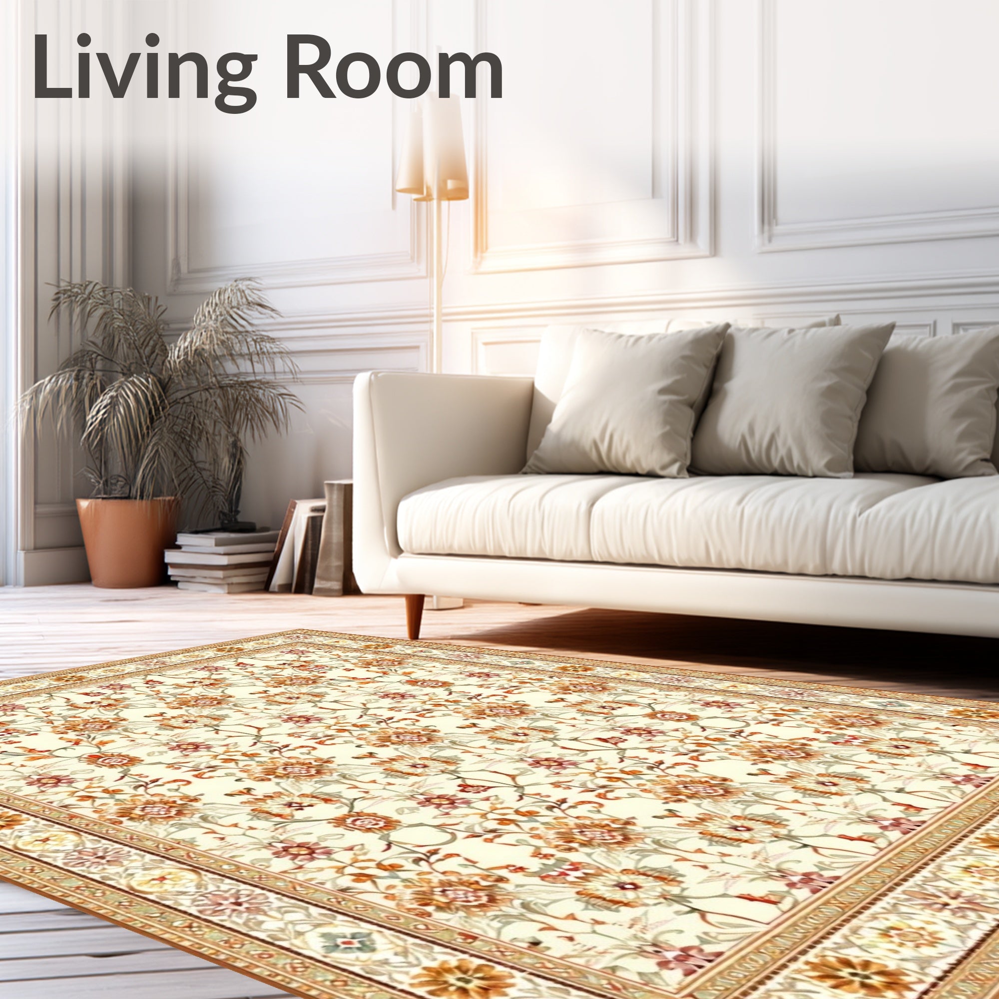 Ultra Soft Area Rug, Non Slip, Stain Resistant, Washable Area Rugs for Living Room, Bedroom, Elegant Tan with Ornate Floral Medallions and Classic Boho Flair(Ivory) Overview: