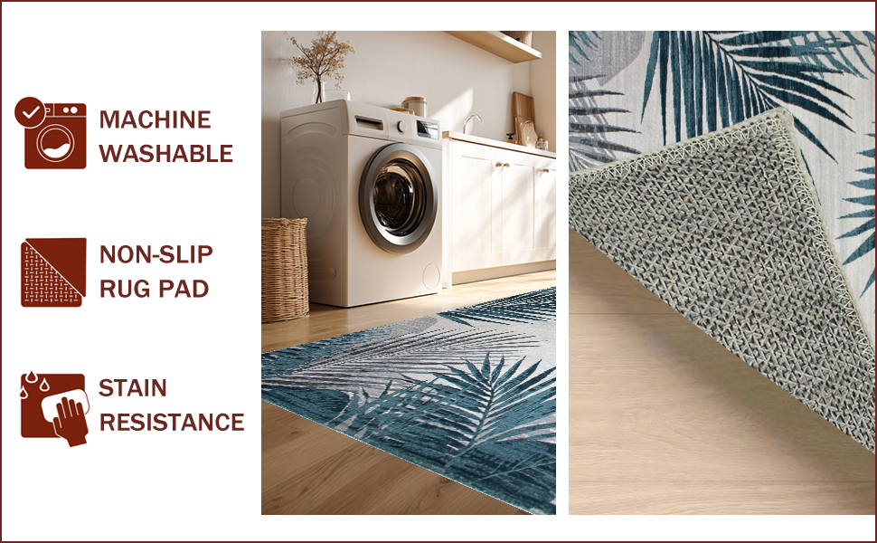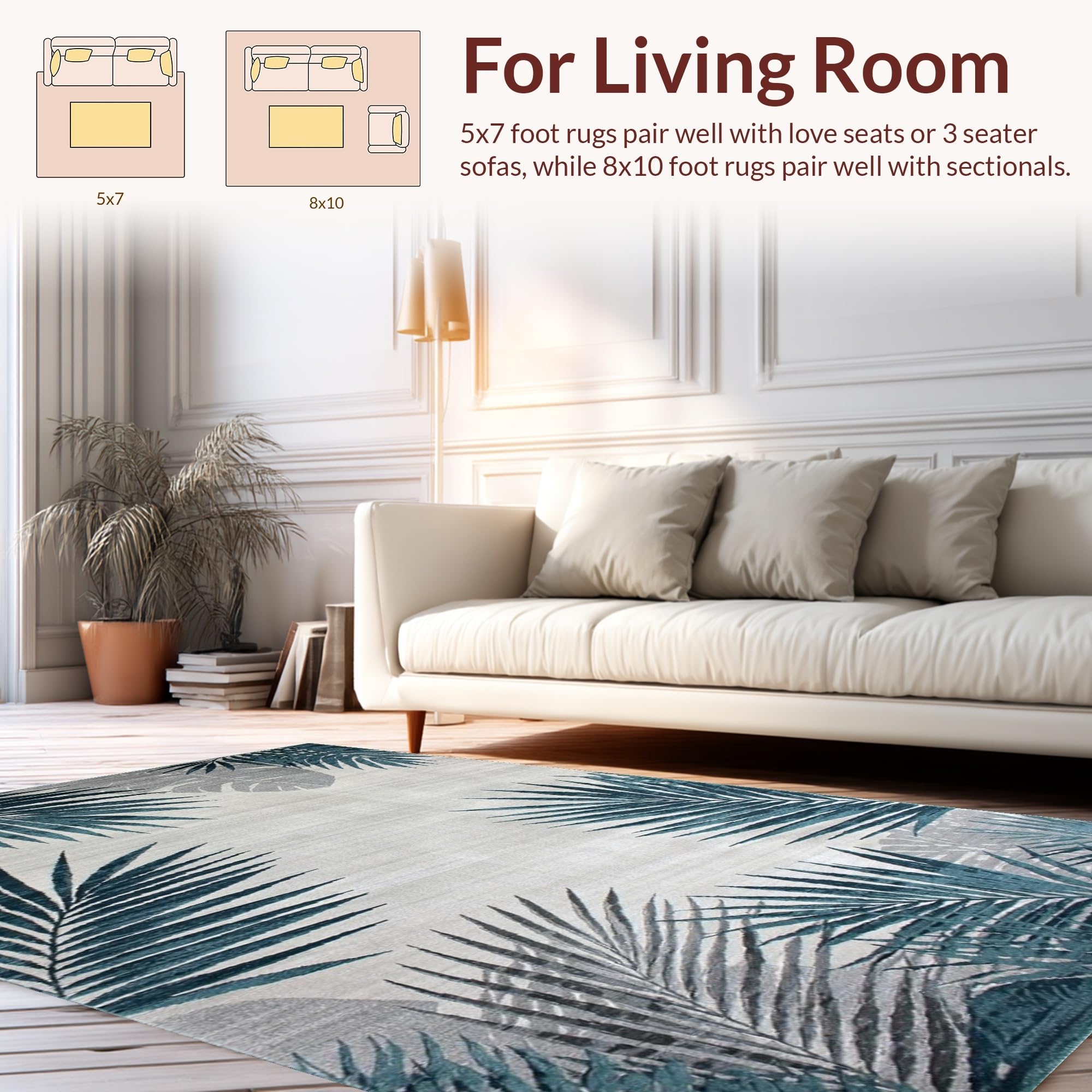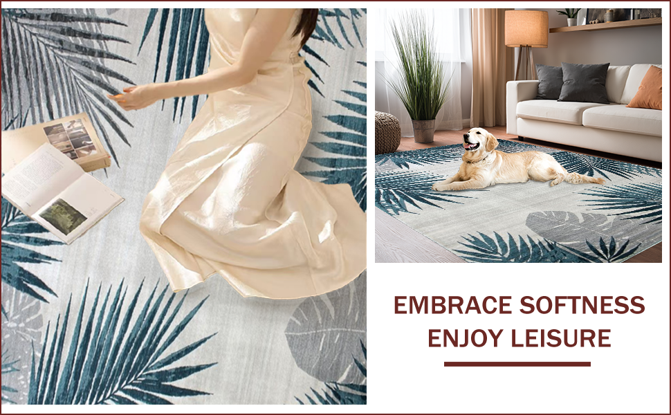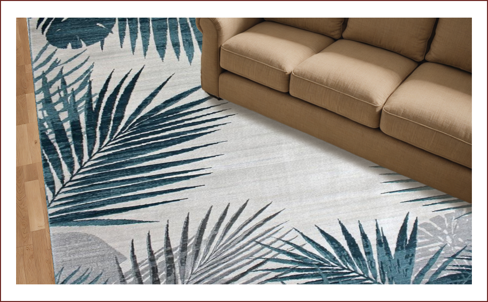 Ultra Soft Area Rug, Non Slip, Stain Resistant, Washable Area Rugs for Living Room, Bedroom, Elegant Tropical Leaf Motif(Blue) Overview: