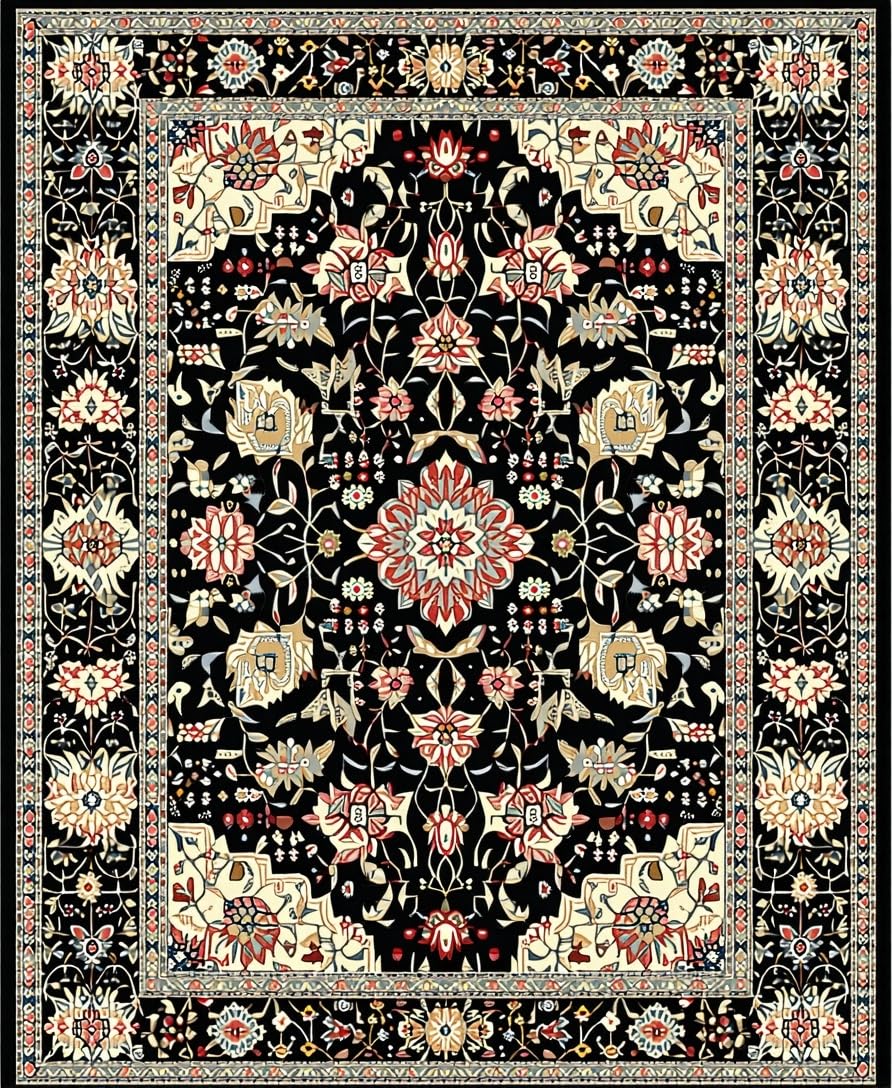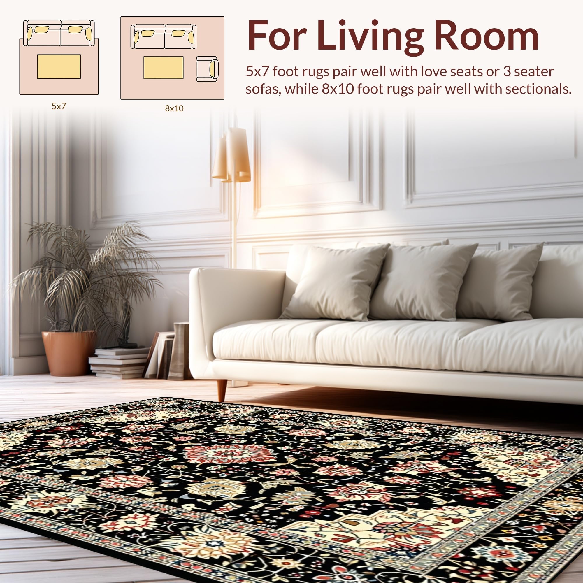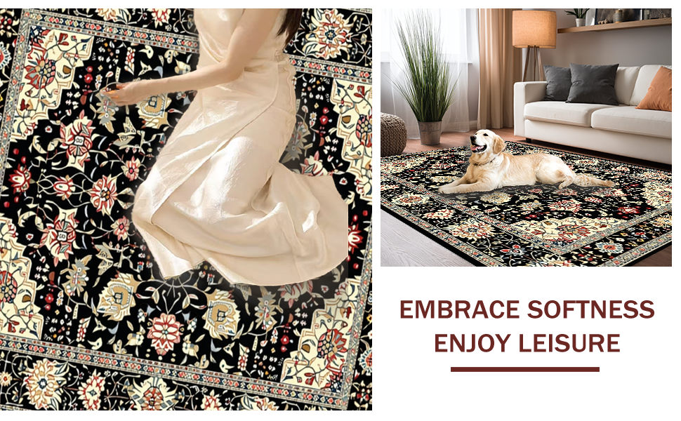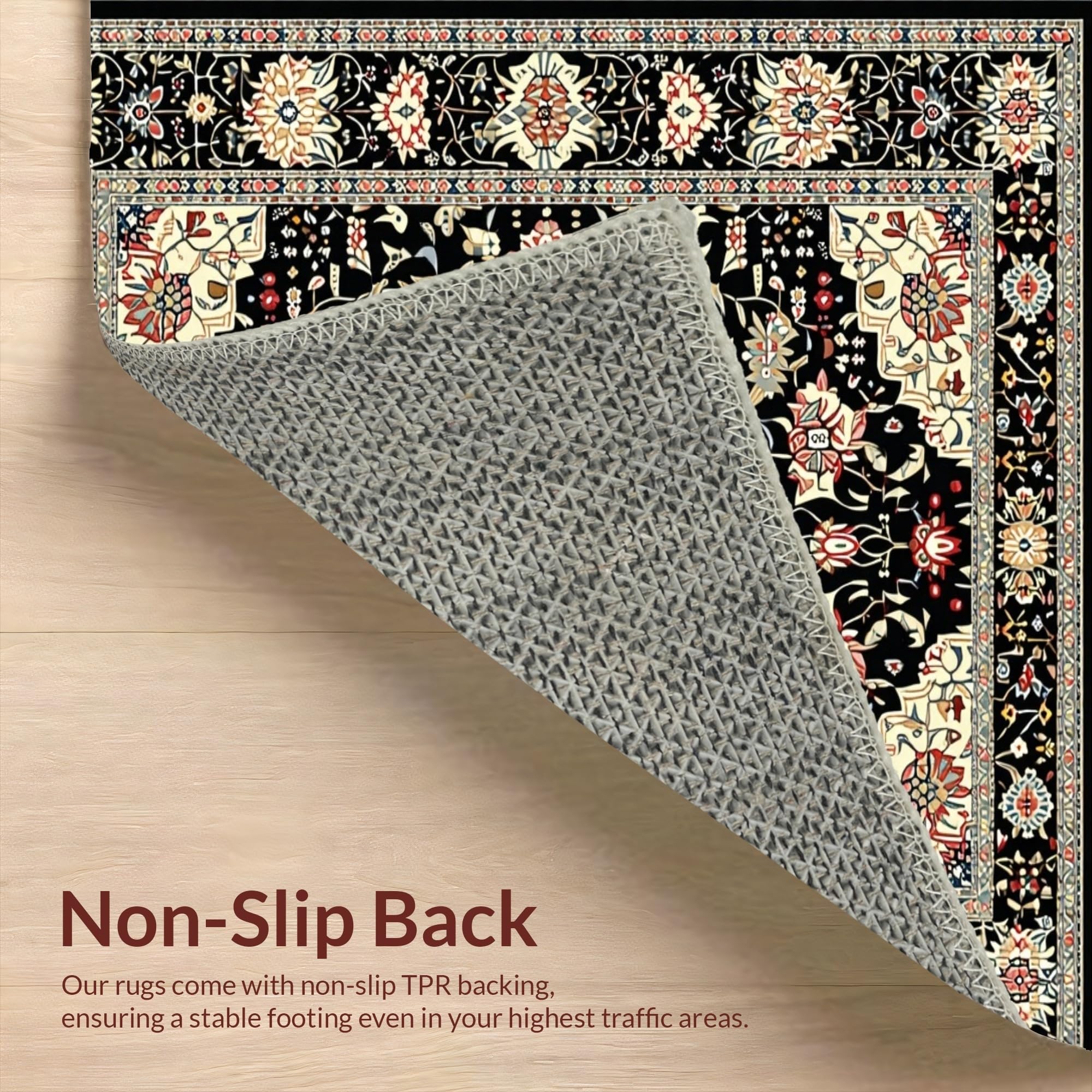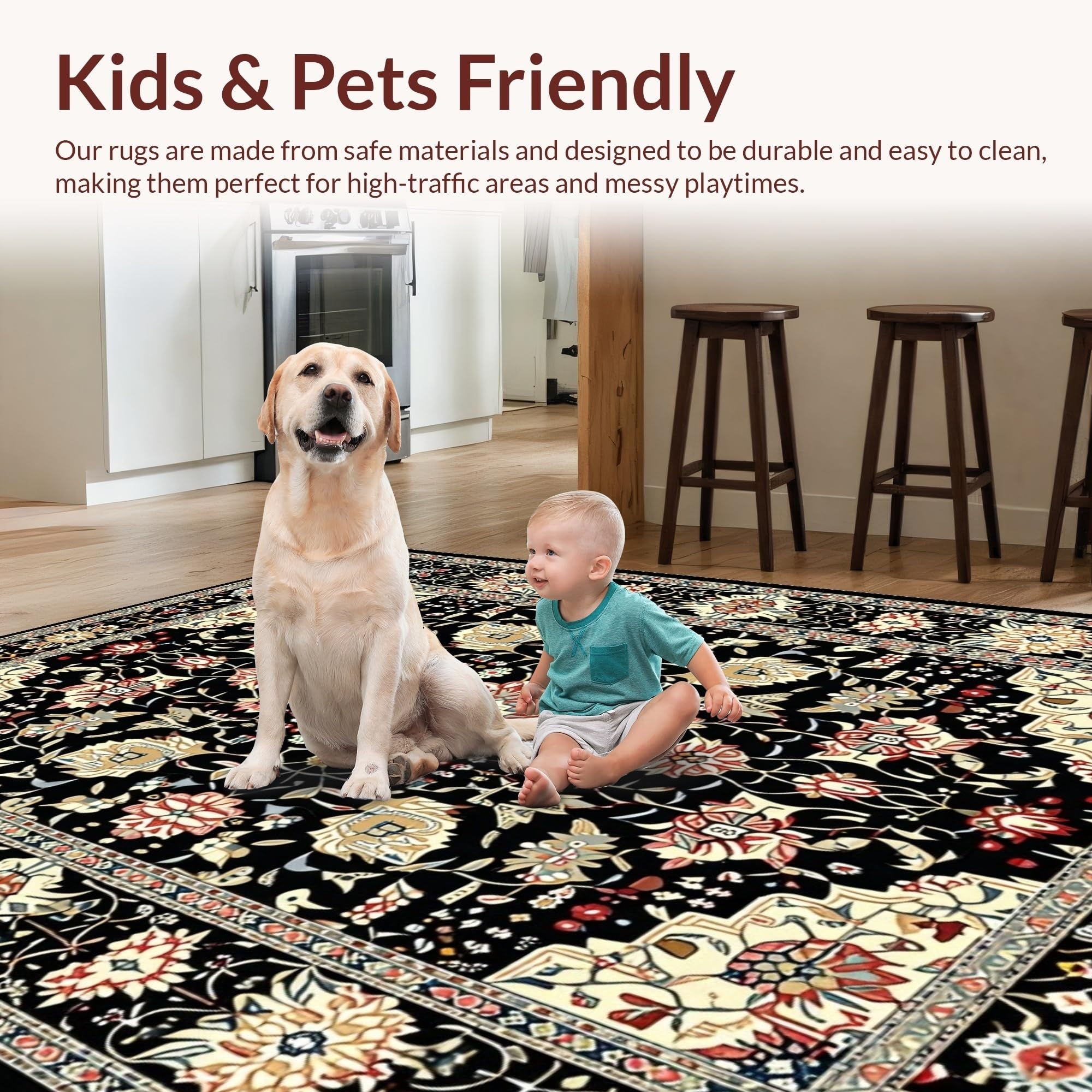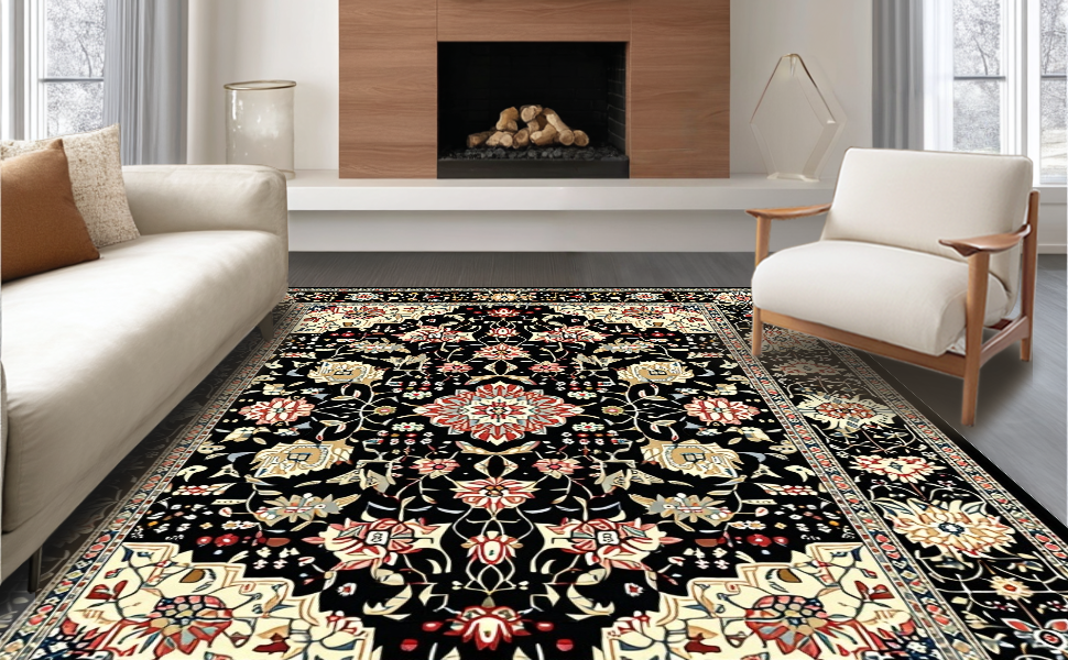 Ultra Soft Area Rug, Non Slip, Stain Resistant, Washable Area Rugs for Living Room, Bedroom, Elegant Vintage Tiled Design(Black) Overview: