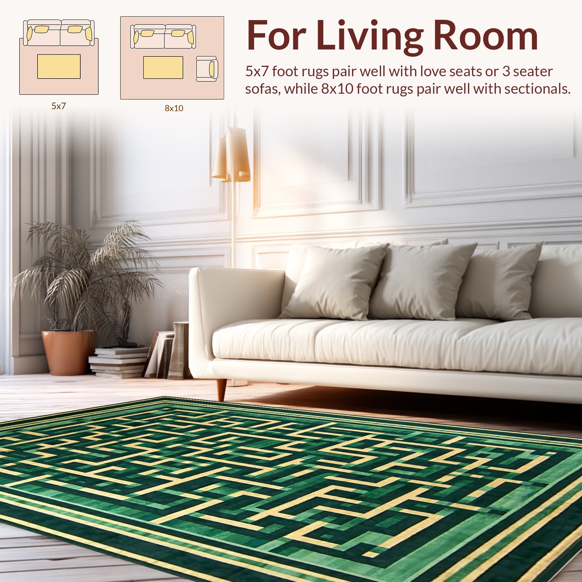 Flatwoven High Traffic Area Rug, Emerald Maze Interlocking with Subtle Gold Highlights, Non Slip, Stain Resistant, Washable Area Rugs for Living Room, Bedroom (Green) Overview:
