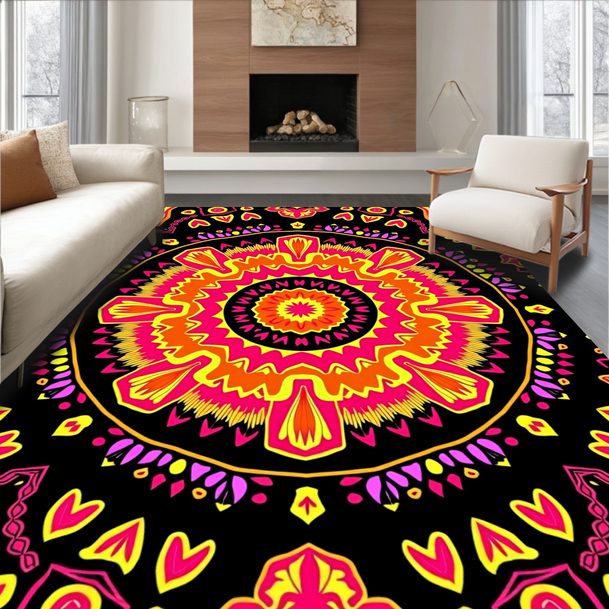 Flatwoven High Traffic Area Rug, Enchanting Boho Medallion Sunburst Kaleidoscope Throw, Non Slip, Stain Resistant, Washable Area Rugs for Living Room, Bedroom (Black) Overview: