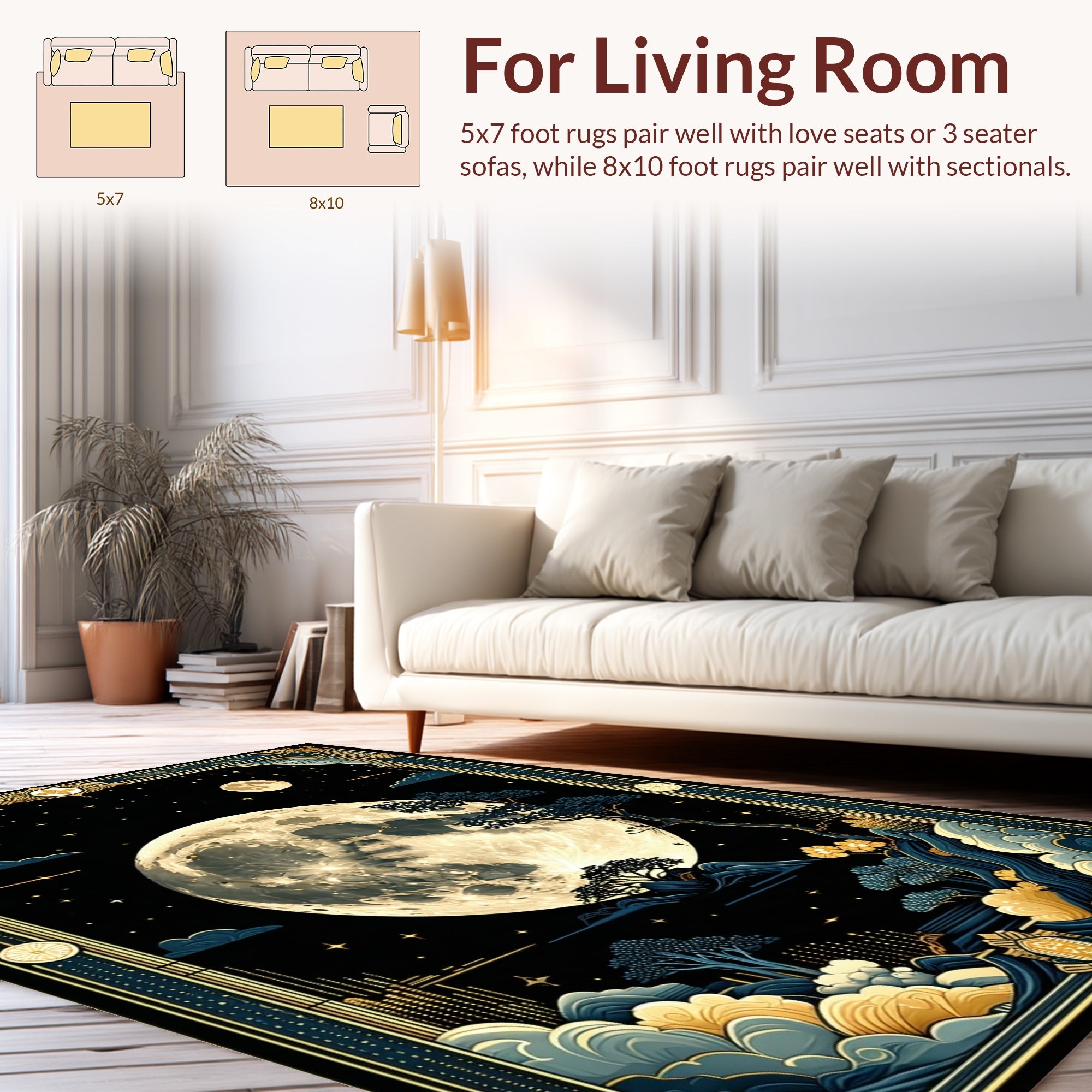 Flatwoven High Traffic Area Rug, Enchanting Moonlit Boho Design, Non Slip, Stain Resistant, Washable Area Rugs for Living Room, Bedroom (Gold) Overview: