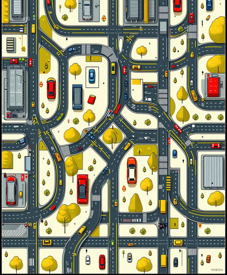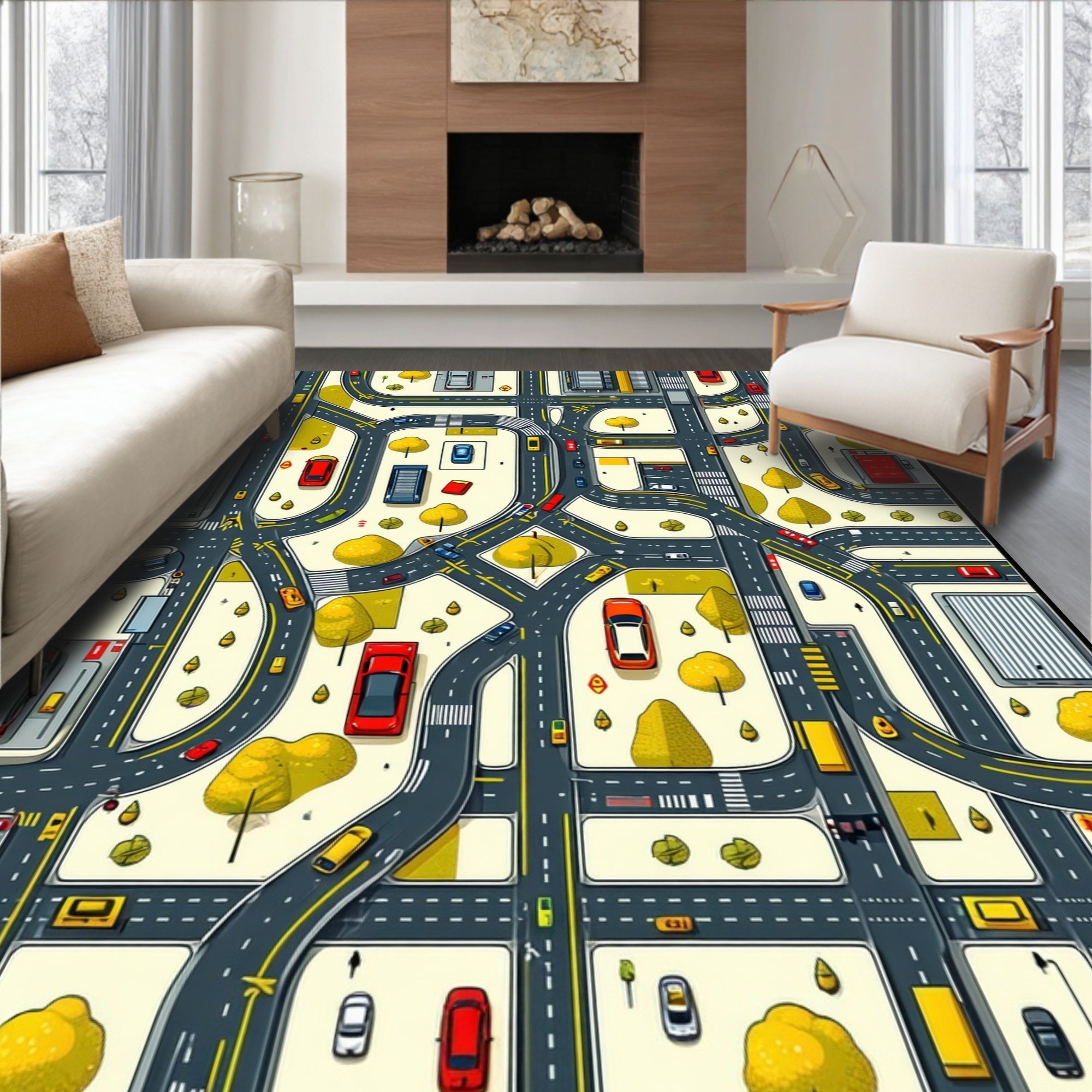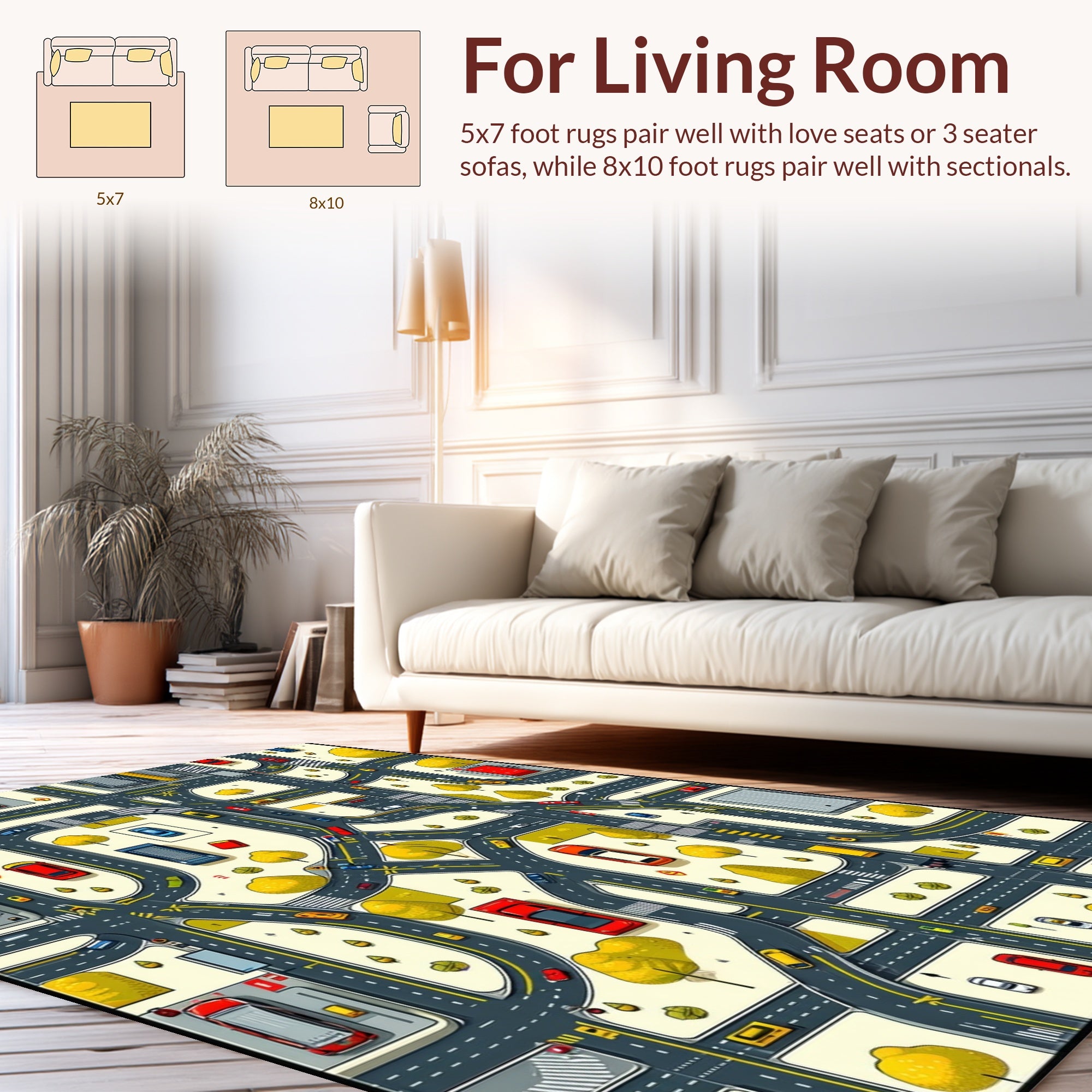 Flatwoven High Traffic Area Rug, Engaging Vehicle Pathway Illustration, Non Slip, Stain Resistant, Washable Area Rugs for Living Room, Bedroom (Yellow) Overview:
