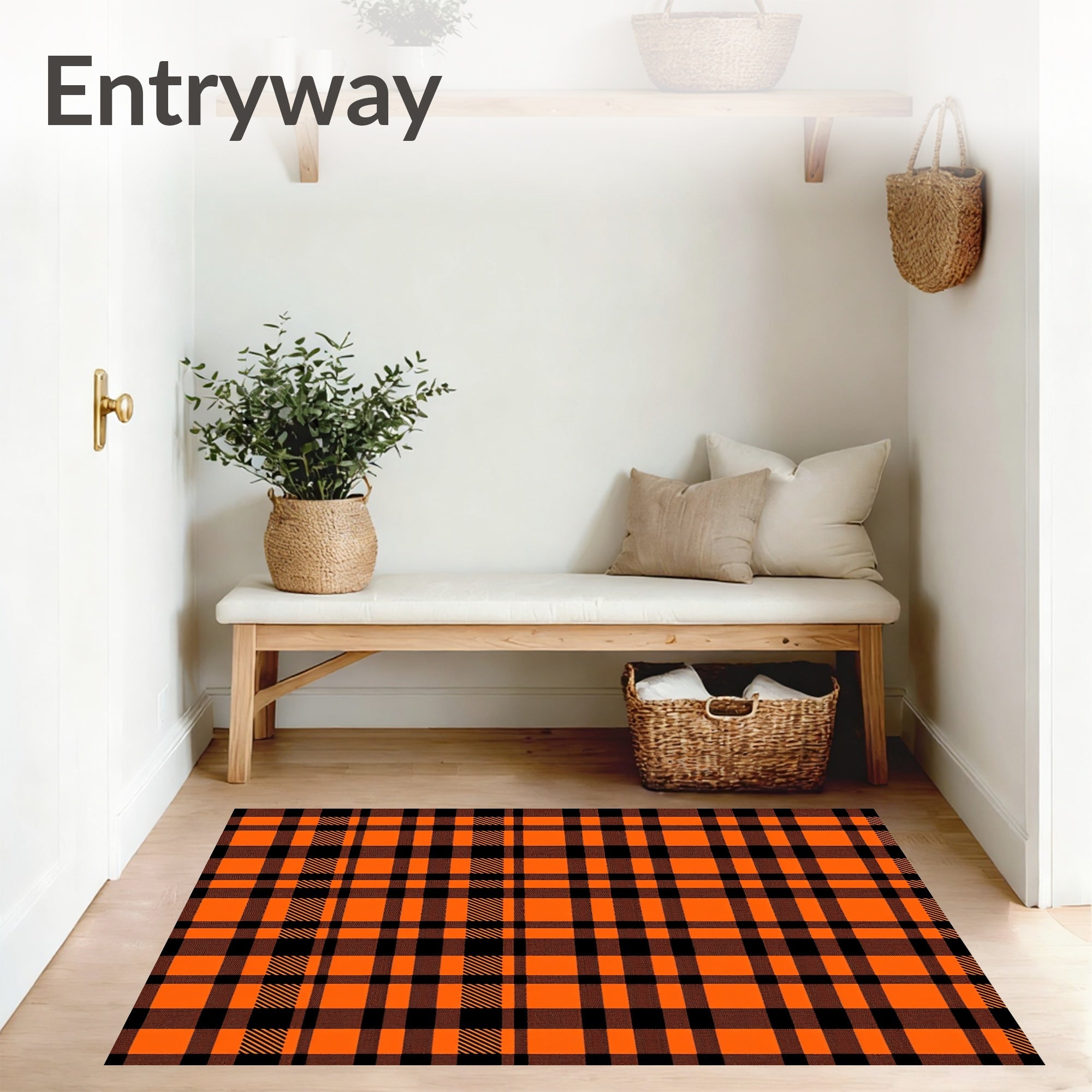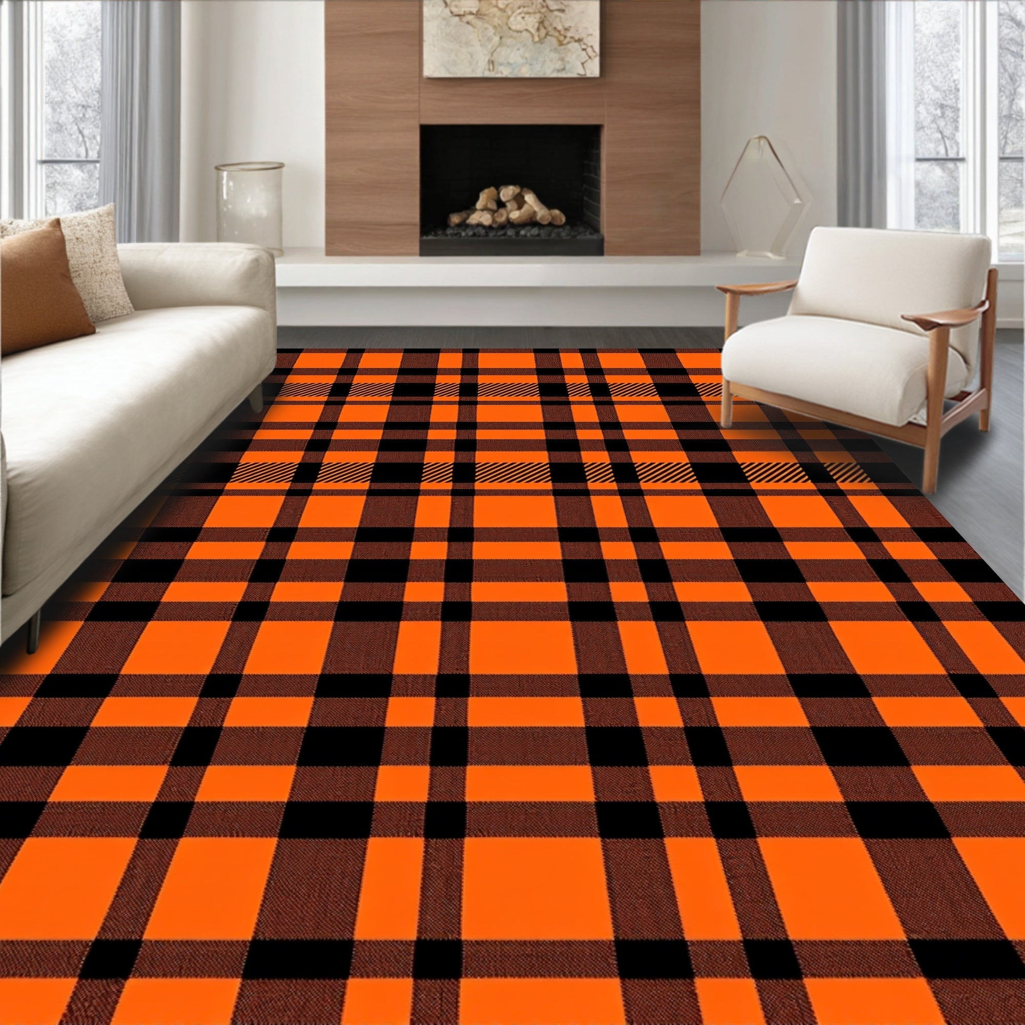 Ultra Soft Area Rug, Non Slip, Stain Resistant, Washable Area Rugs for Living Room, Bedroom, Festive Autumn Interlocking Tartan Design with Crisp Stripes(Orange) Overview: