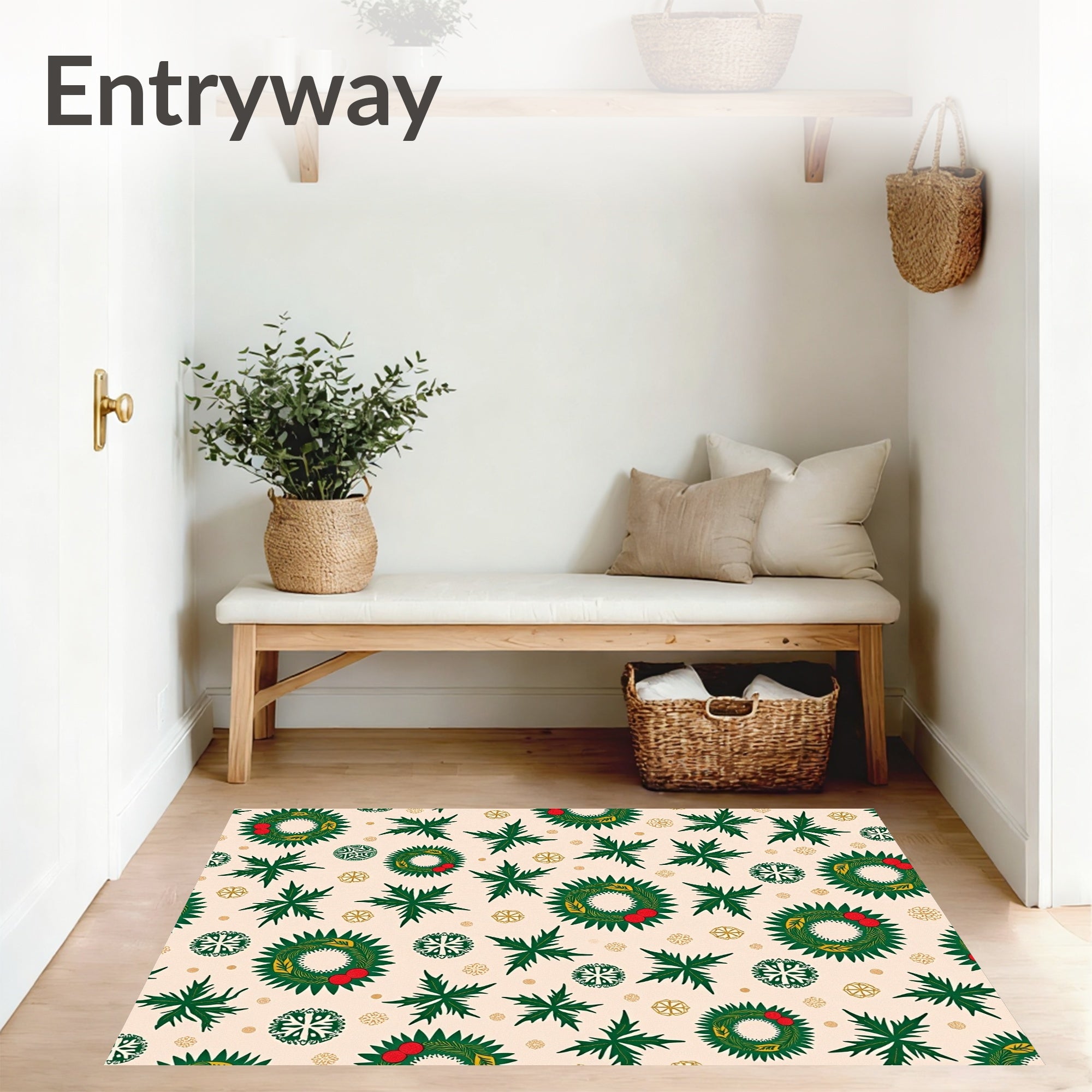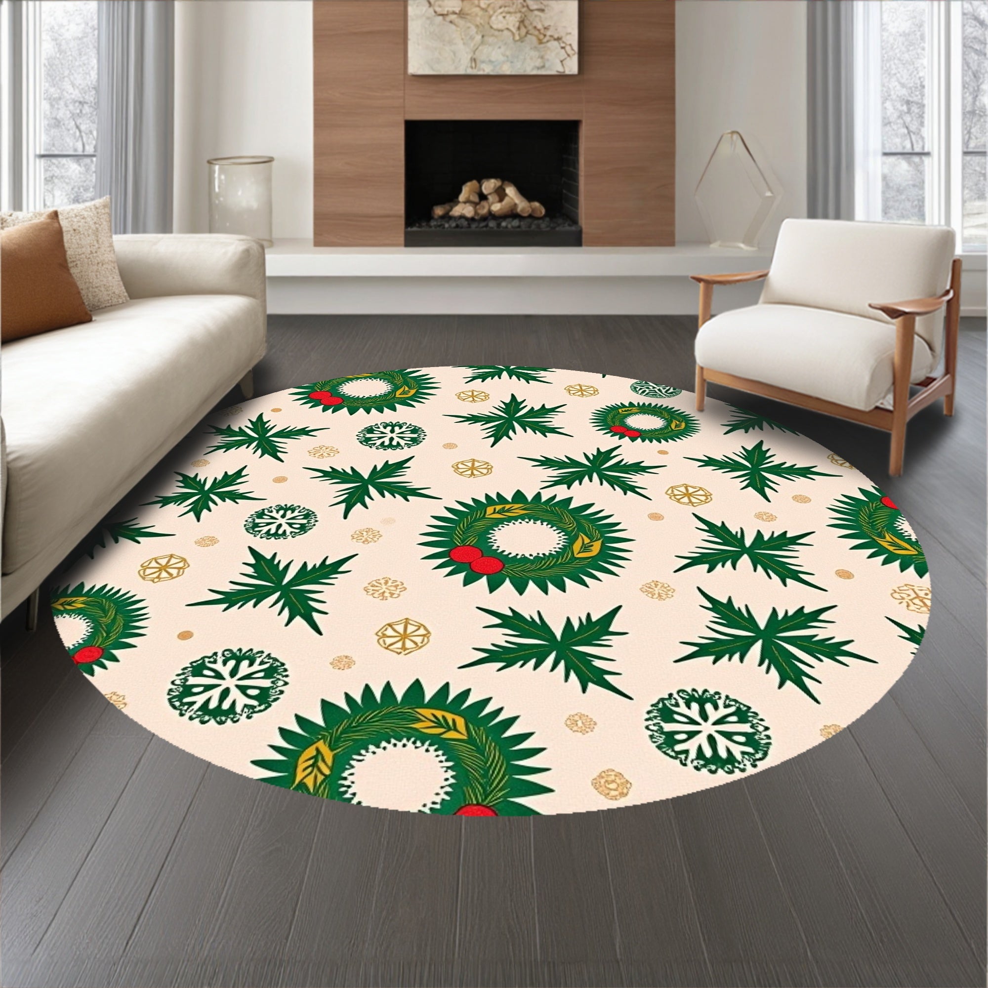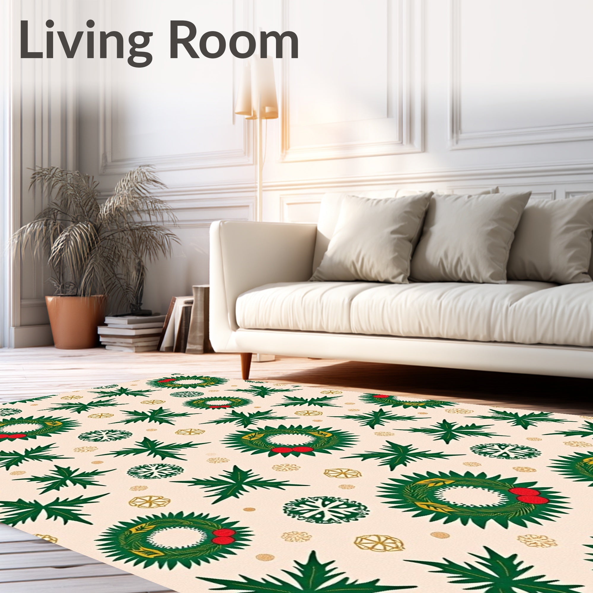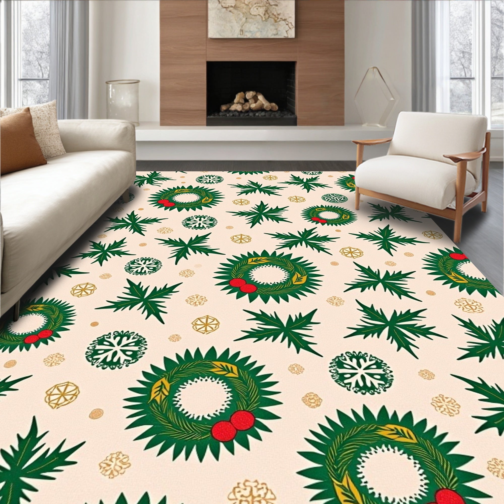 Ultra Soft Area Rug, Non Slip, Stain Resistant, Washable Area Rugs for Living Room, Bedroom, Festive Holly Wreath with Snowflake Motifs Holiday Celebration(Beige) Overview: