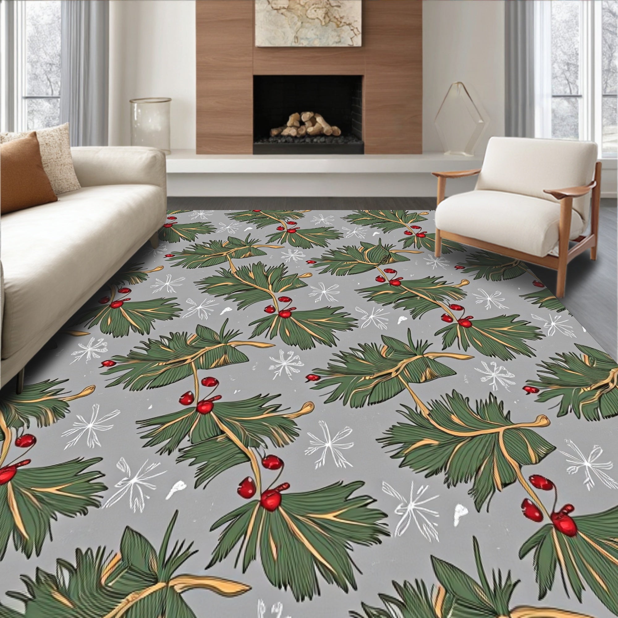 Ultra Soft Area Rug, Non Slip, Stain Resistant, Washable Area Rugs for Living Room, Bedroom, Festive Pine Wreath Motif with Berries and Delicate Snowflake Accents(Green) Overview: