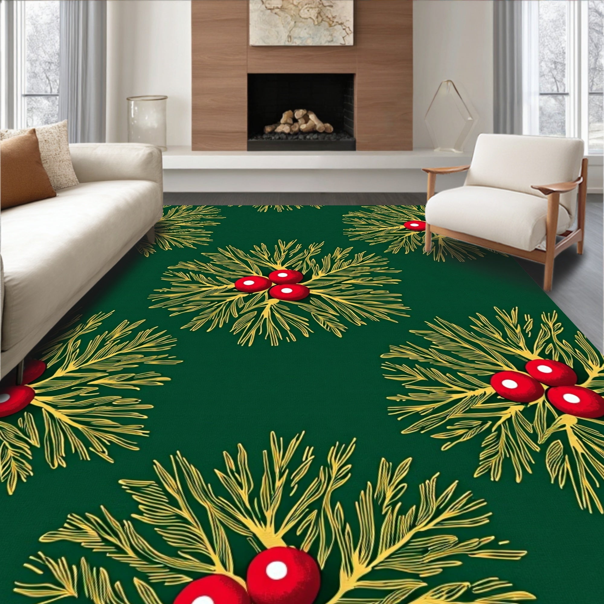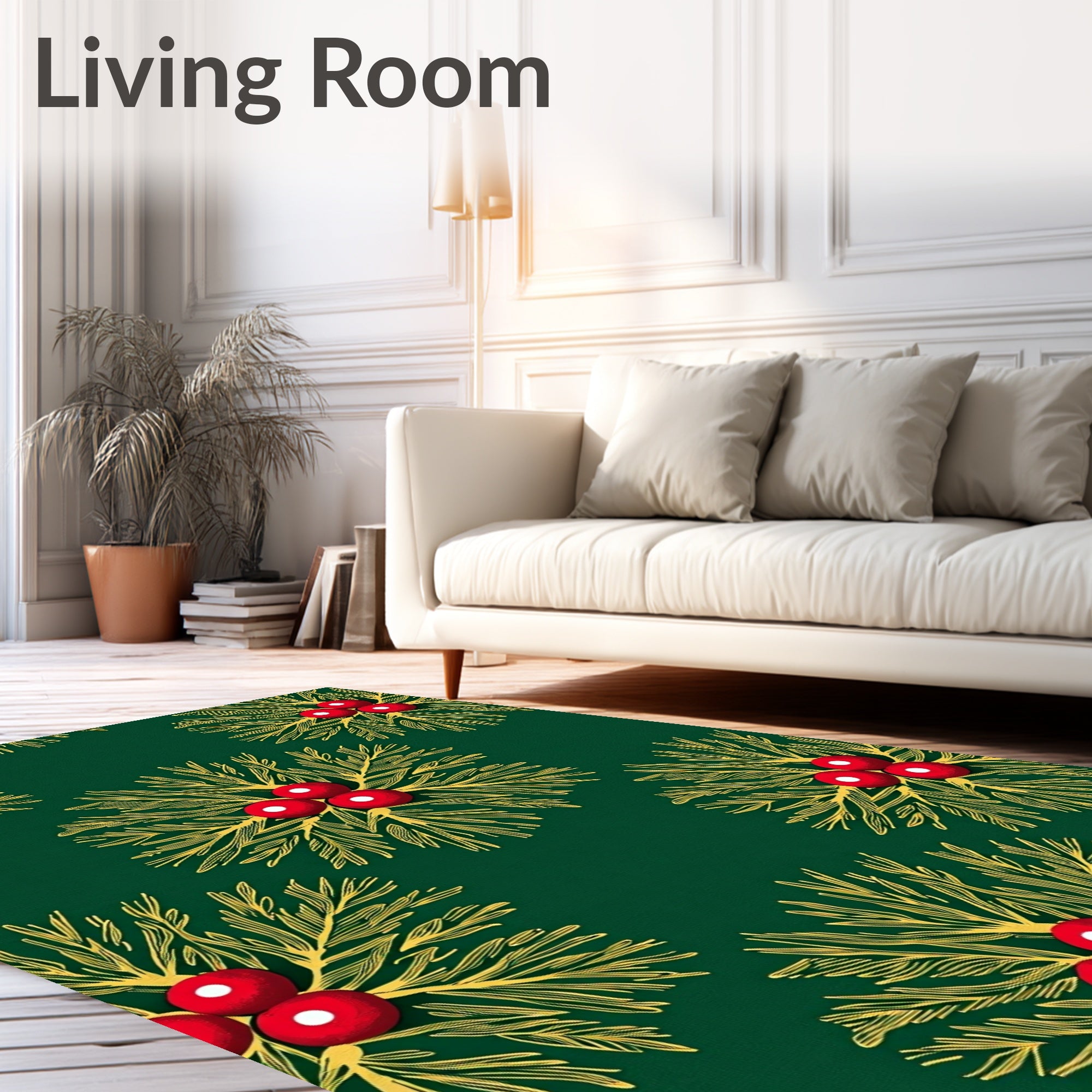 Ultra Soft Area Rug, Non Slip, Stain Resistant, Washable Area Rugs for Living Room, Bedroom, Festive Pine Wreath with Ribbon and Berry Motifs(Green) Overview:
