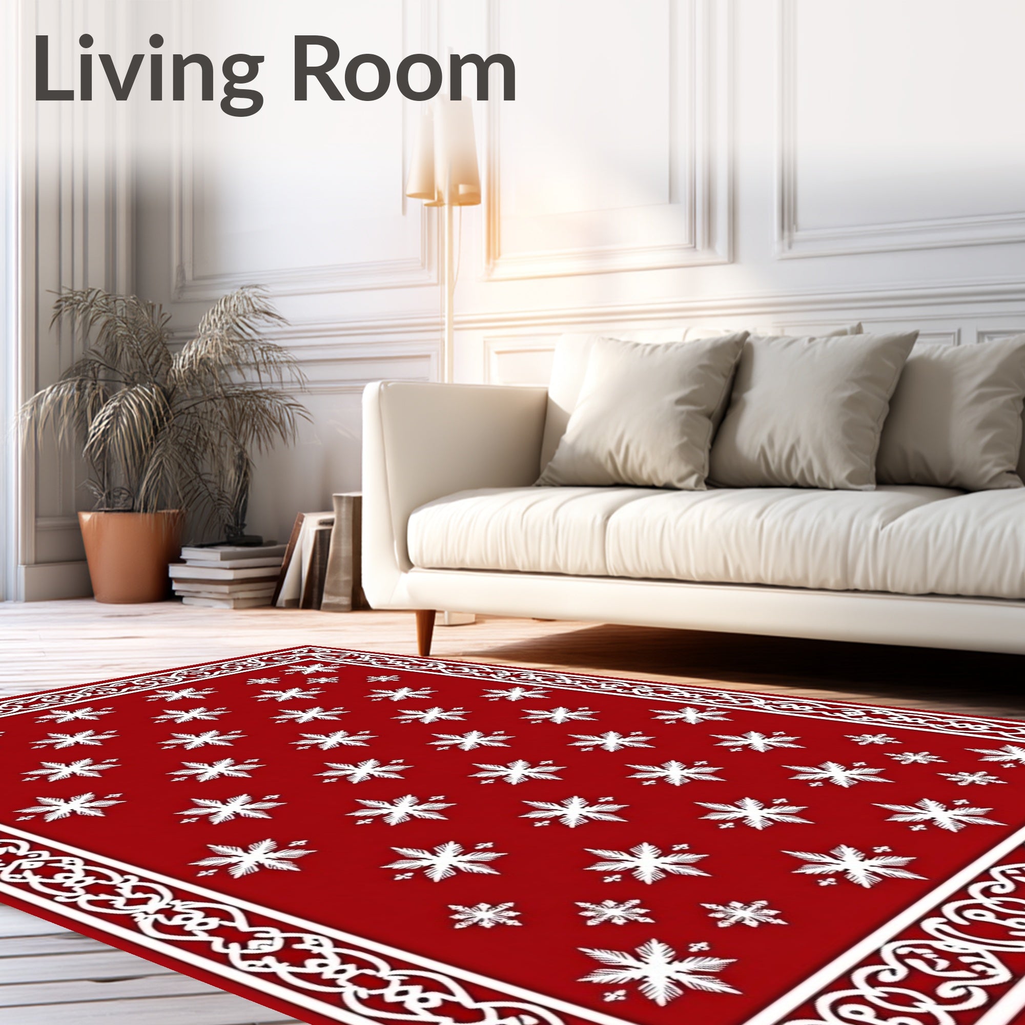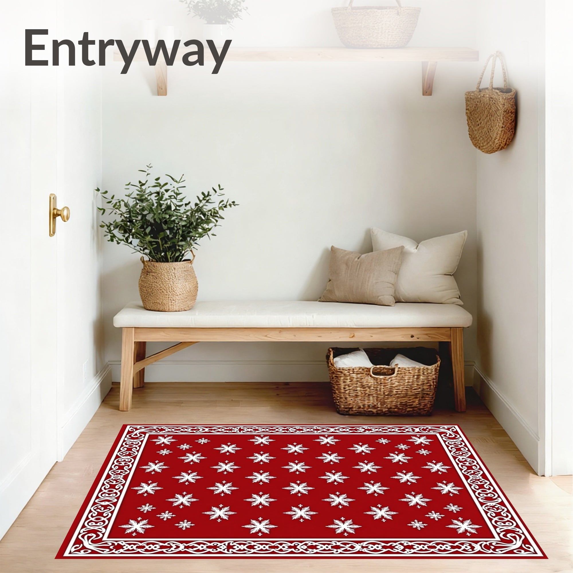 Flatwoven High Traffic Area Rug, Festive Snowflake Medallion with Classic Holiday Motifs, Non Slip, Stain Resistant, Washable Area Rugs for Living Room, Bedroom (Red) Overview: