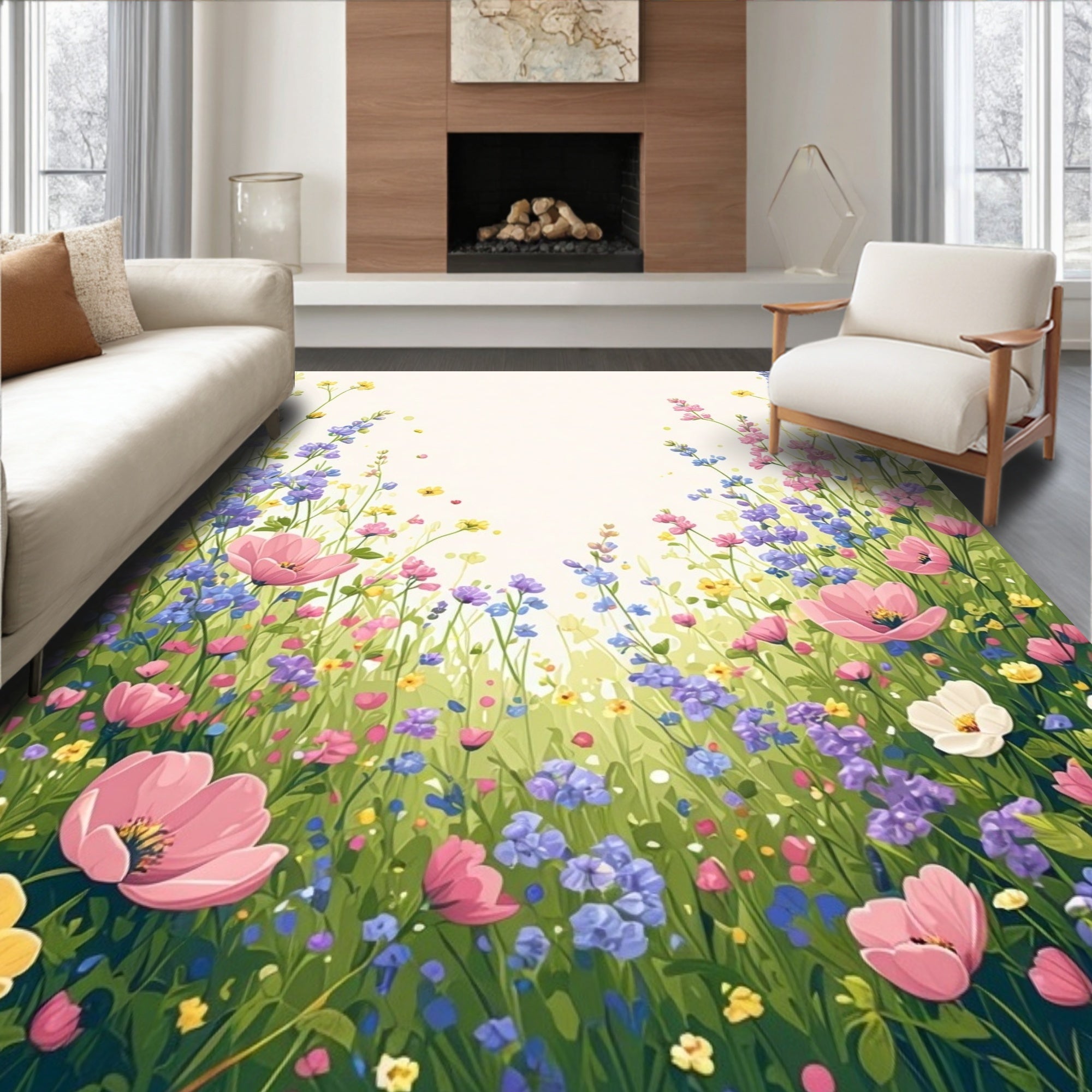 Flatwoven High Traffic Area Rug, Floral Meadow Pink Garden Indoor, Non Slip, Stain Resistant, Washable Area Rugs for Living Room, Bedroom (Pink) Overview: