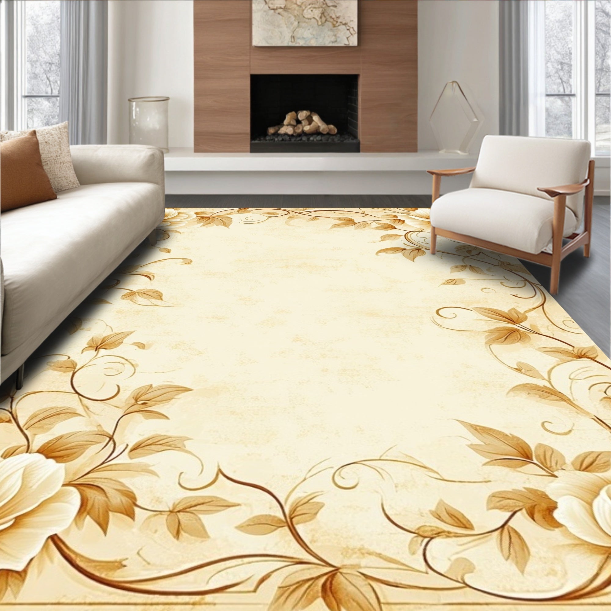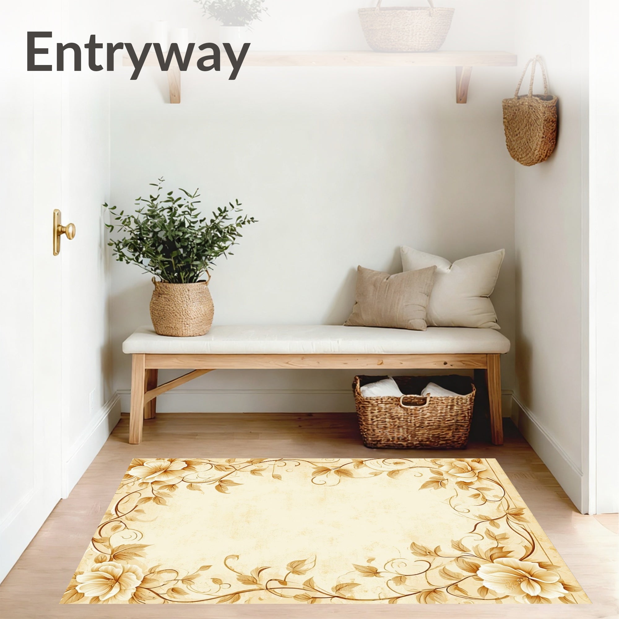 Ultra Soft Area Rug, Non Slip, Stain Resistant, Washable Area Rugs for Living Room, Bedroom, Floral Patterned Runner in Warm Beige with Ornate Leafy Embellishments(Beige) Overview:
