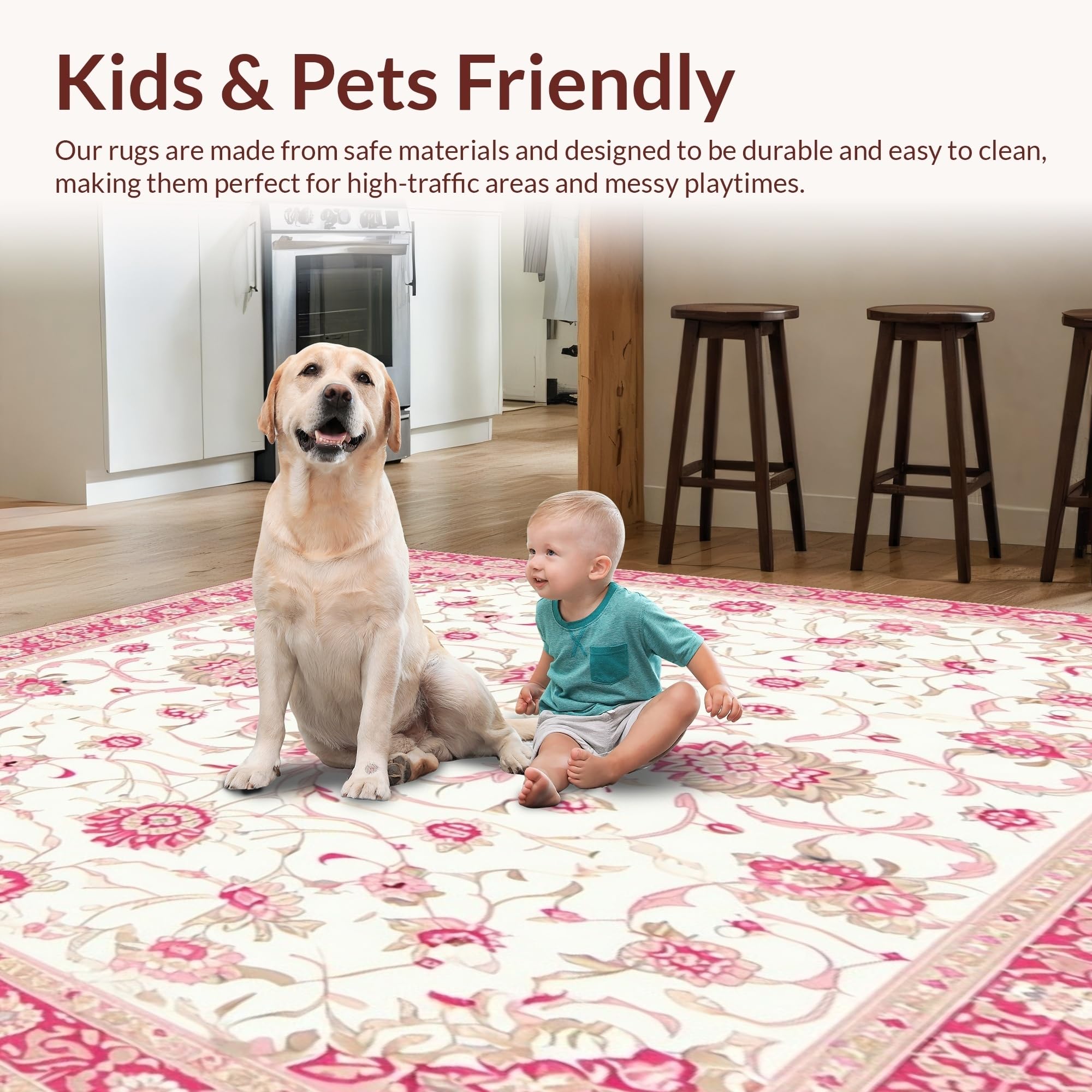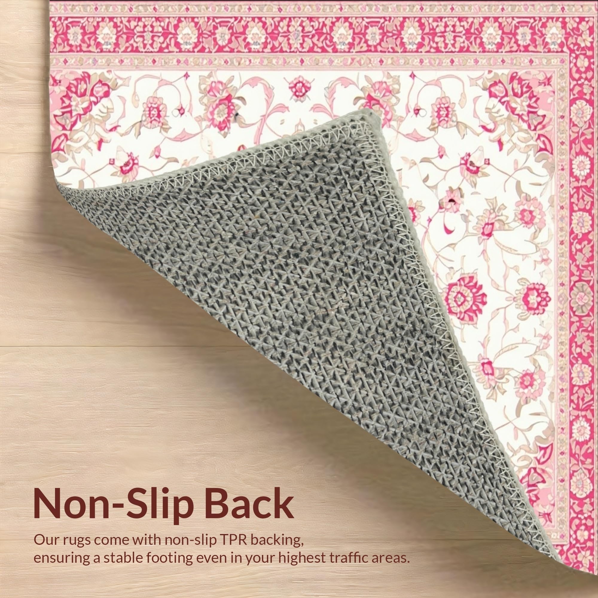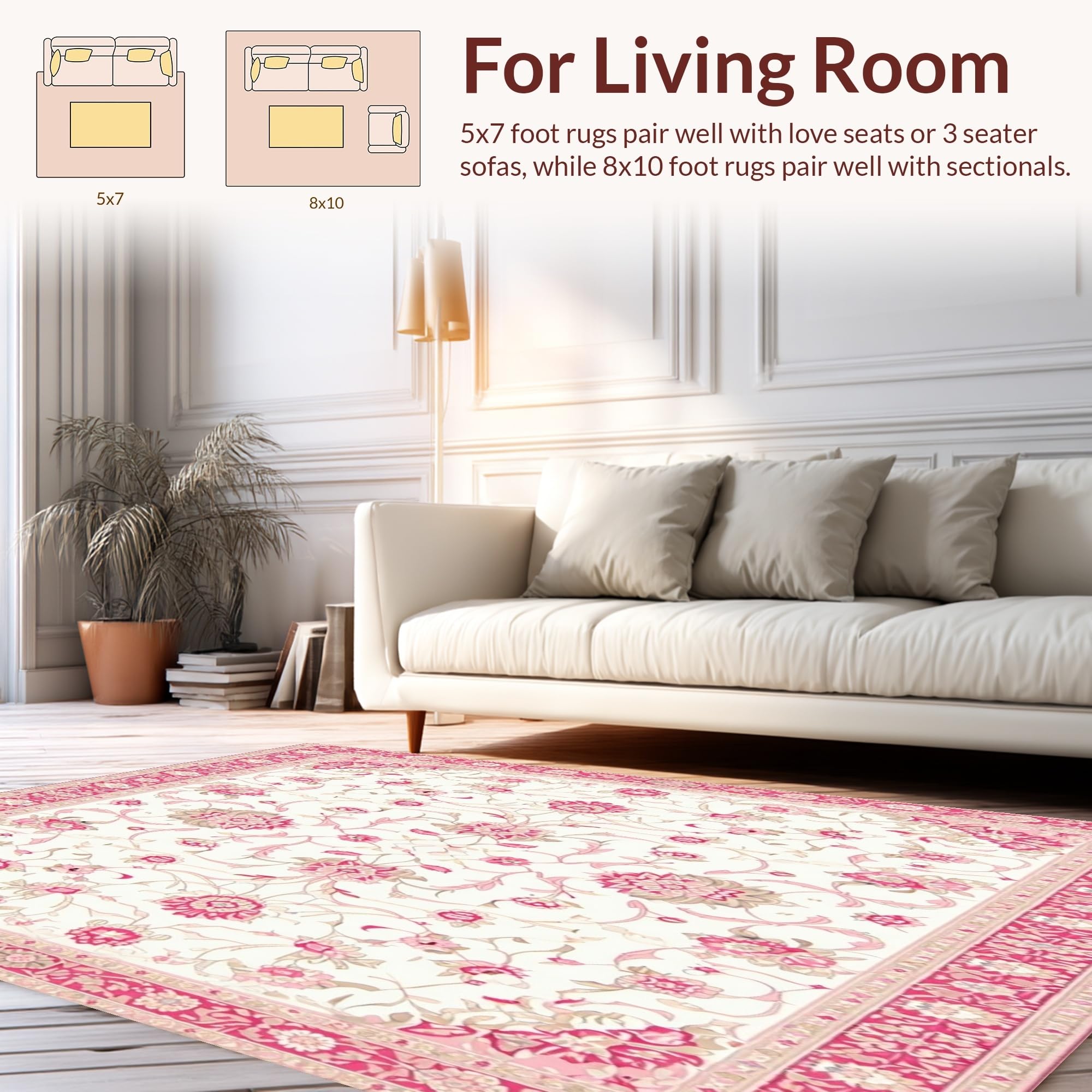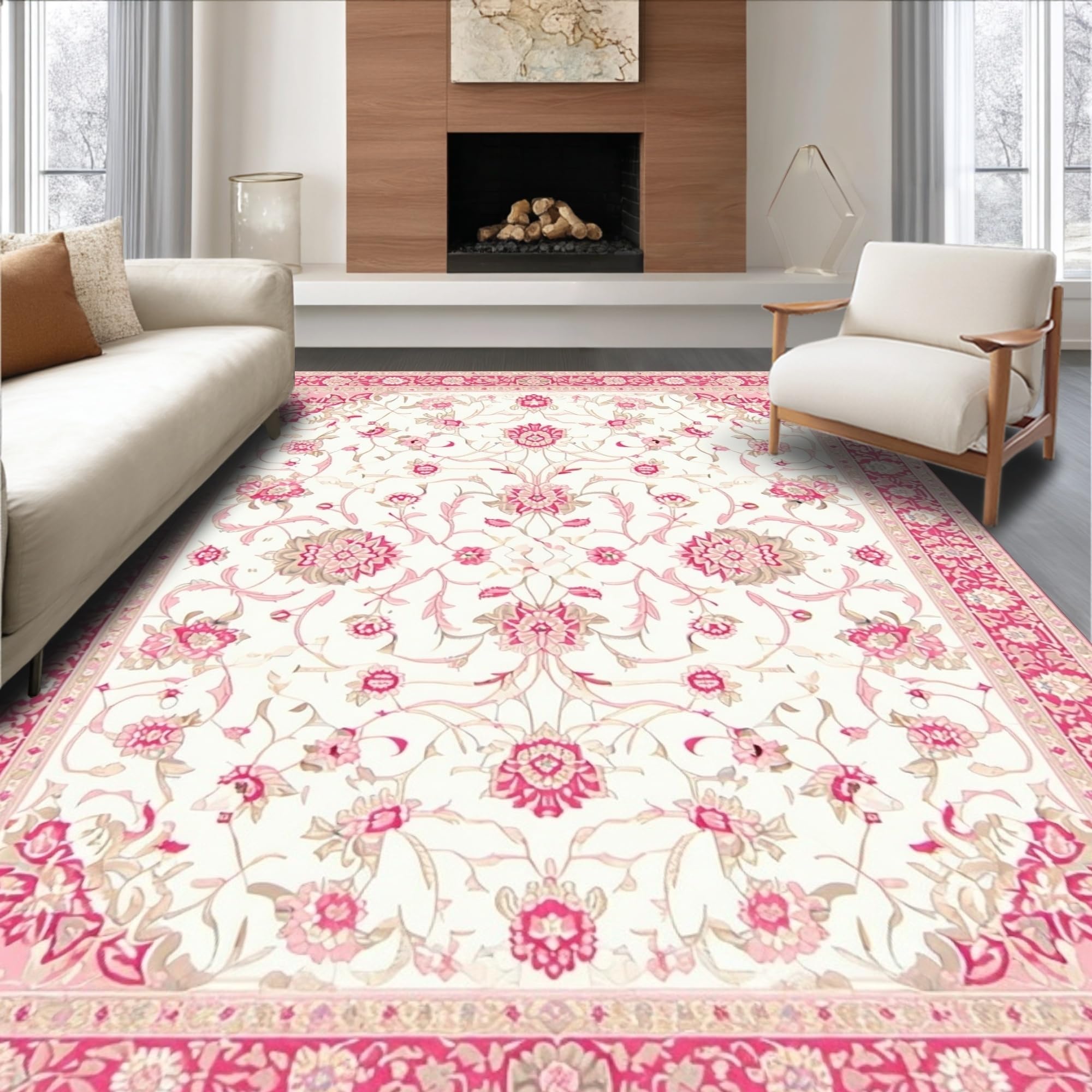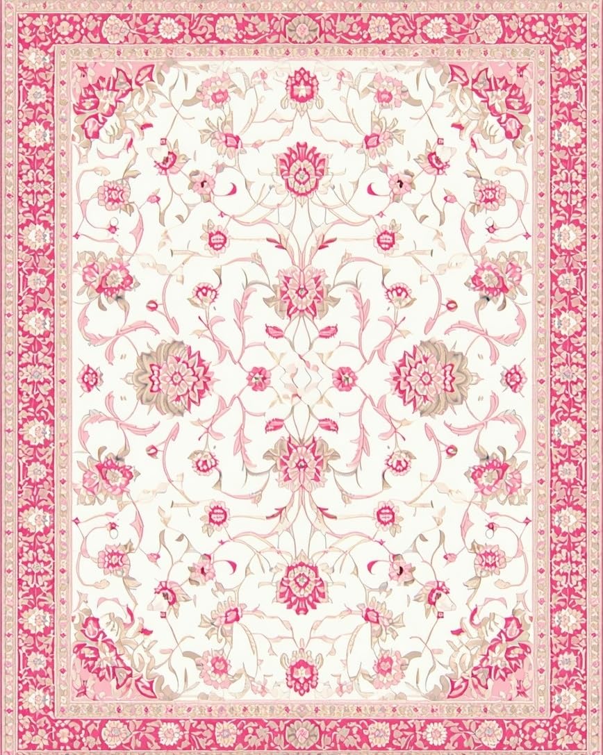 Ultra Soft Area Rug, Non Slip, Stain Resistant, Washable Area Rugs for Living Room, Bedroom, Floral White Area with Gentle Pink and Beige Traditional Motifs(White) Overview: