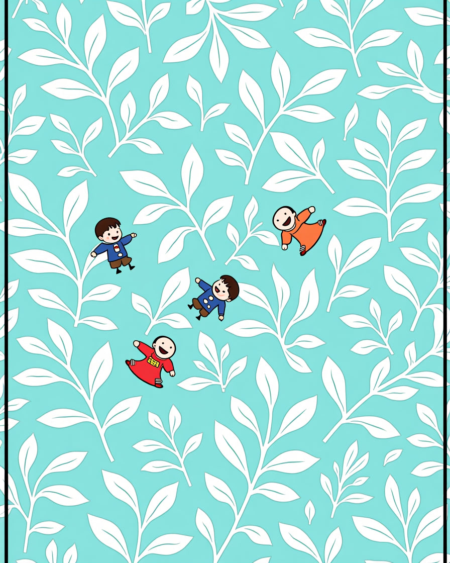 Friendly Forest Gathering with Animated Figures and Leafy Swirls(Blue)