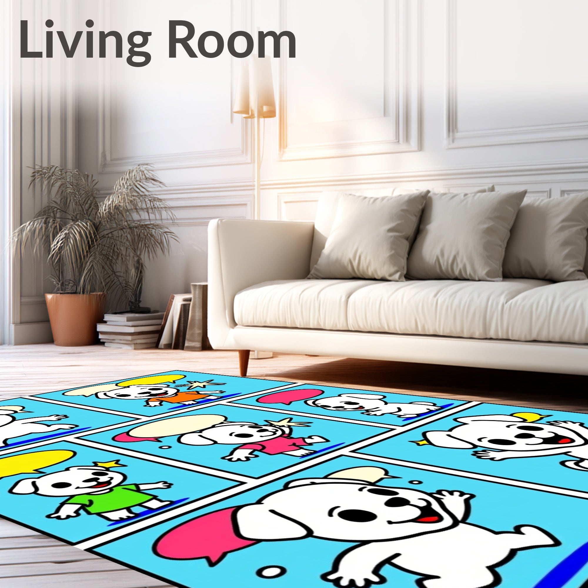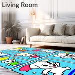 Ultra Soft Area Rug, Non Slip, Stain Resistant, Washable Area Rugs for Living Room, Bedroom, Friendly Puppy Adventure Scene Floor with Comic Strip Style(Blue) Overview: