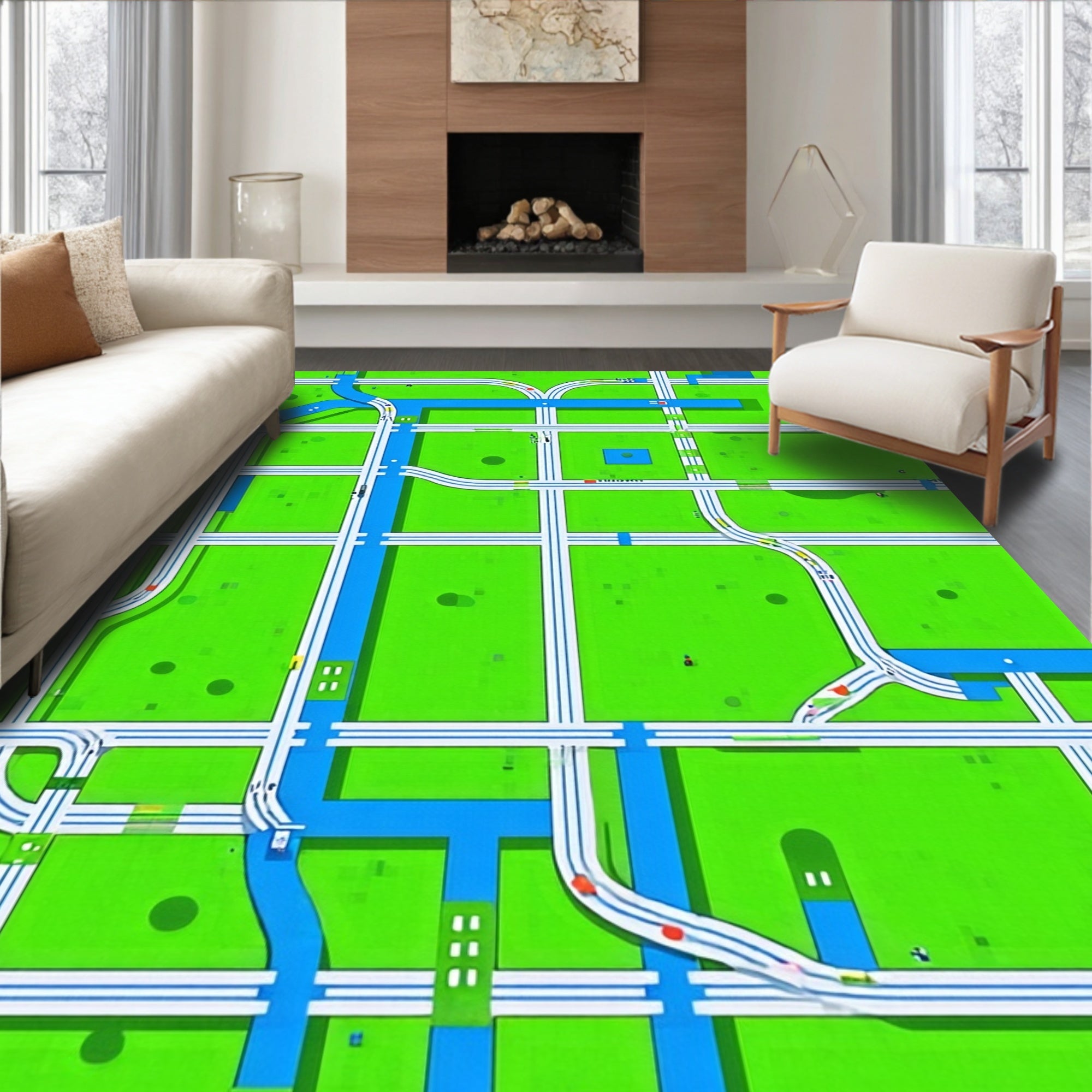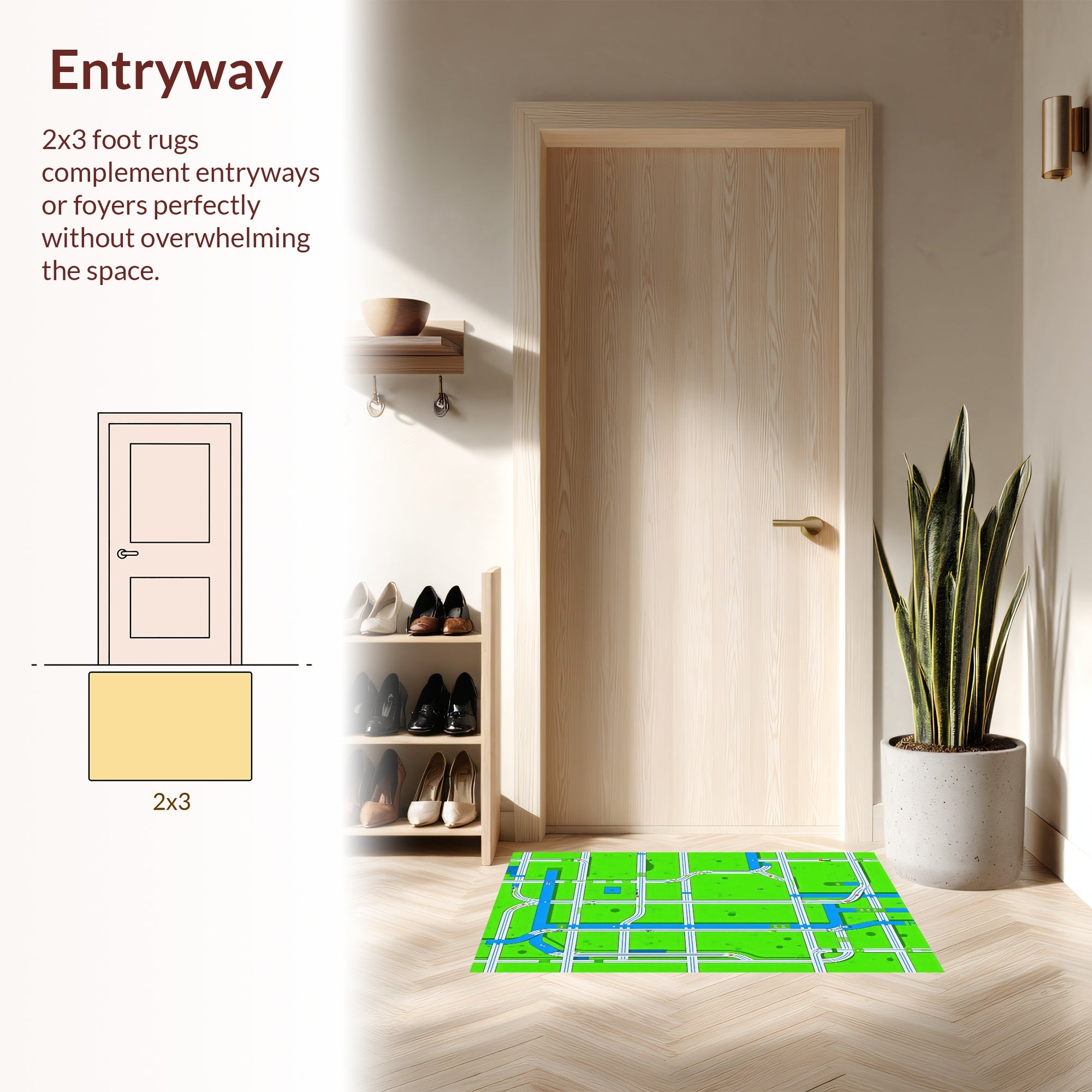 Flatwoven High Traffic Area Rug, Fun Filled Vibrant Neighborhood Scene, Non Slip, Stain Resistant, Washable Area Rugs for Living Room, Bedroom (Green) Overview: