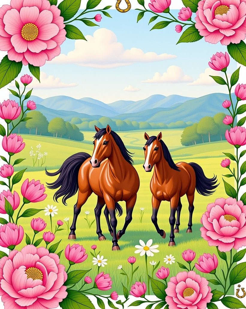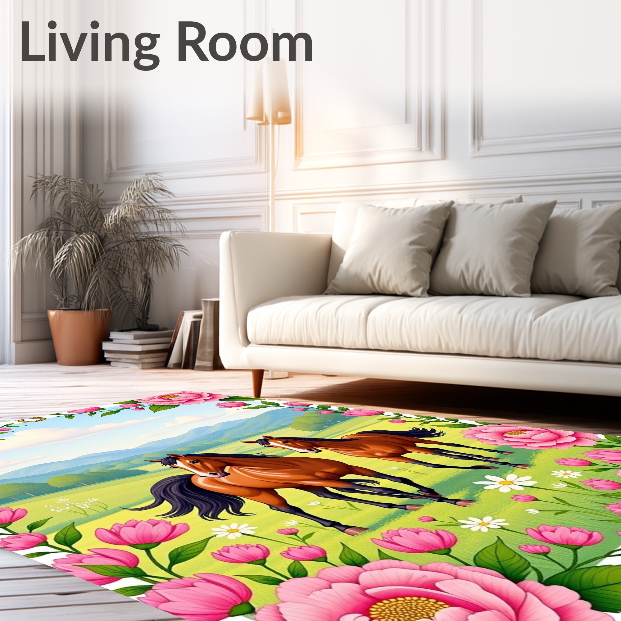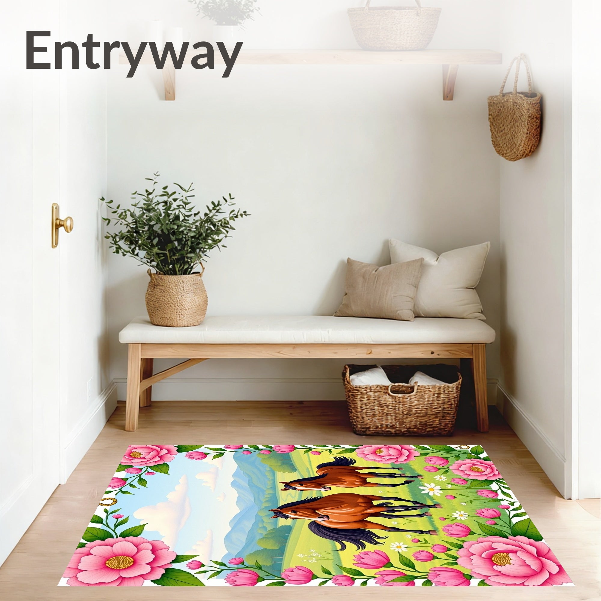 Flatwoven High Traffic Area Rug, Galloping Equestrian Countryside Floral Arrangement, Non Slip, Stain Resistant, Washable Area Rugs for Living Room, Bedroom (Pink) Overview: