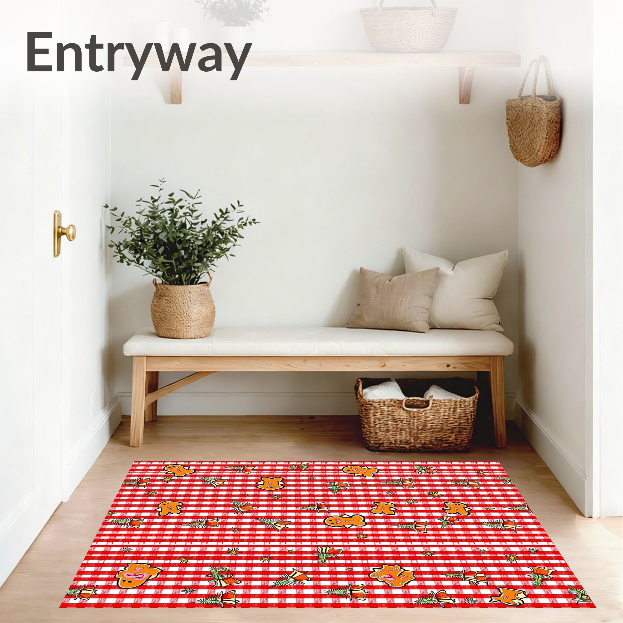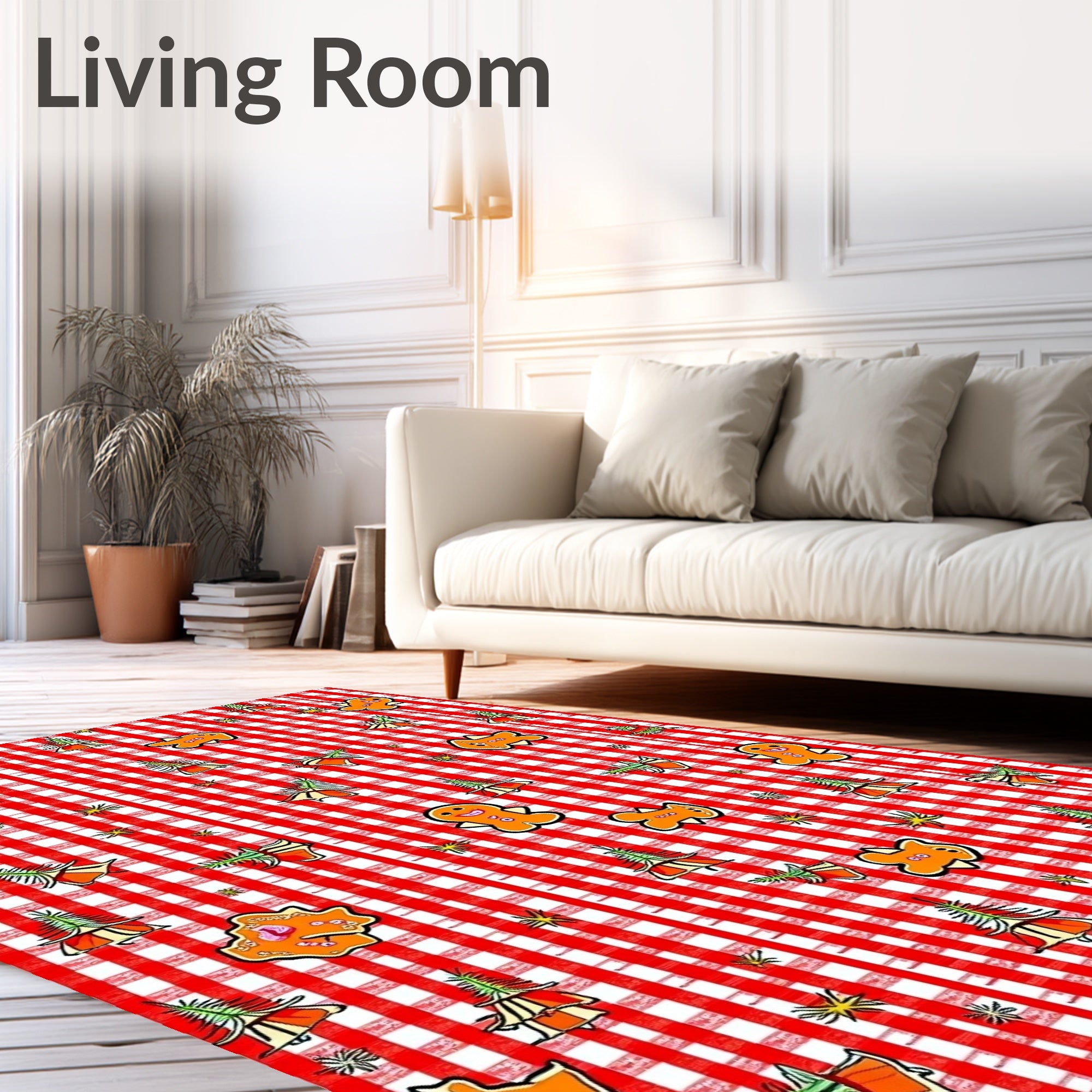 Ultra Soft Area Rug, Non Slip, Stain Resistant, Washable Area Rugs for Living Room, Bedroom, Gingham Patchwork Design with Seasonal Ornamentation(Red) Overview: