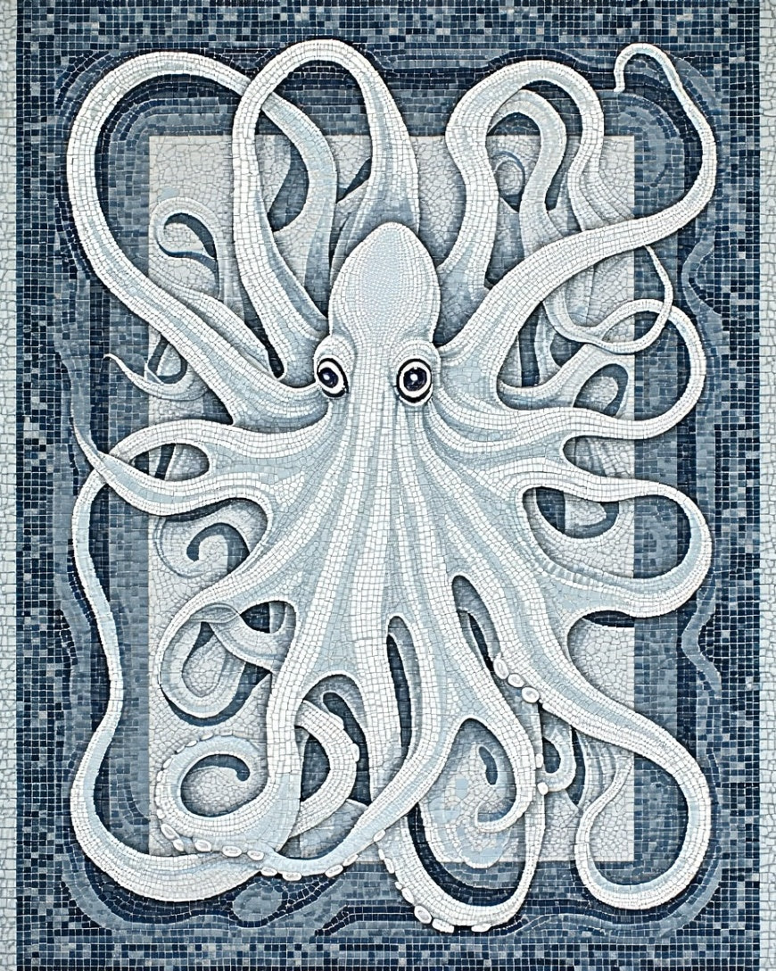 Grey Tentacle Mosaic Rug with Stylized Octopus Motifs and Geometric Flair(White)