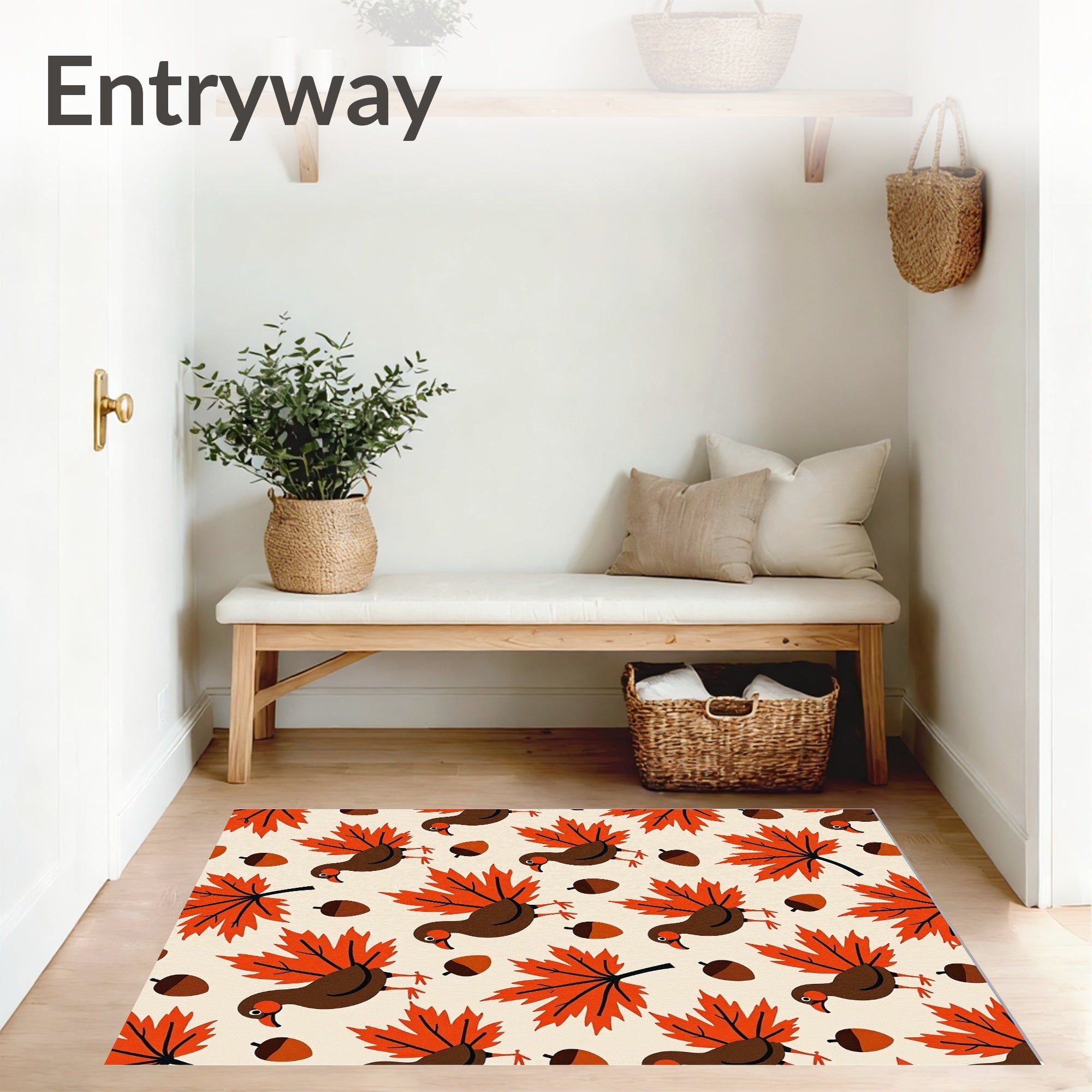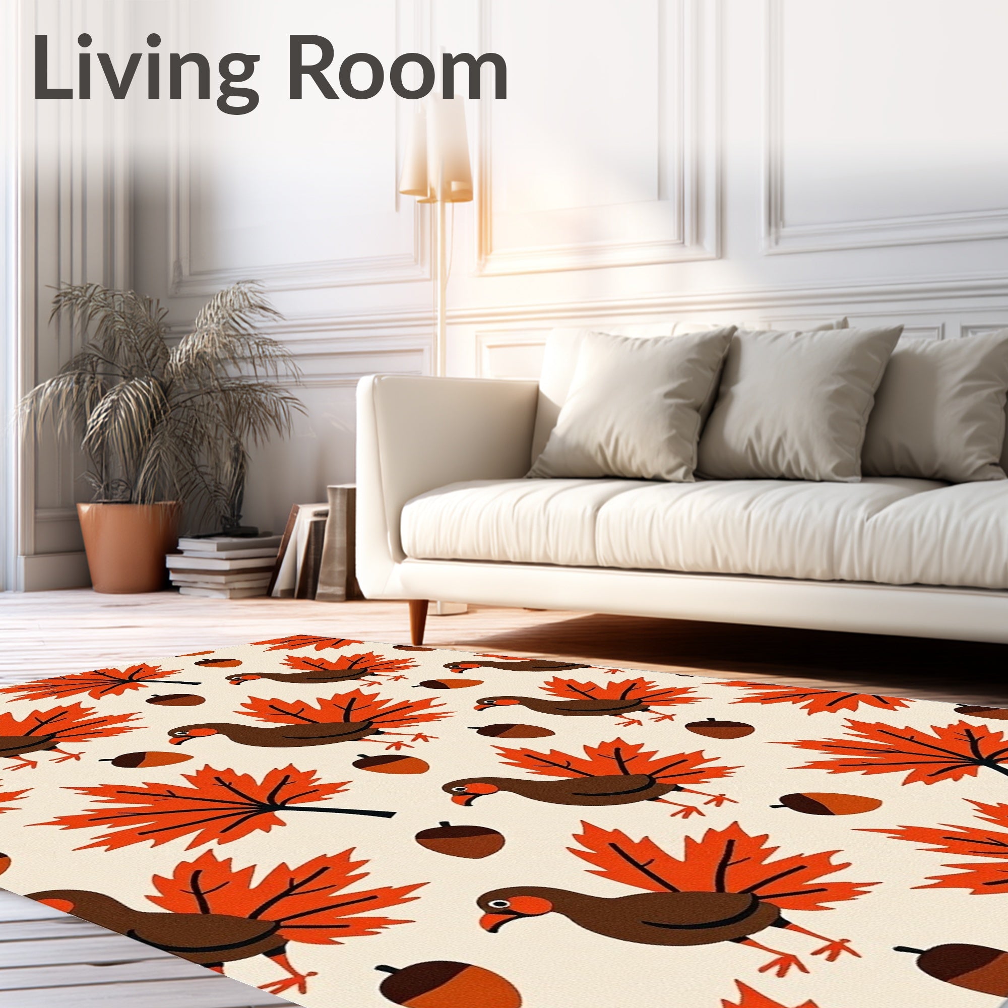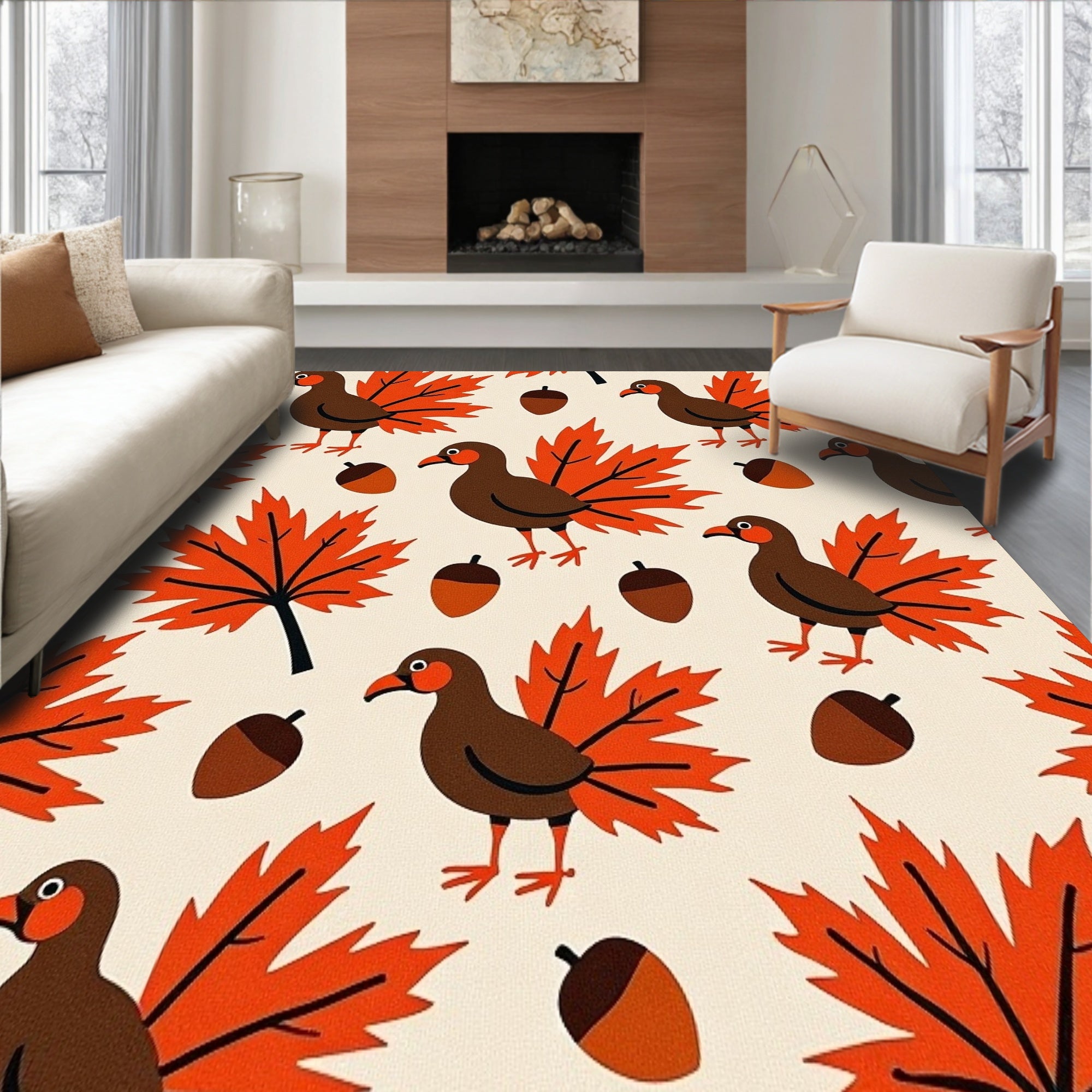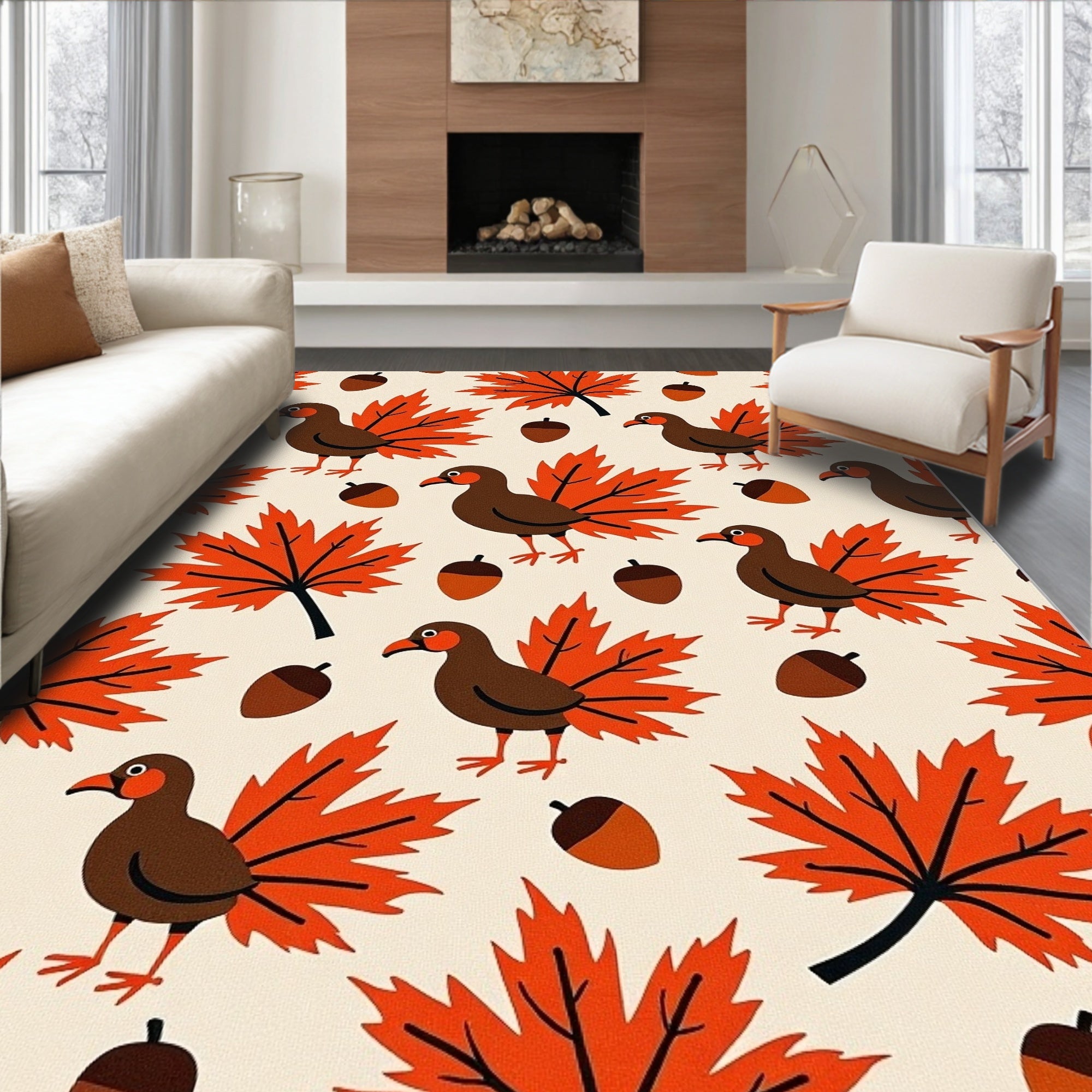Ultra Soft Area Rug, Non Slip, Stain Resistant, Washable Area Rugs for Living Room, Bedroom, Harvest Feast Birds Motif with Maple Leaves and Acorns(Beige) Overview: