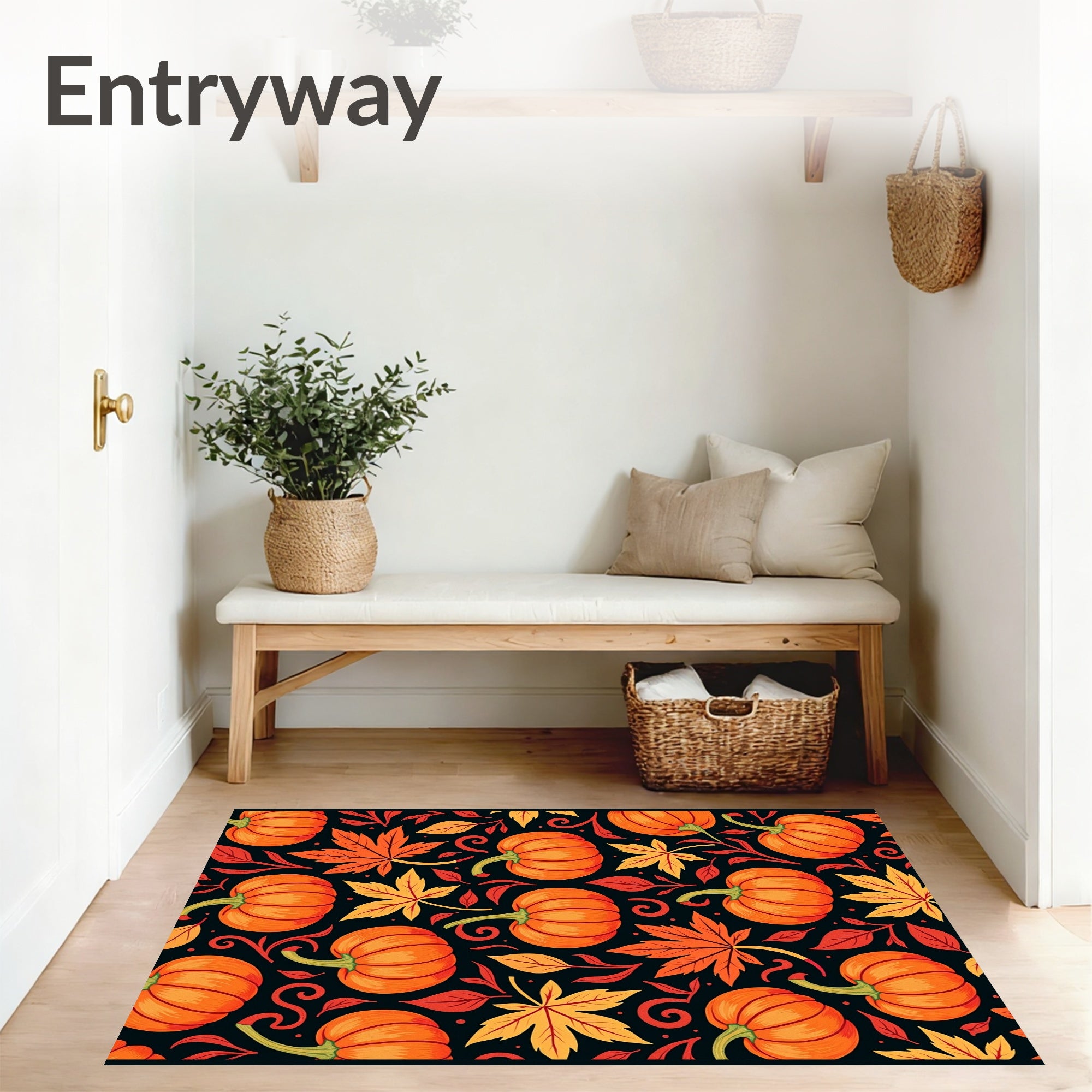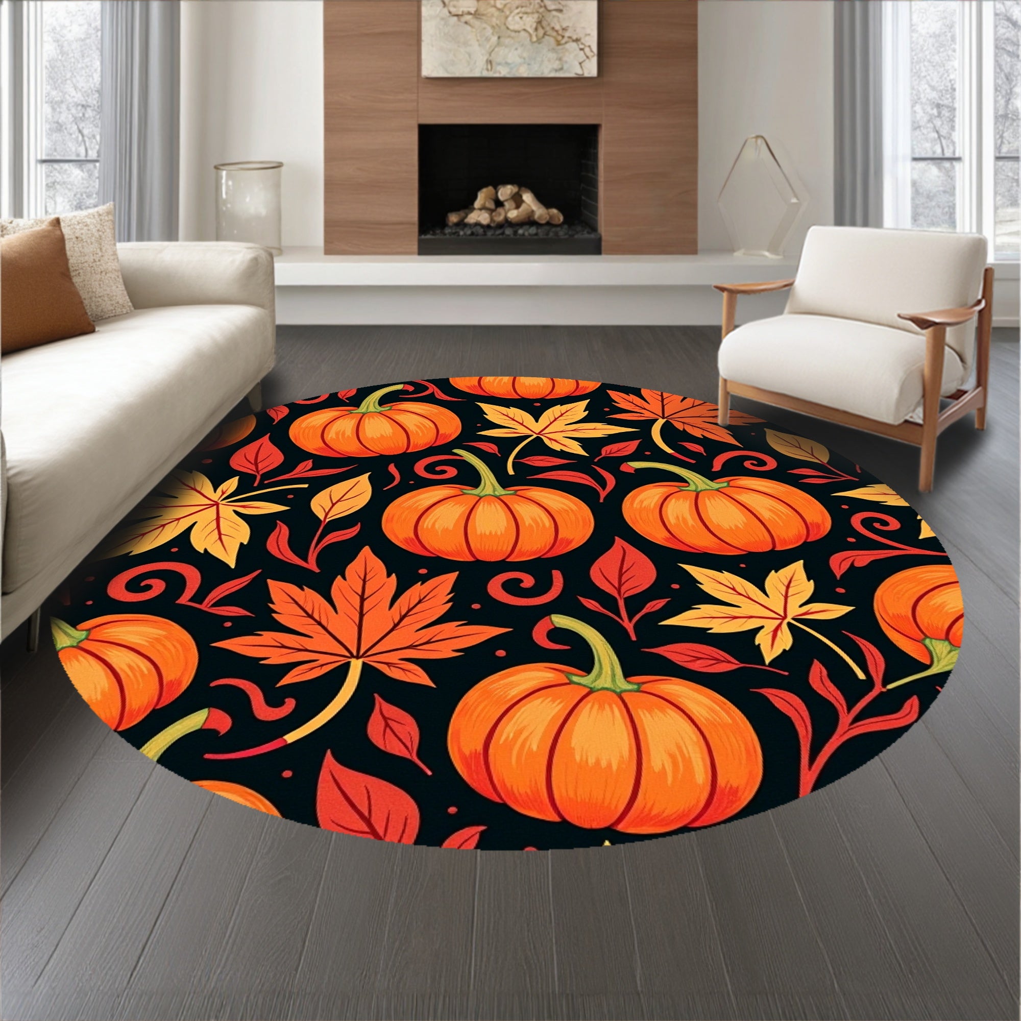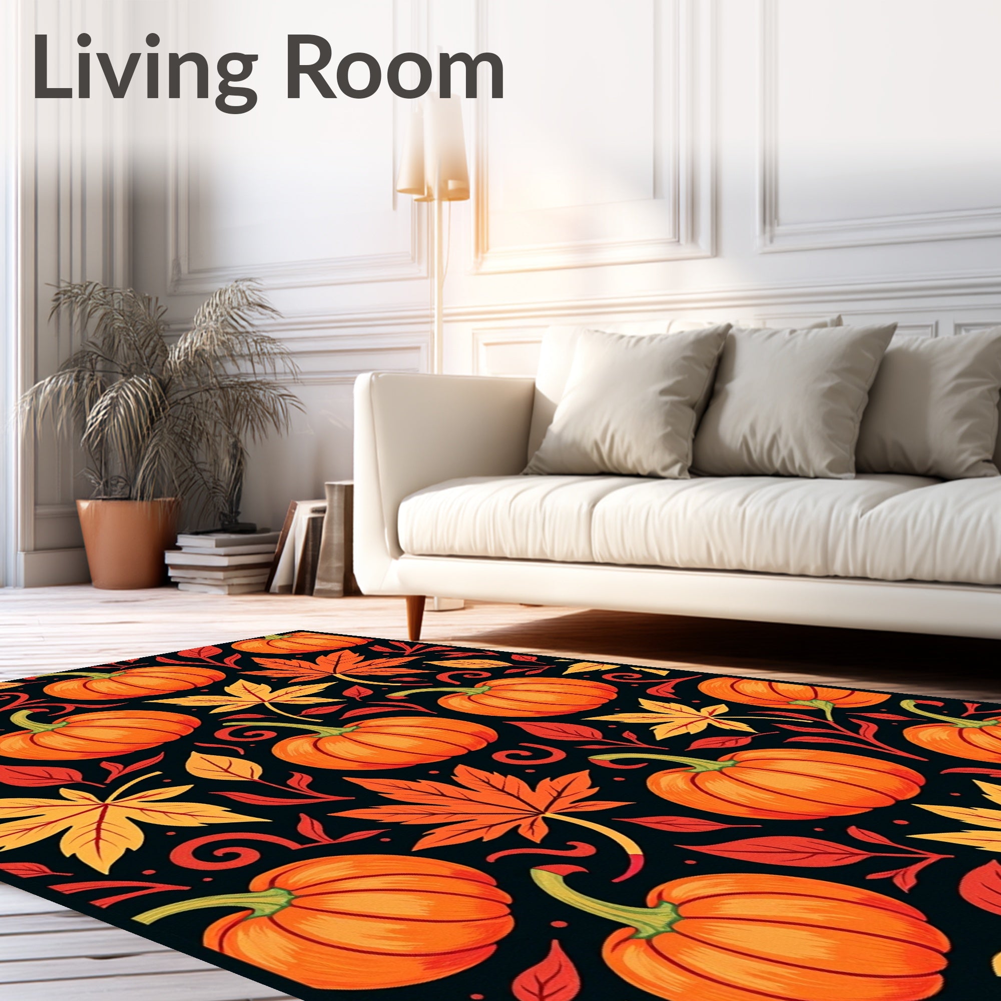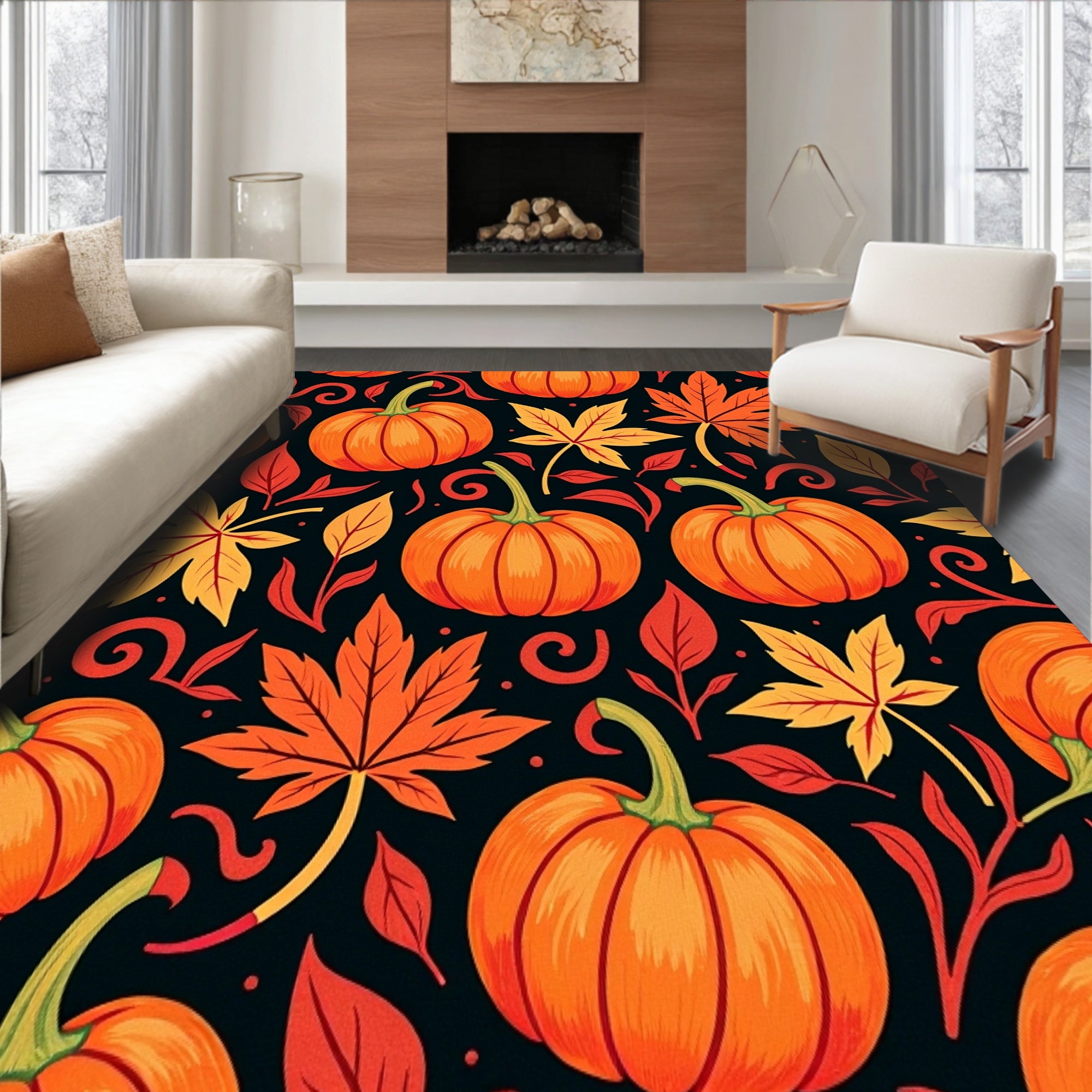 Ultra Soft Area Rug, Non Slip, Stain Resistant, Washable Area Rugs for Living Room, Bedroom, Harvest Festival Maple Foliage Pumpkin Arrangement Decorative Accent(Orange) Overview: