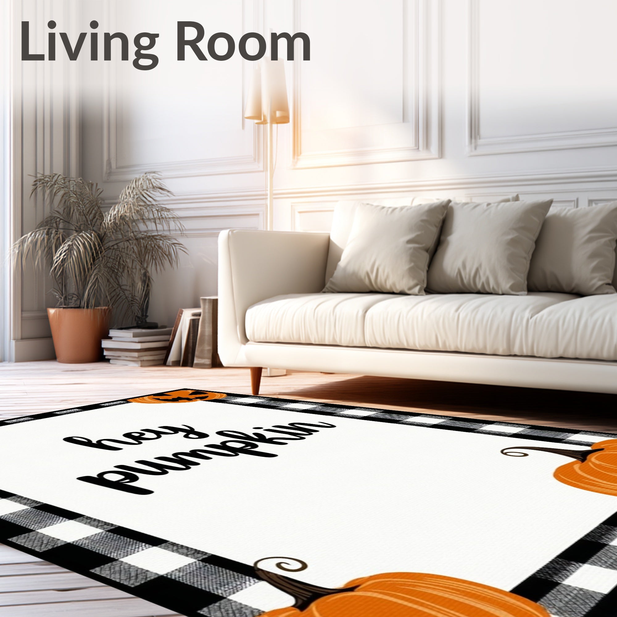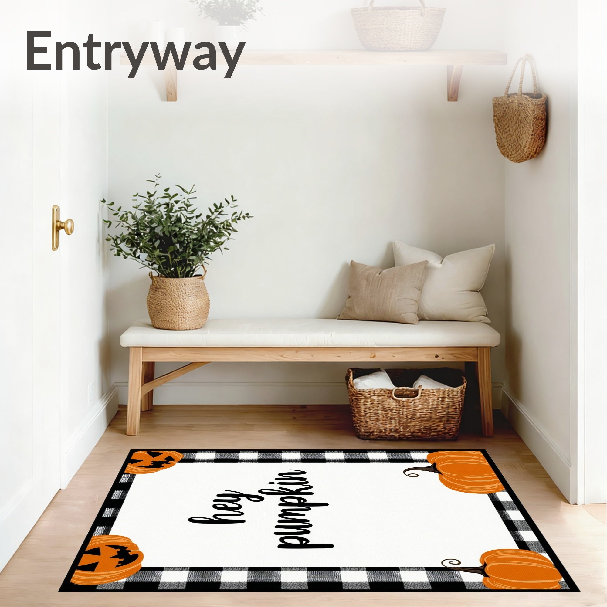 Ultra Soft Area Rug, Non Slip, Stain Resistant, Washable Area Rugs for Living Room, Bedroom, Hey Pumpkin Area Rug Thanksgiving Plaid Entrance Decor(Black) Overview: