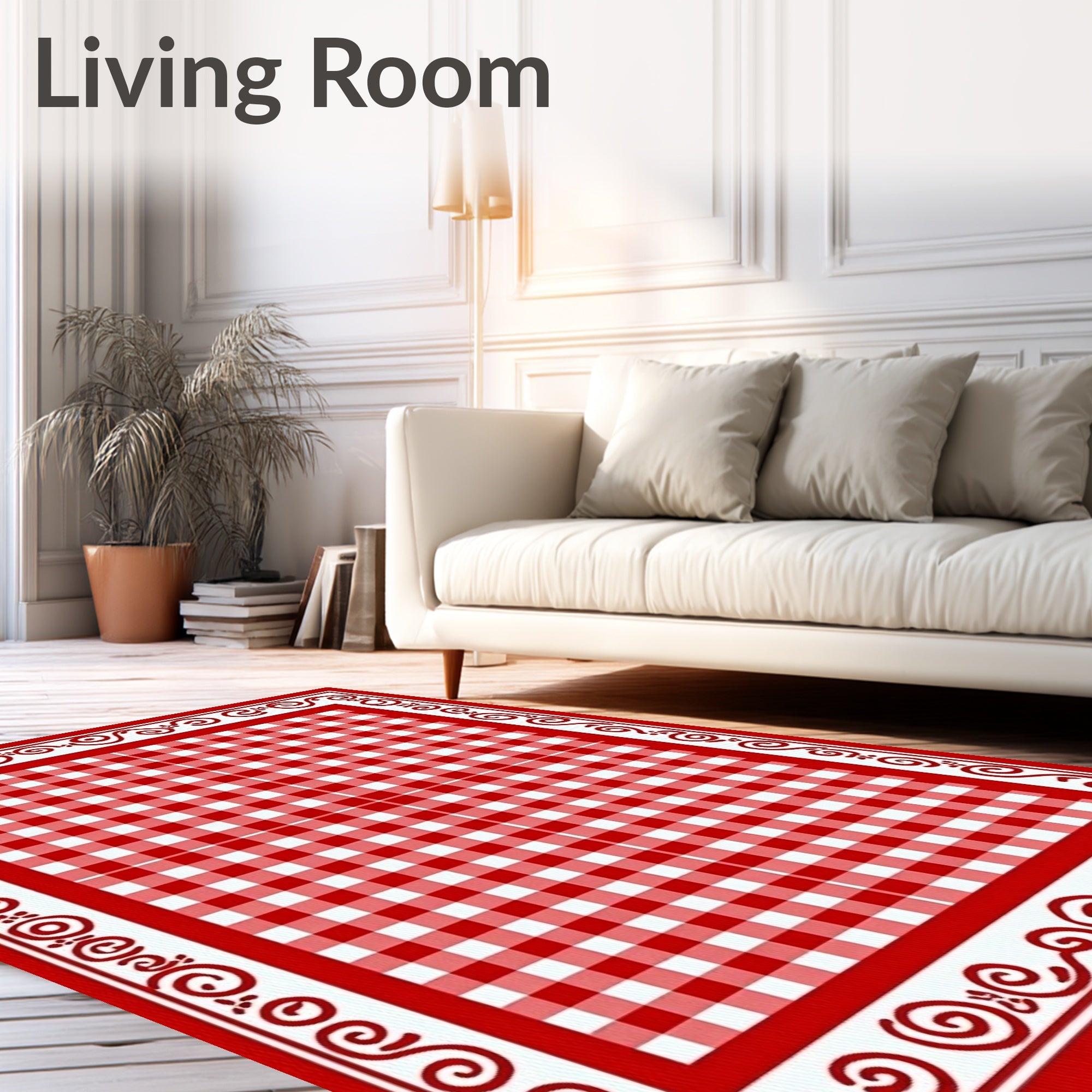 Ultra Soft Area Rug, Non Slip, Stain Resistant, Washable Area Rugs for Living Room, Bedroom, High Traffic Buffalo Check with Cane Stripe Accent Borders(Red) Overview: