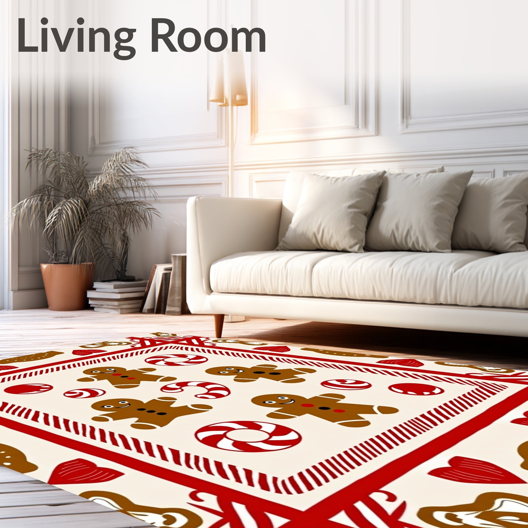 Ultra Soft Area Rug, Non Slip, Stain Resistant, Washable Area Rugs for Living Room, Bedroom, Holiday Motif Featuring Gingerbread Figures and Stripes(Red) Overview: