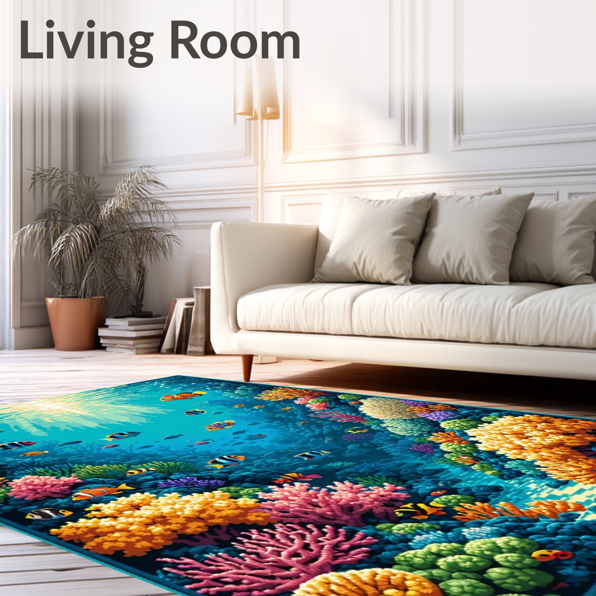 Flatwoven High Traffic Area Rug, Illusion Ocean Vibrant Coral Reef, Non Slip, Stain Resistant, Washable Area Rugs for Living Room, Bedroom (Blue) Overview: