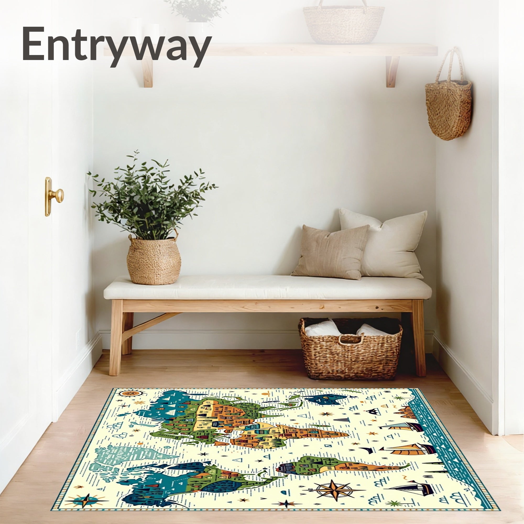 Ultra Soft Area Rug, Non Slip, Stain Resistant, Washable Area Rugs for Living Room, Bedroom, Interactive Global Explorer Play Circle with Continents for Classroom(Green) Overview: