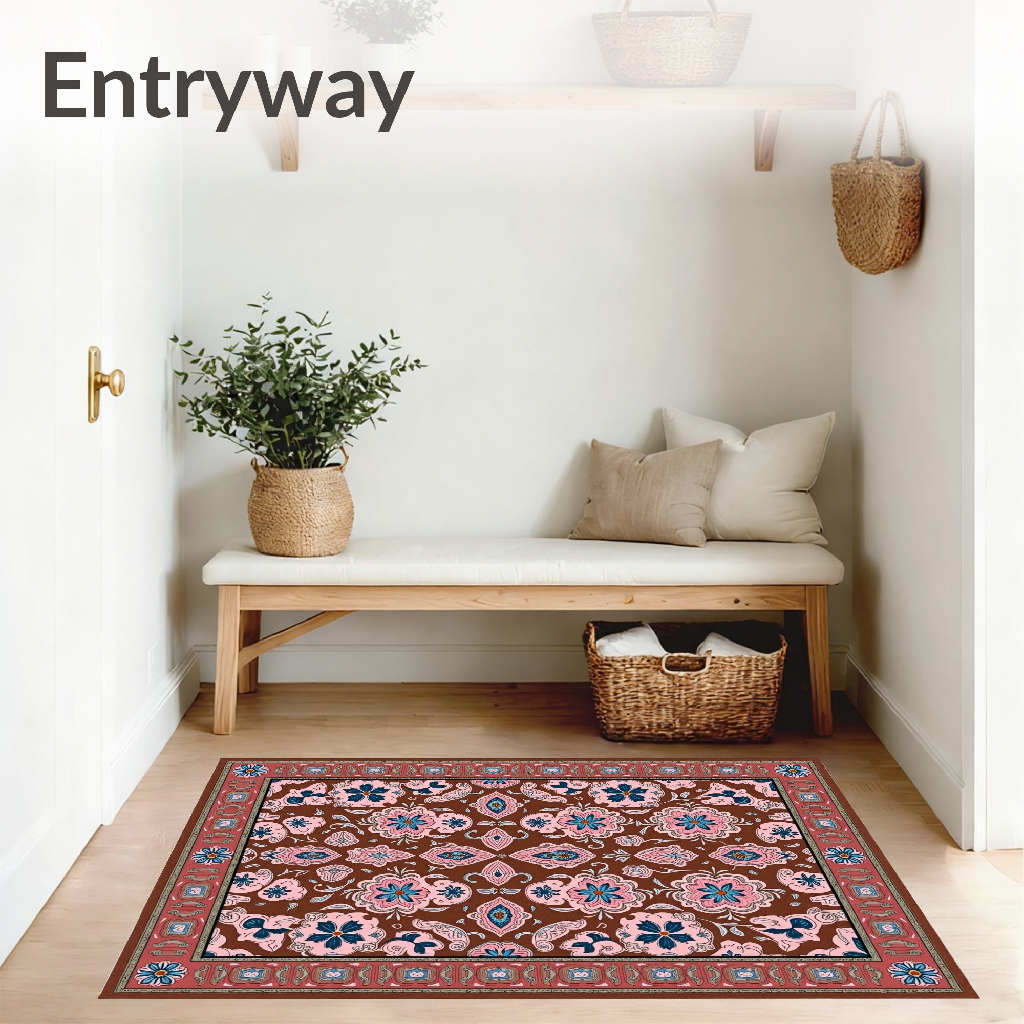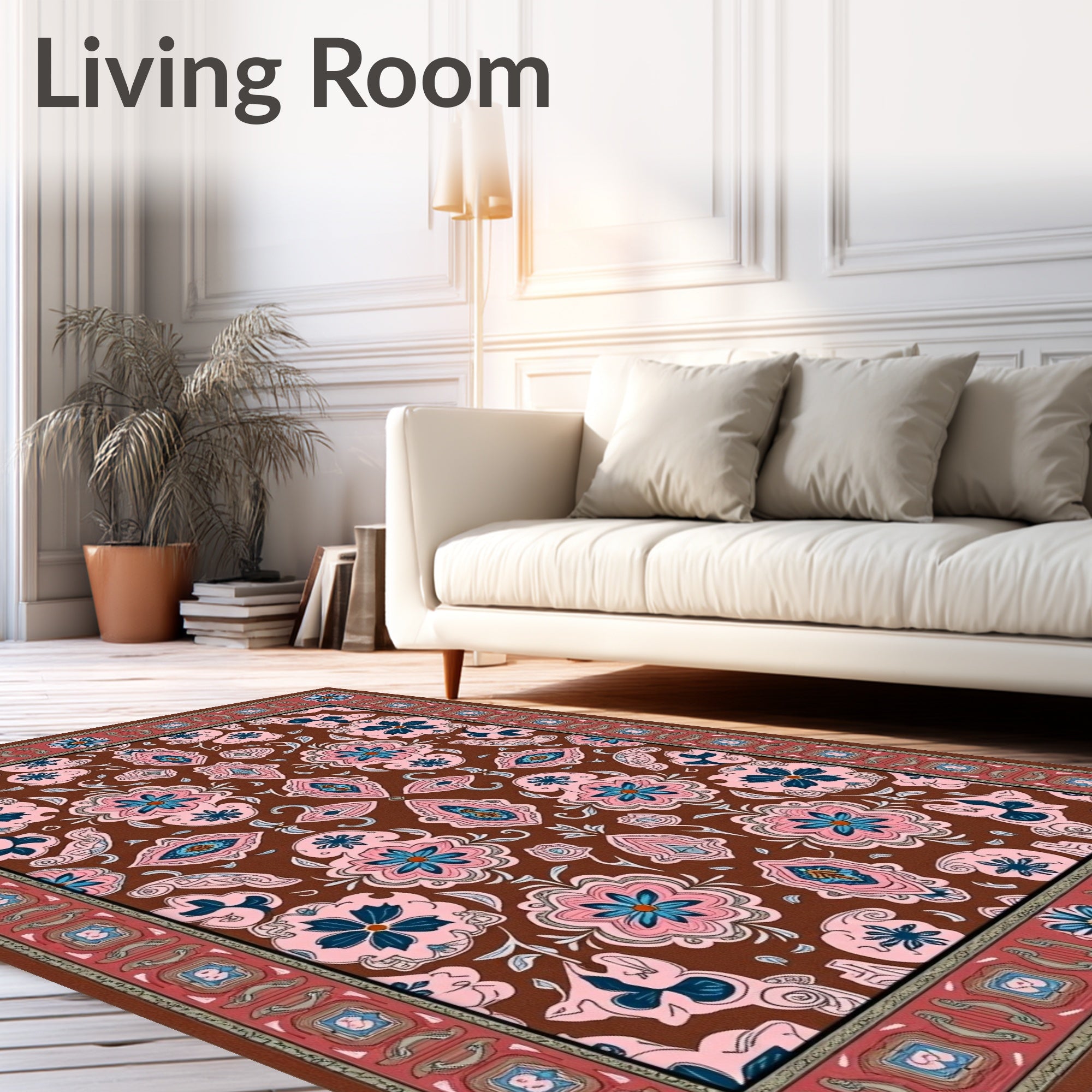 Flatwoven High Traffic Area Rug, Interlocking Floral Motifs With Blush Pink And Deep Contrast, Non Slip, Stain Resistant, Washable Area Rugs for Living Room, Bedroom (Brown) Overview:
