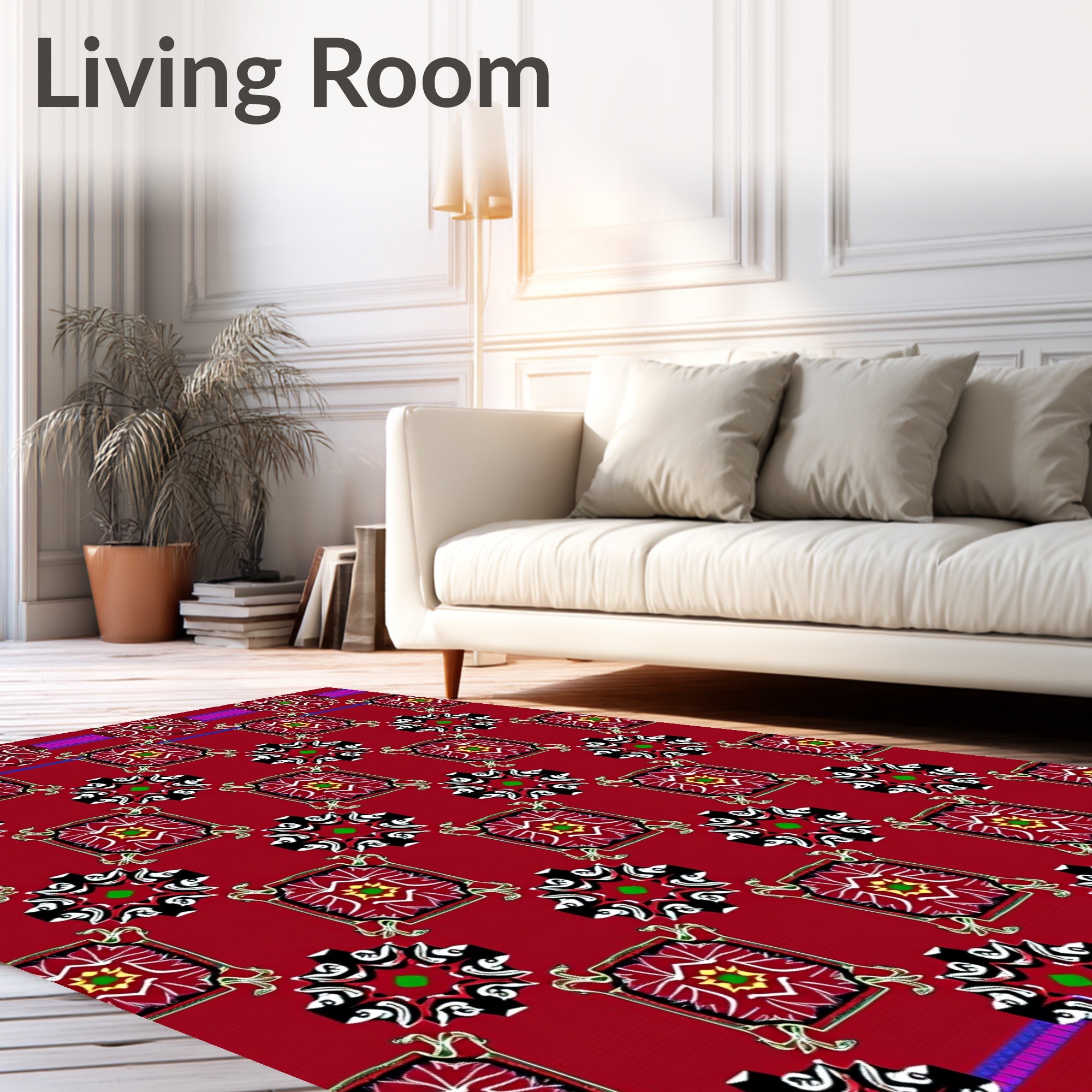 Ultra Soft Area Rug, Non Slip, Stain Resistant, Washable Area Rugs for Living Room, Bedroom, Interlocking Mosaic with Festive Starburst Accents(Red) Overview: