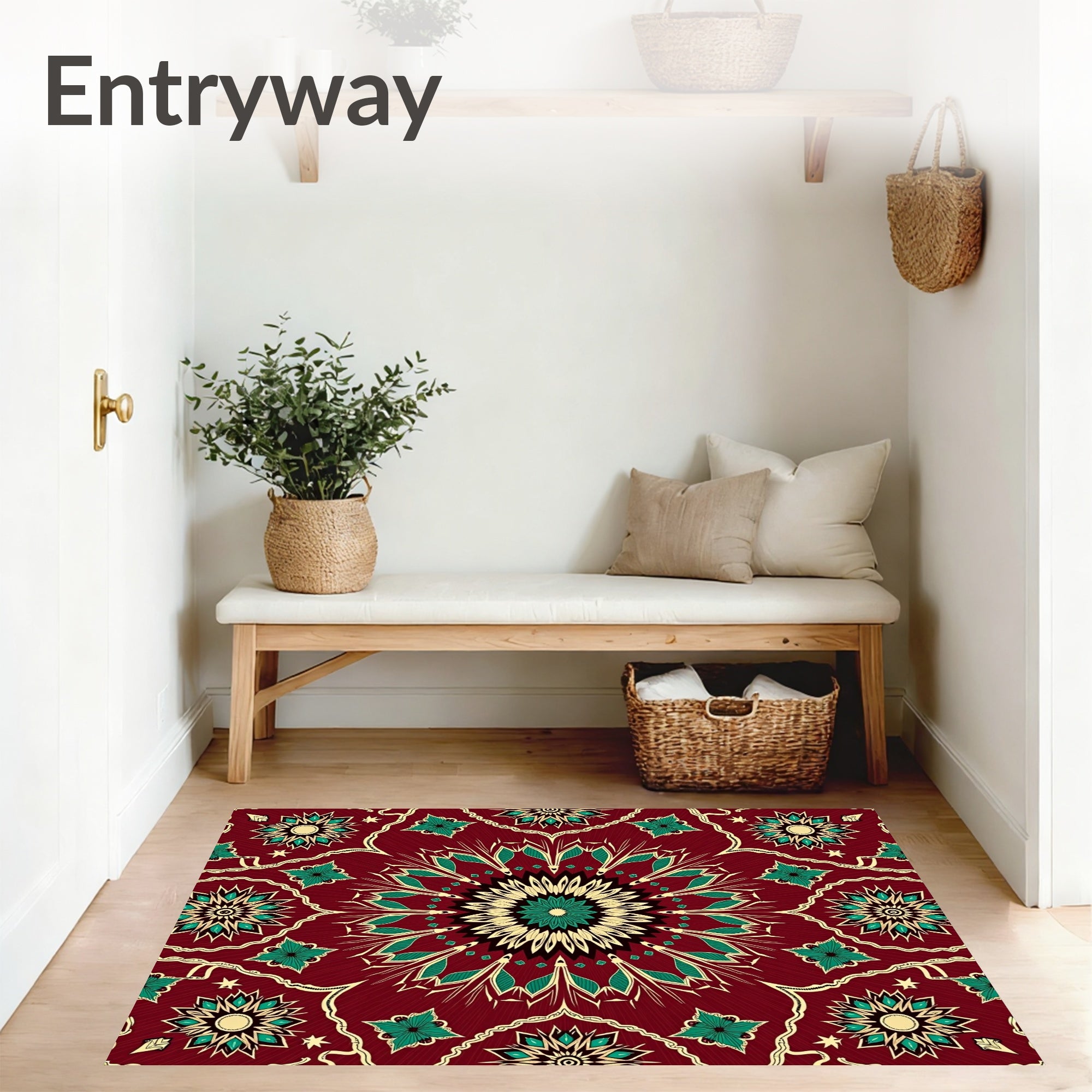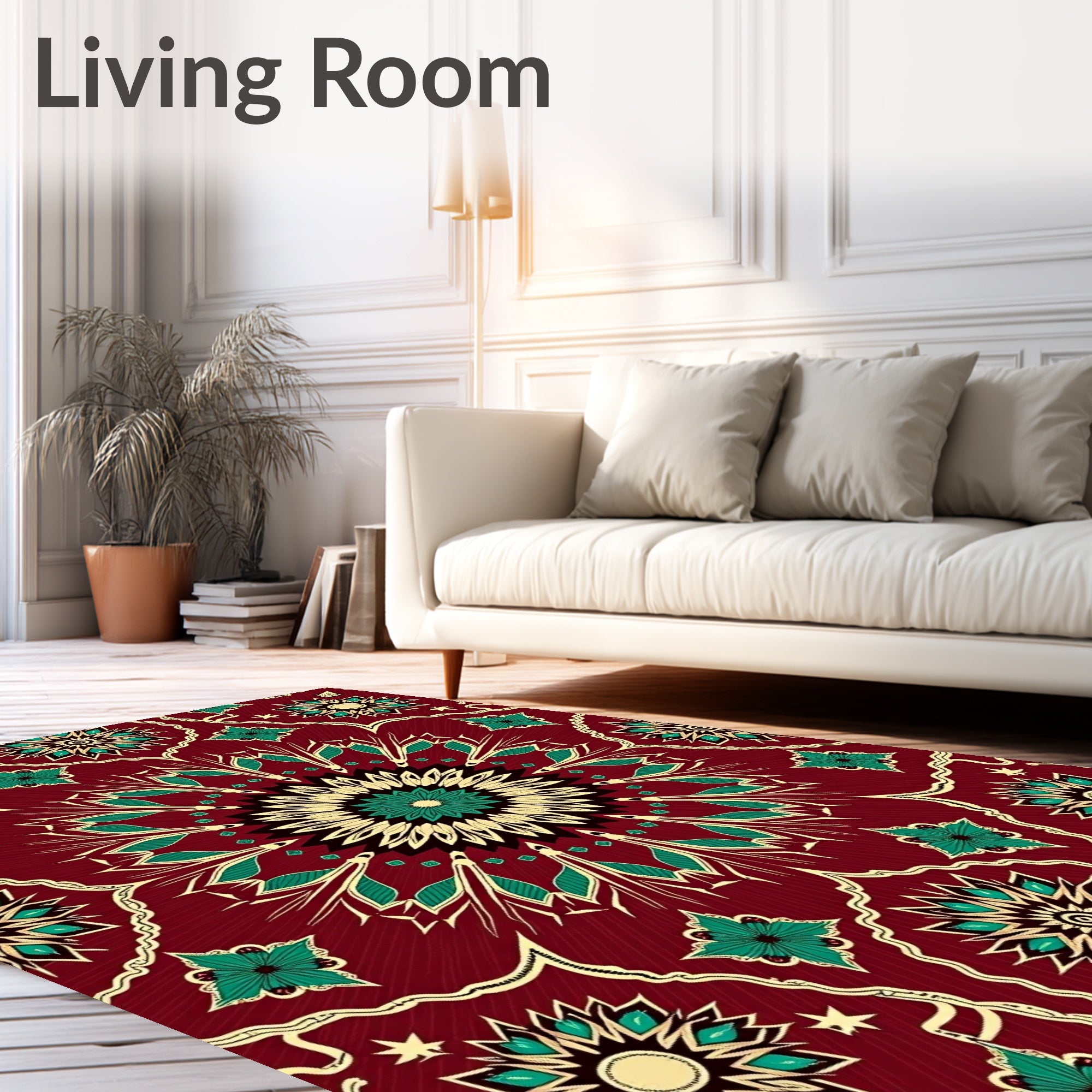 Ultra Soft Area Rug, Non Slip, Stain Resistant, Washable Area Rugs for Living Room, Bedroom, Interlocking Starburst with Festive Symmetry and Elegant Accents(Maroon) Overview: