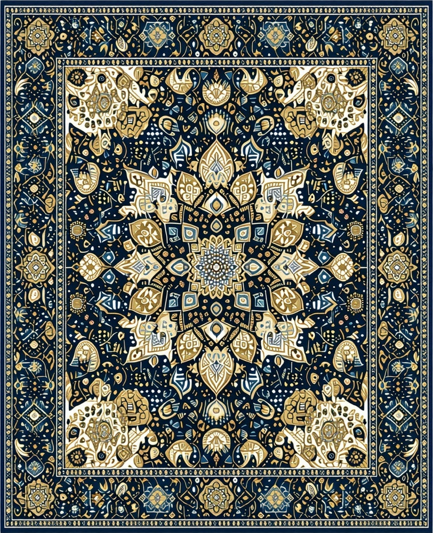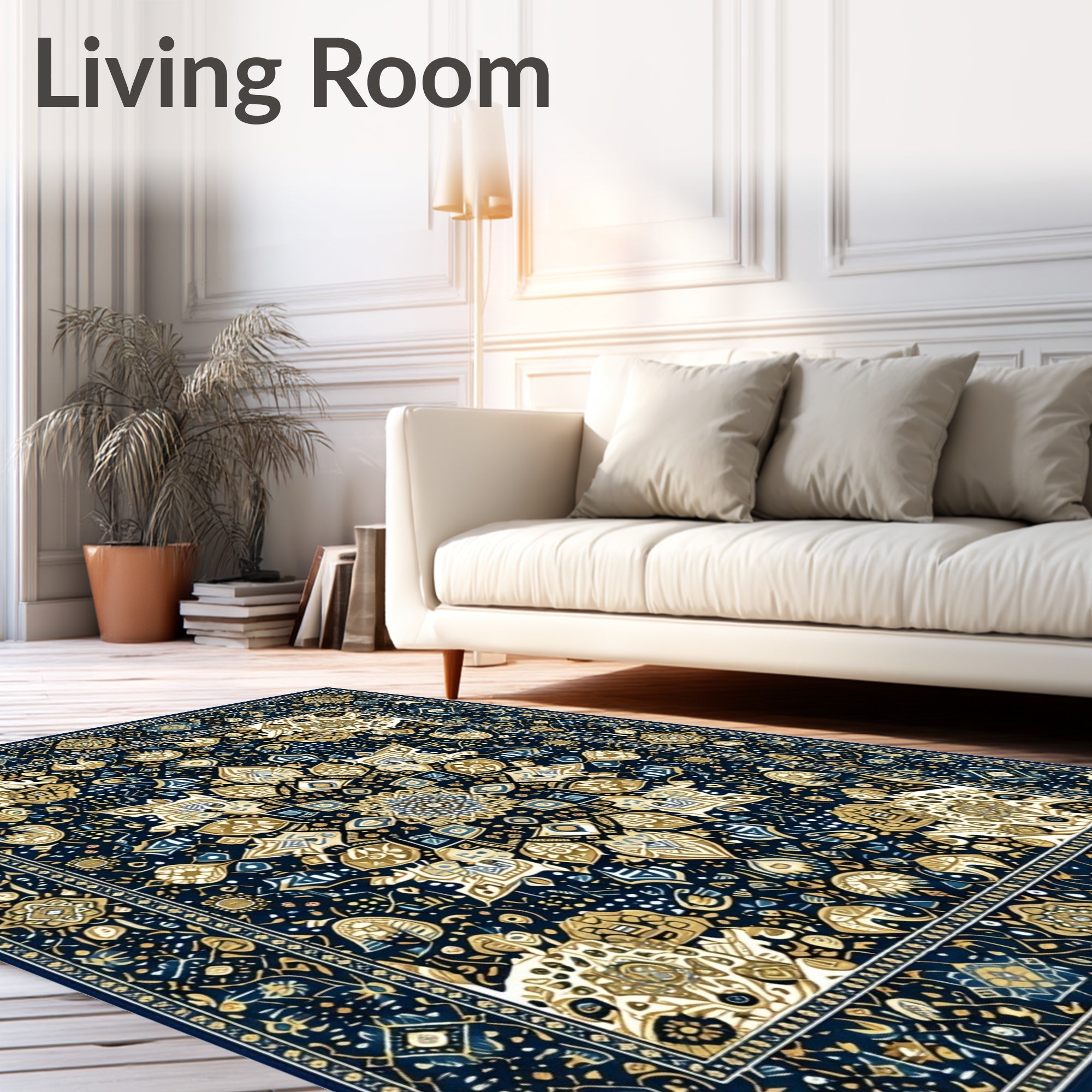 Ultra Soft Area Rug, Non Slip, Stain Resistant, Washable Area Rugs for Living Room, Bedroom, Intricate Design Non Shedding Beige and Gold(Blue) Overview: