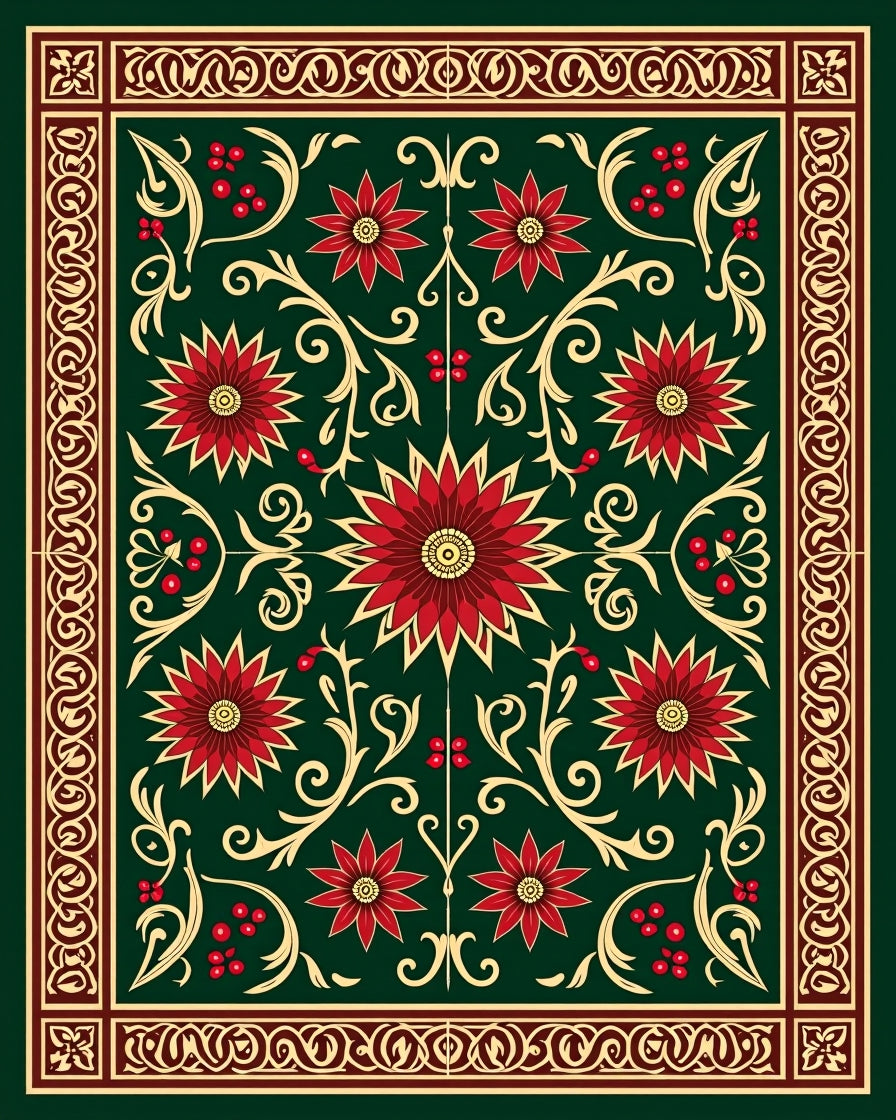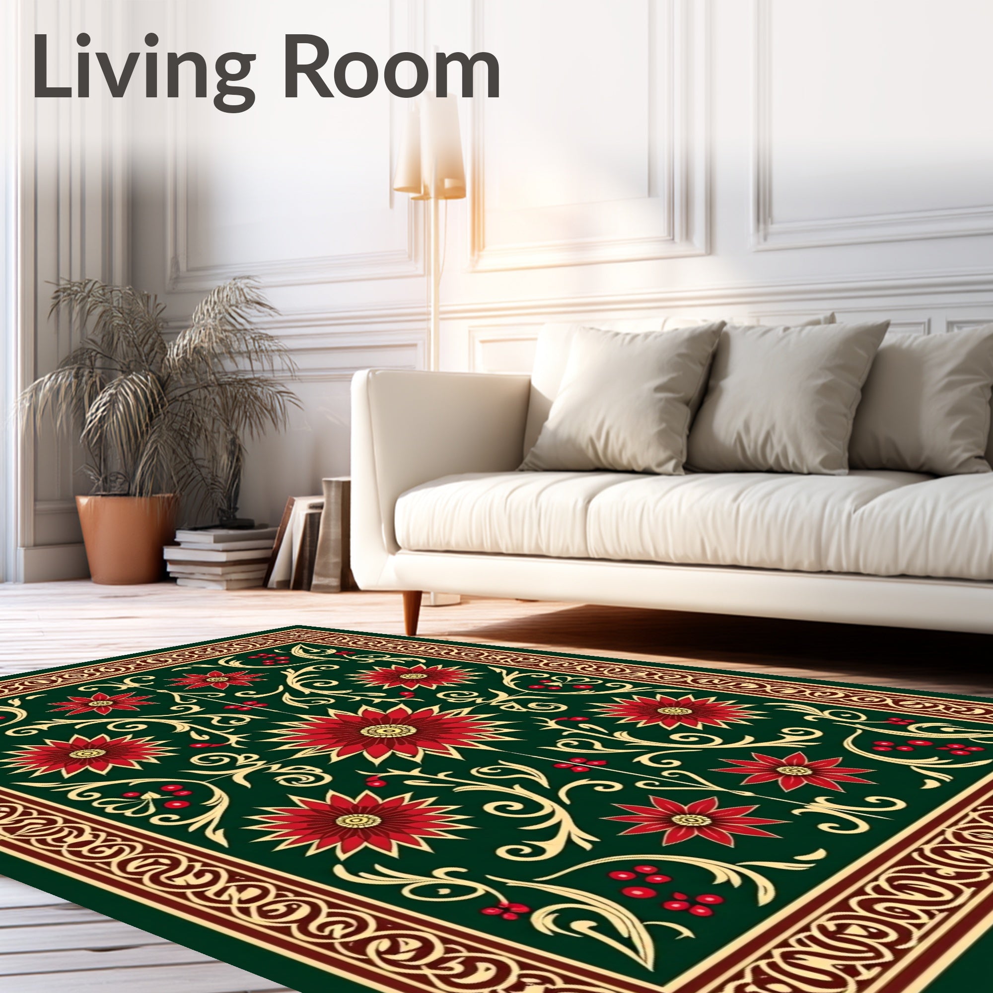 Ultra Soft Area Rug, Non Slip, Stain Resistant, Washable Area Rugs for Living Room, Bedroom, Jolly Poinsettia Scrollwork Baroque Floral with Berry Embellishments(Green) Overview: