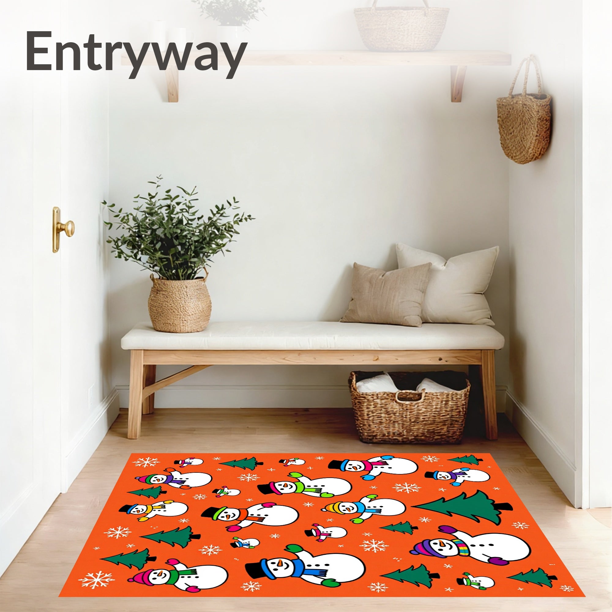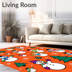 Flatwoven High Traffic Area Rug, Jolly Snowman Family Scene Holiday with Pine Tree Accents, Non Slip, Stain Resistant, Washable Area Rugs for Living Room, Bedroom (Orange) Overview: