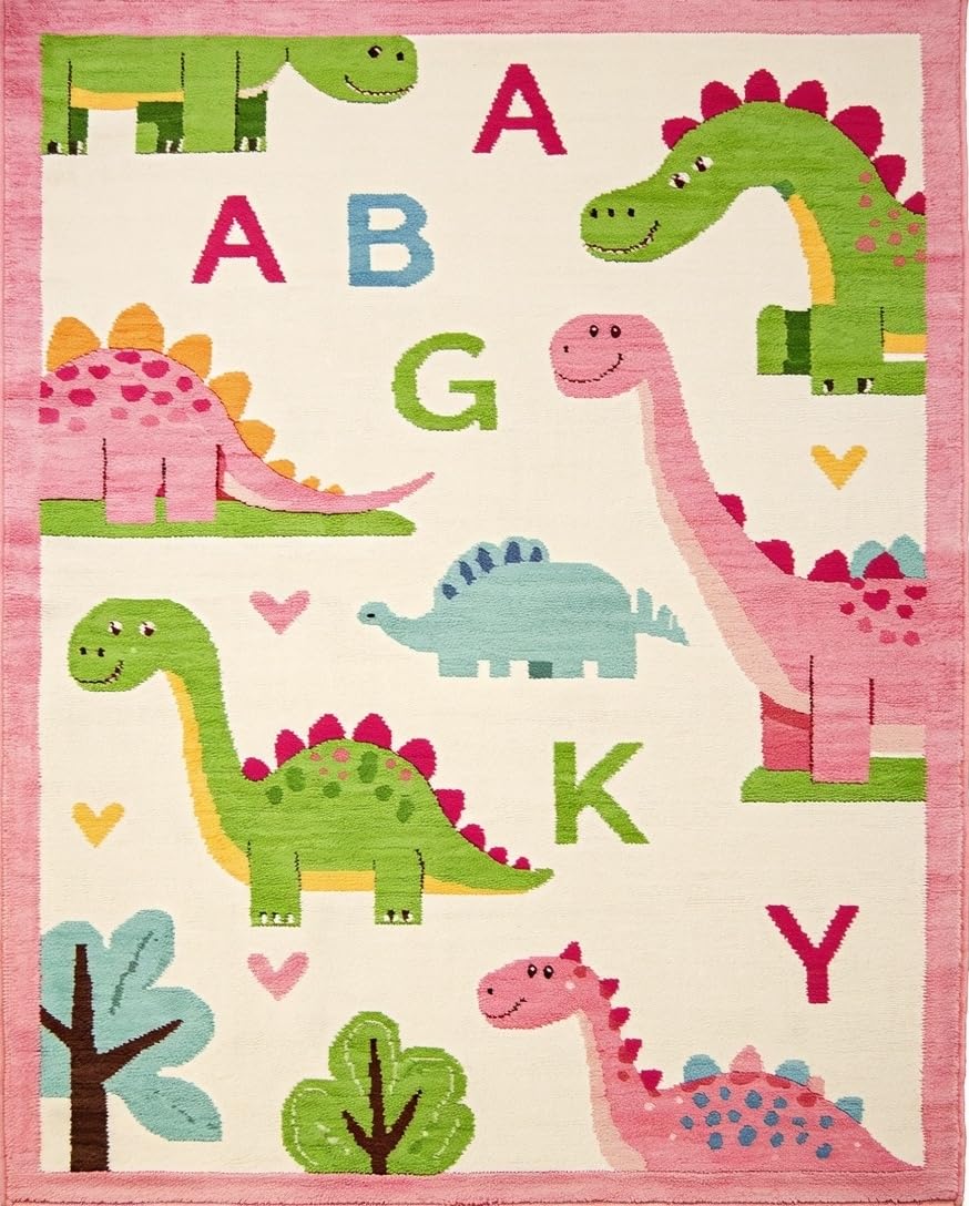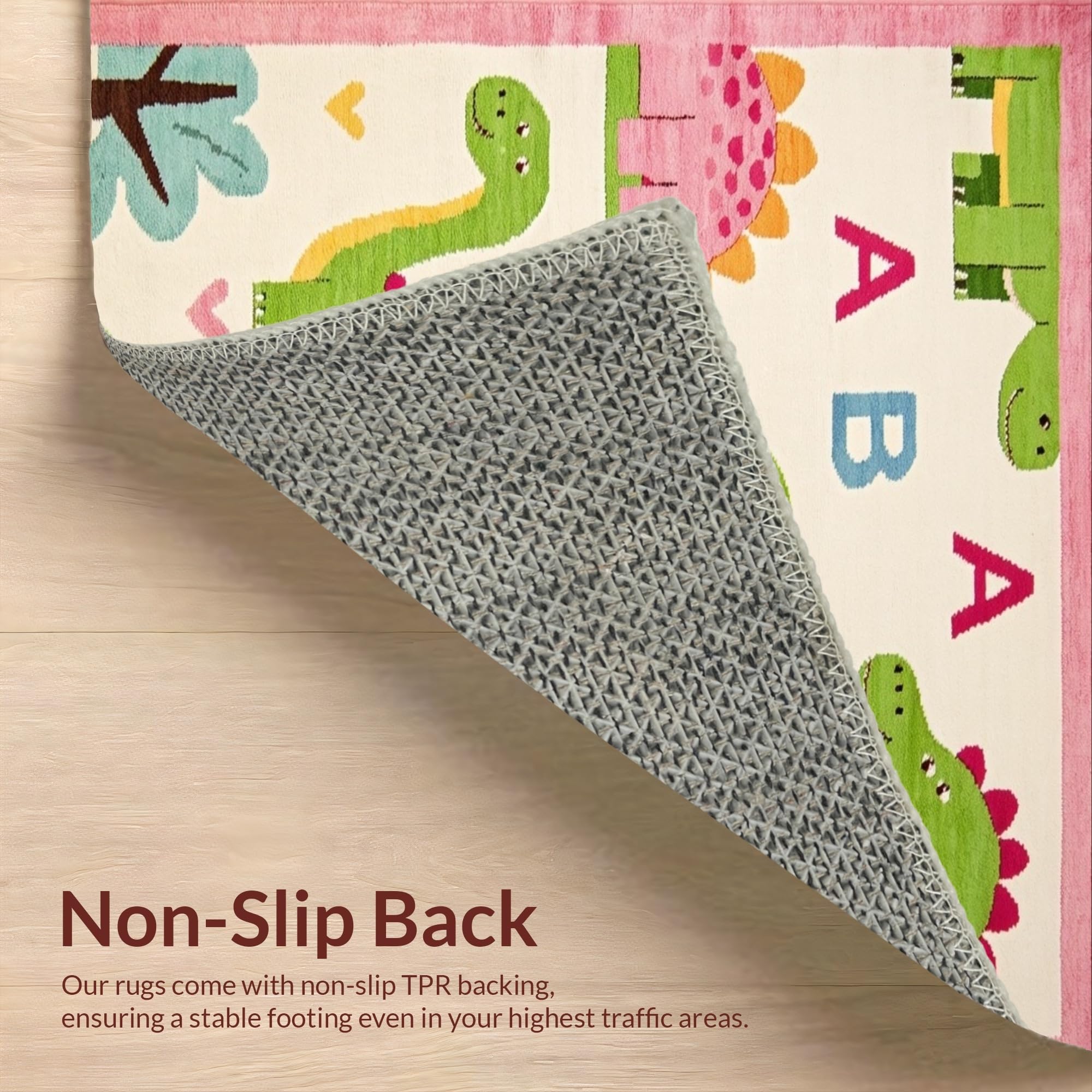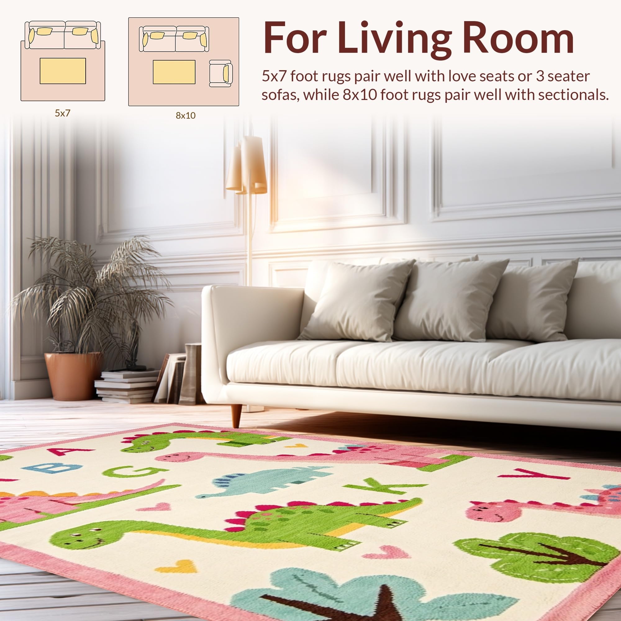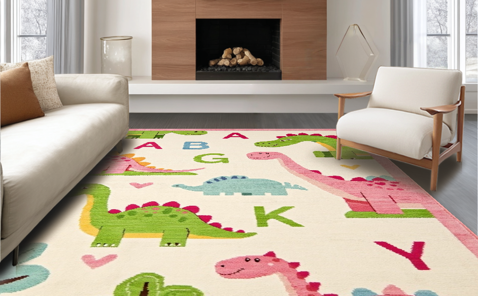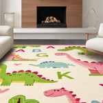 Ultra Soft Area Rug, Non Slip, Stain Resistant, Washable Area Rugs for Living Room, Bedroom, Lively Cartoonish Dino Character Layout(Pink) Overview: