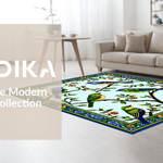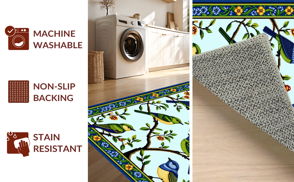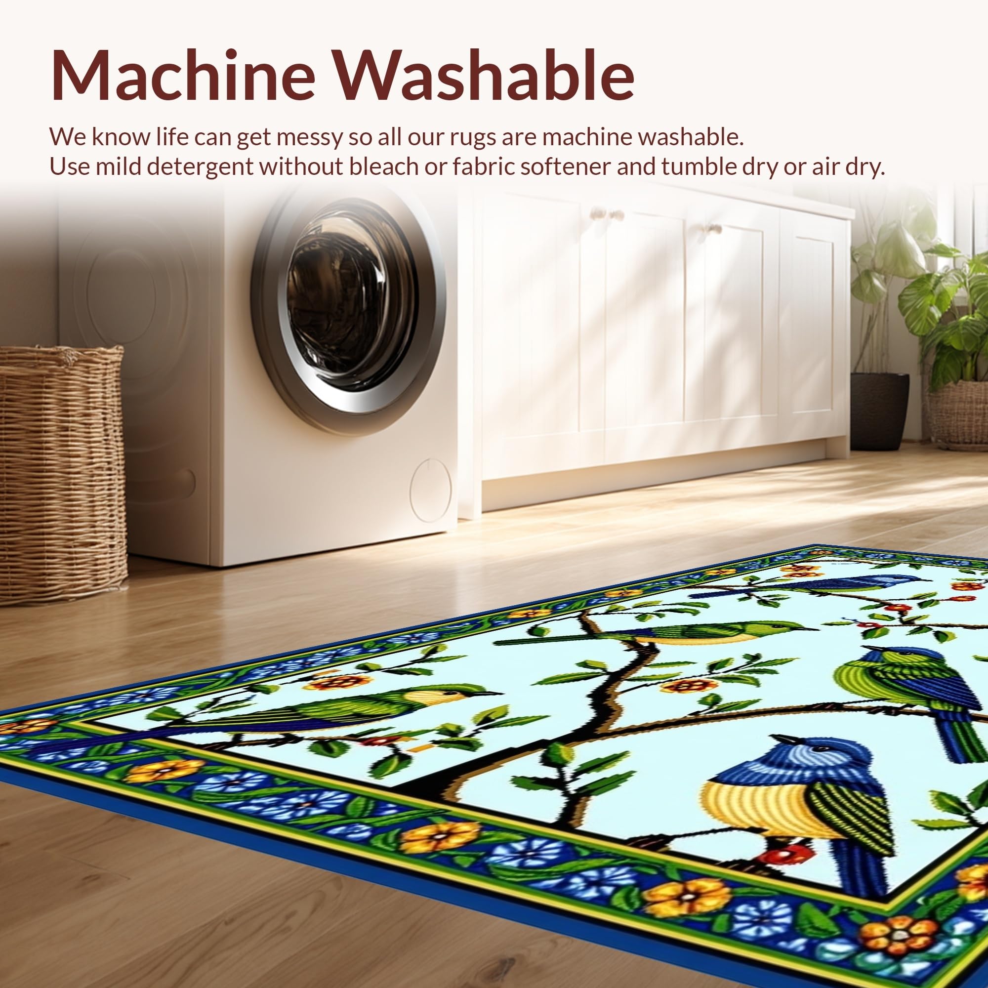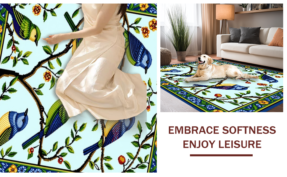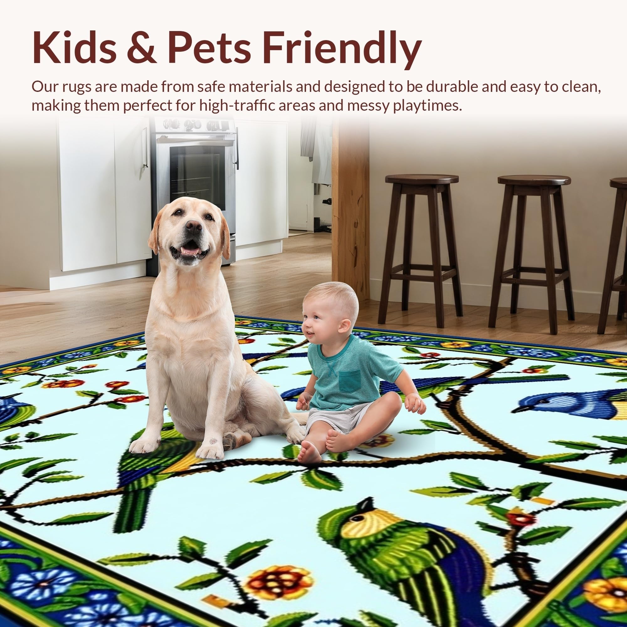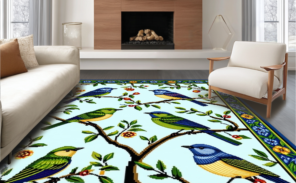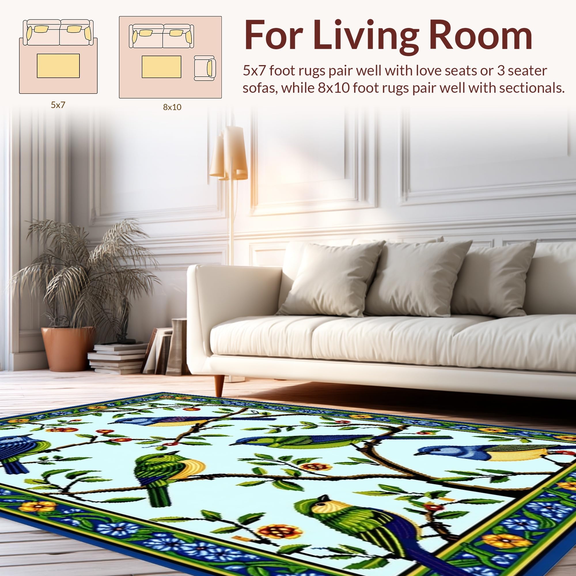 Ultra Soft Area Rug, Non Slip, Stain Resistant, Washable Area Rugs for Living Room, Bedroom, Lively Ornate Bird and Branch Ensemble(Blue) Overview: