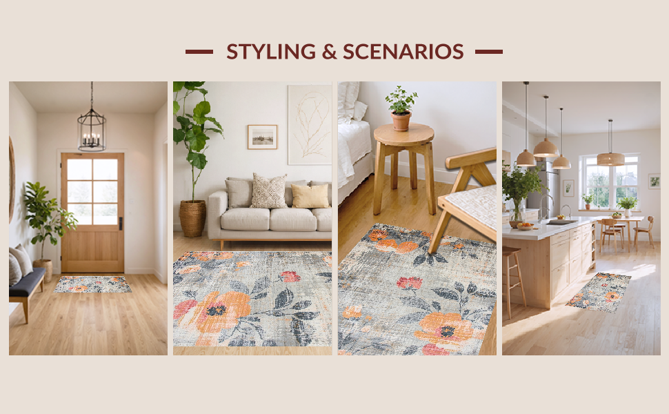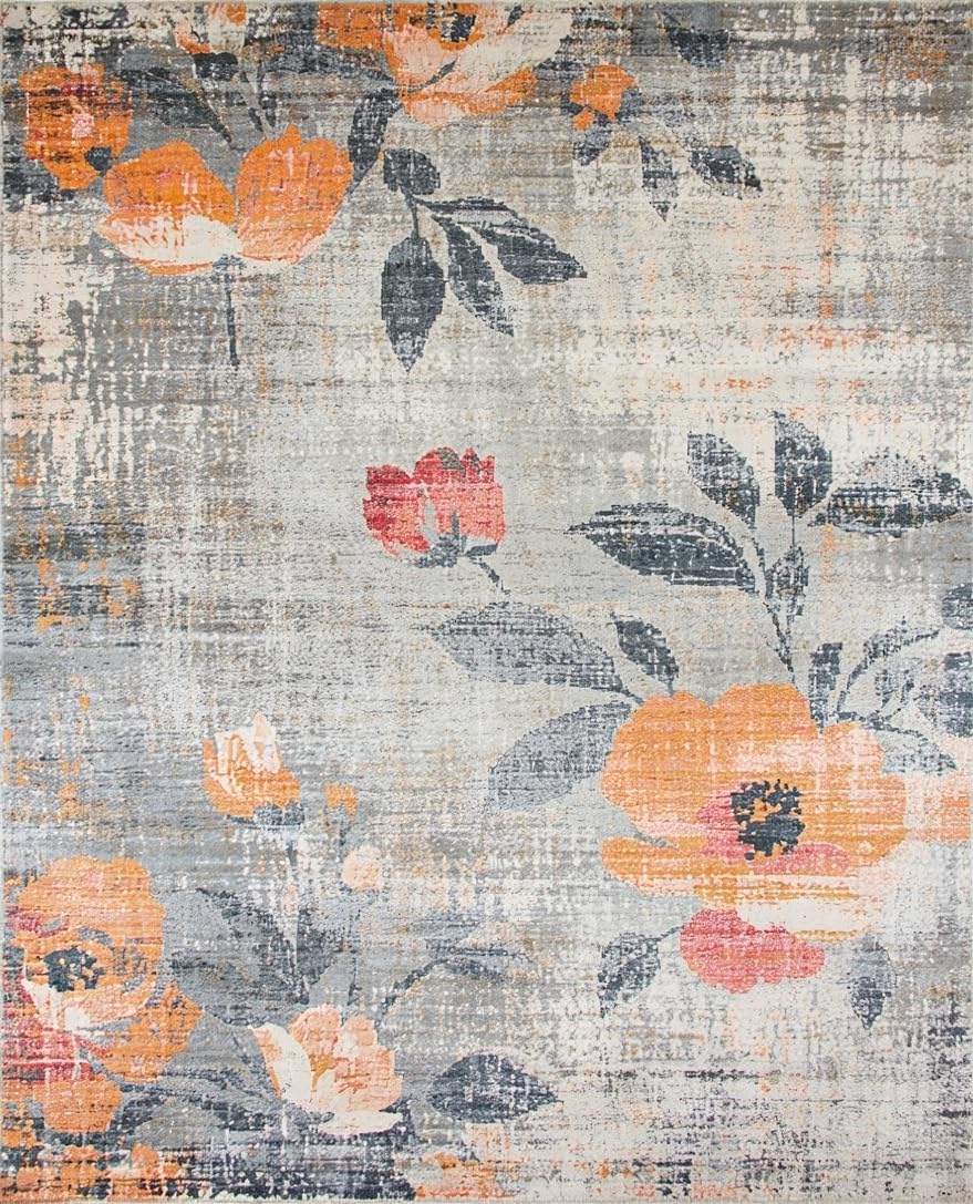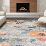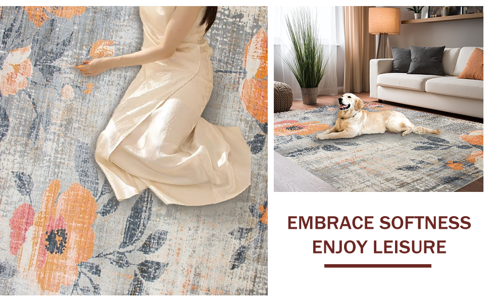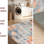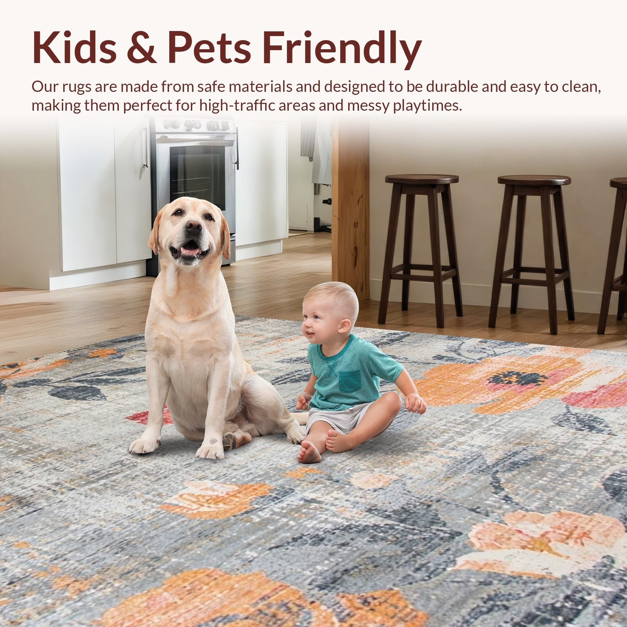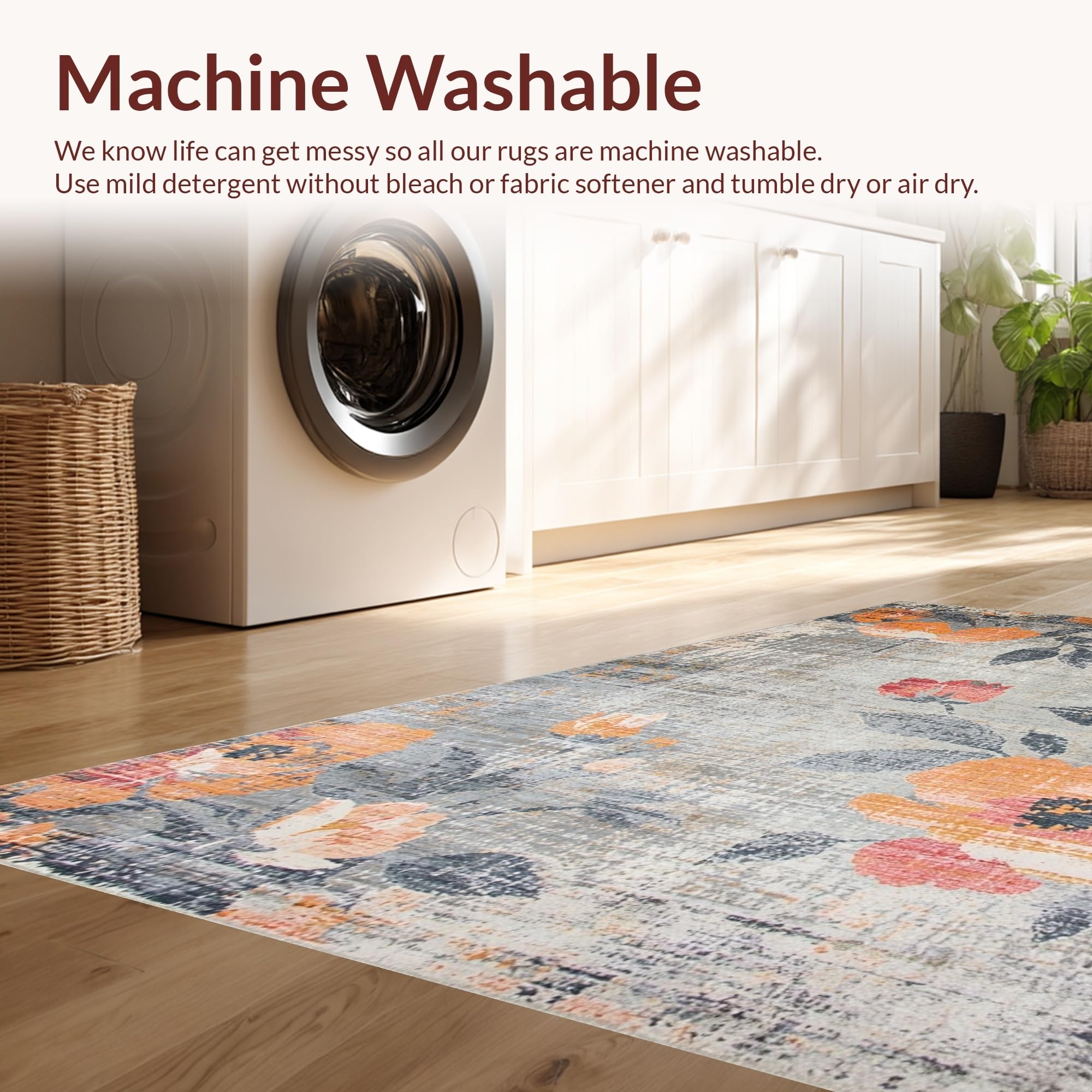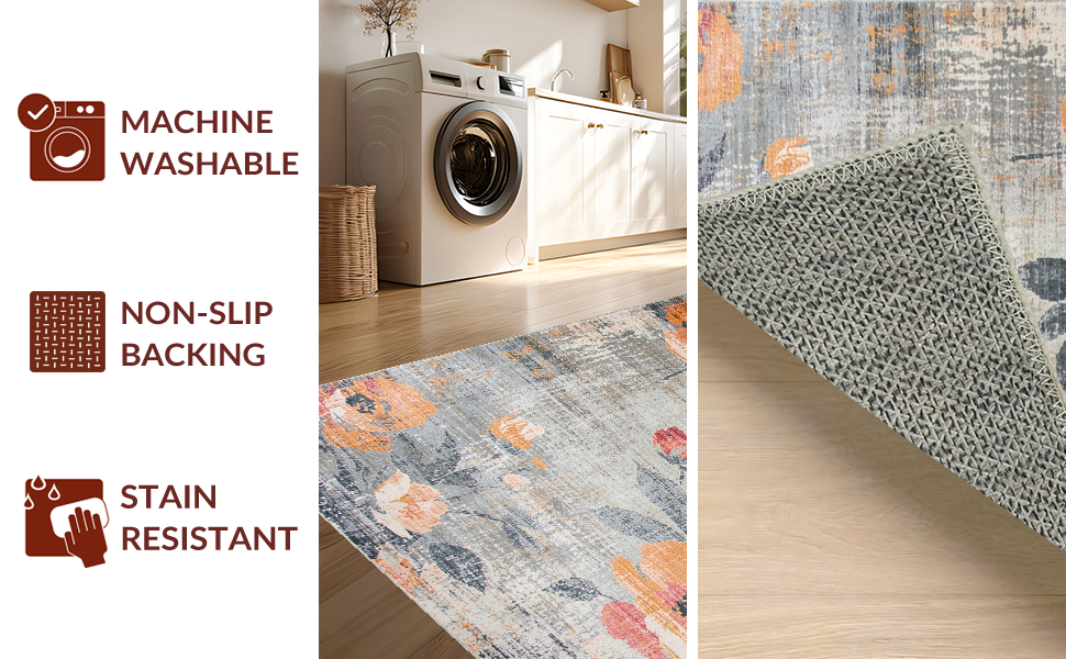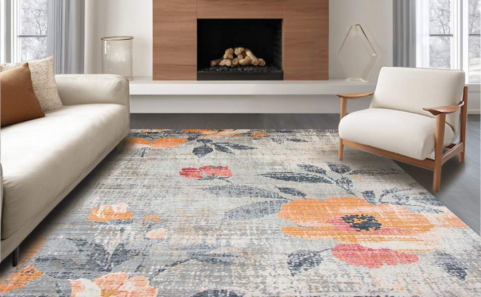Ultra Soft Area Rug, Non Slip, Stain Resistant, Washable Area Rugs for Living Room, Bedroom, Lush Gray Orange Botanical Print(Gray) Overview: